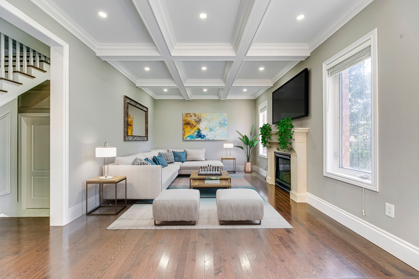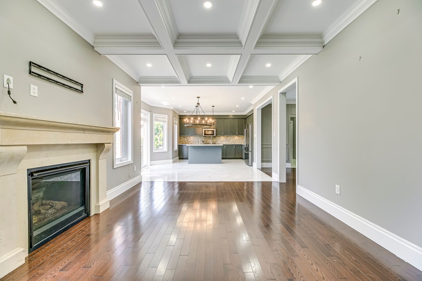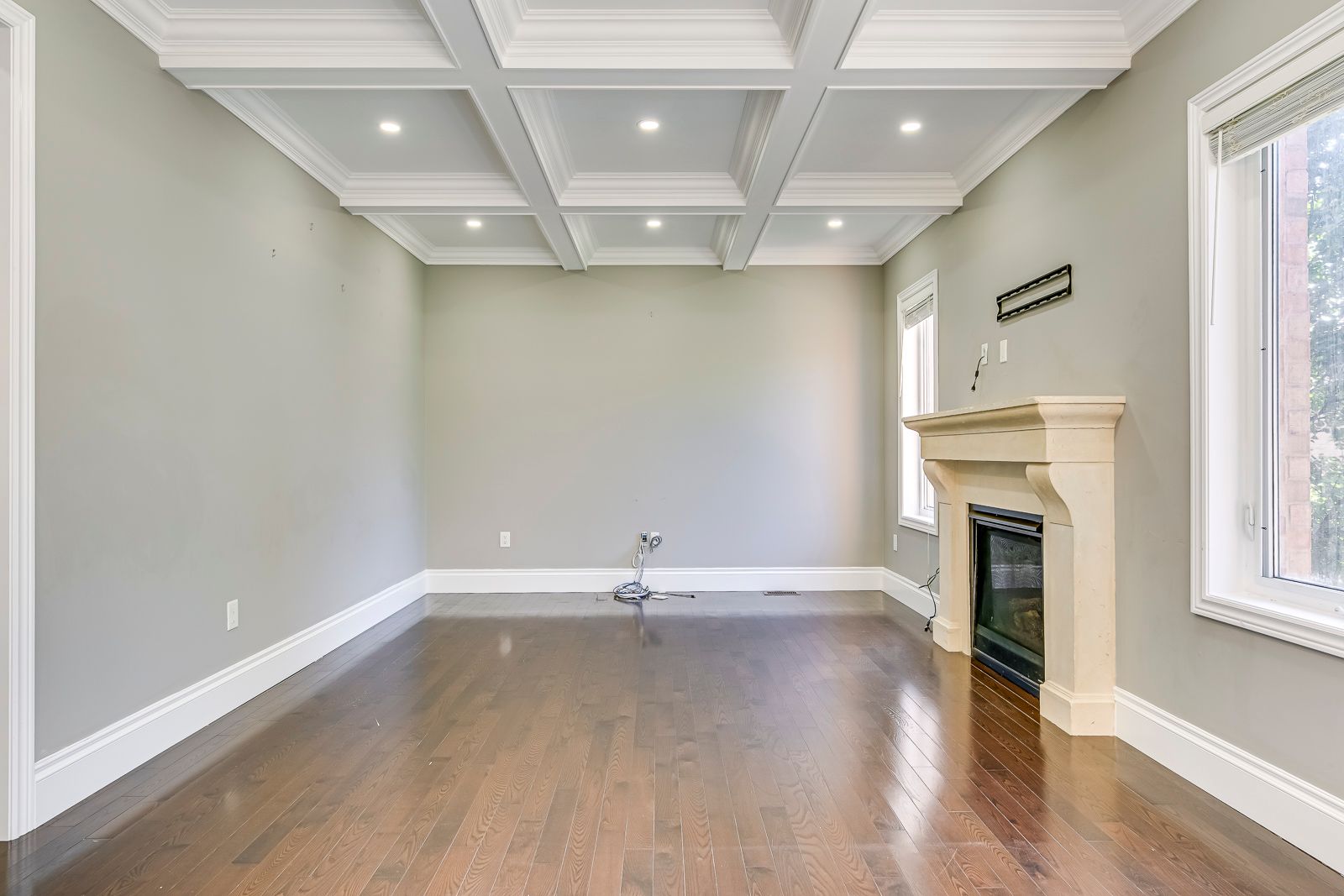 Hardwood Floor Gas Fireplace Coffered Ceiling