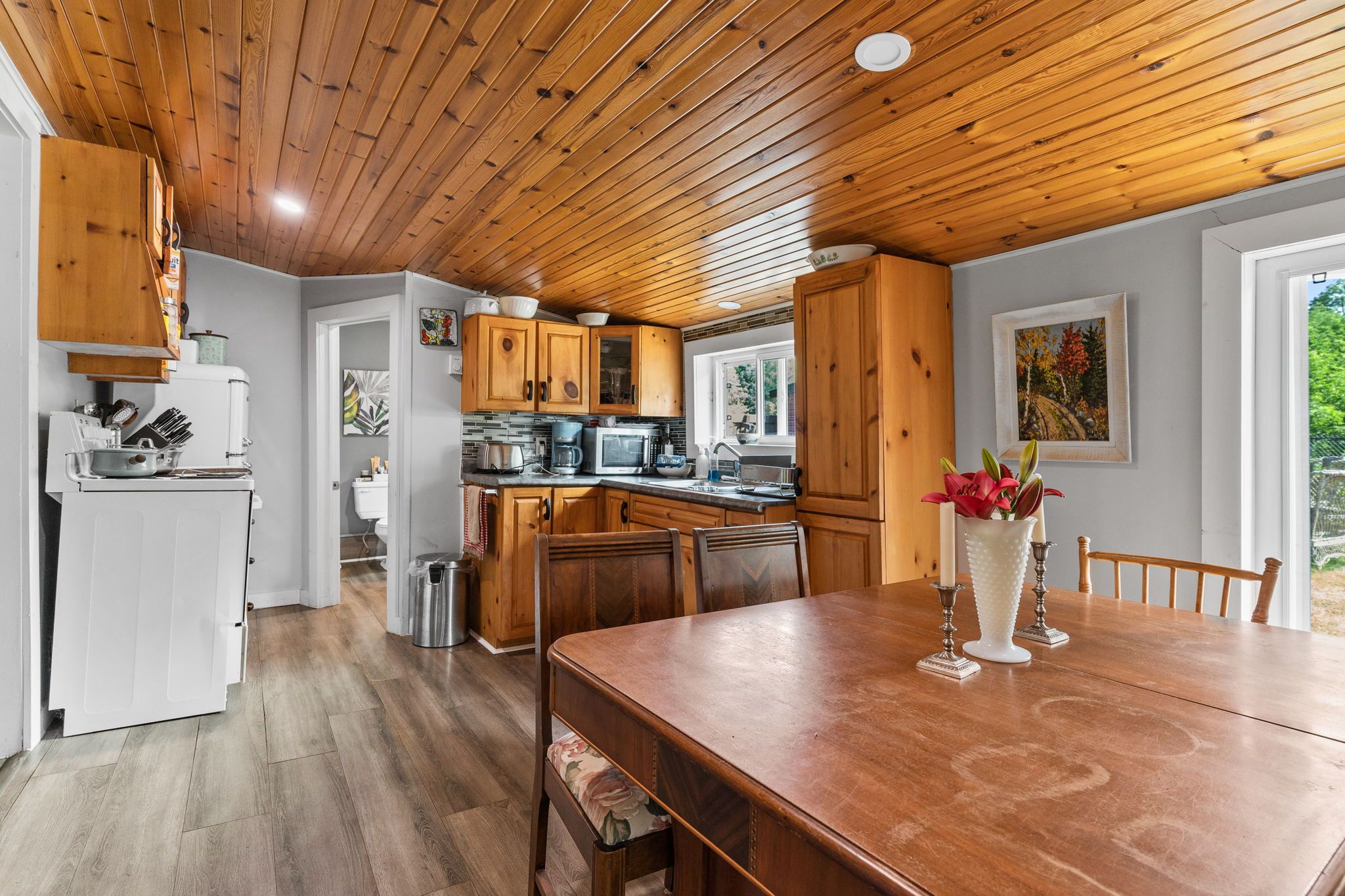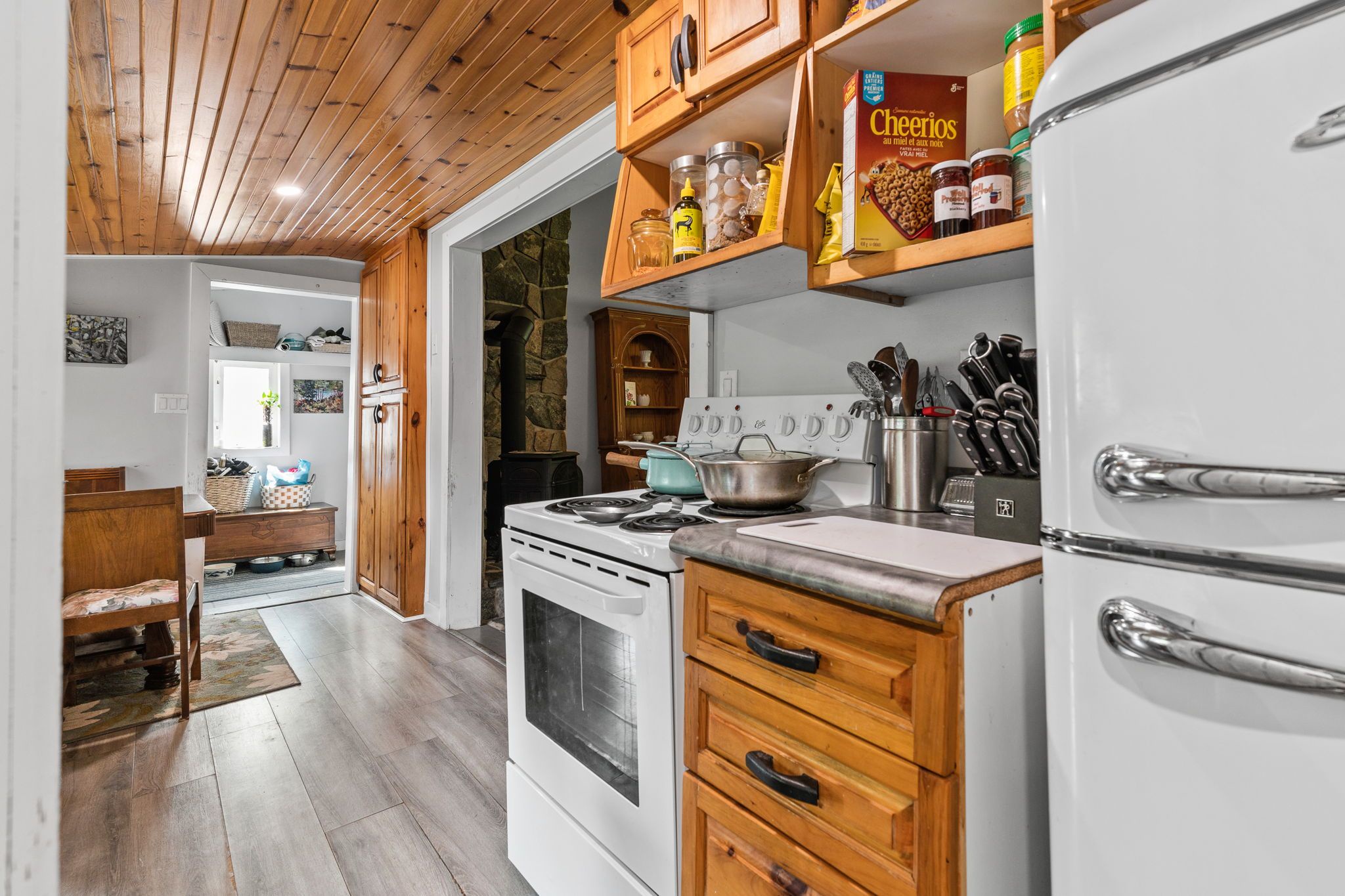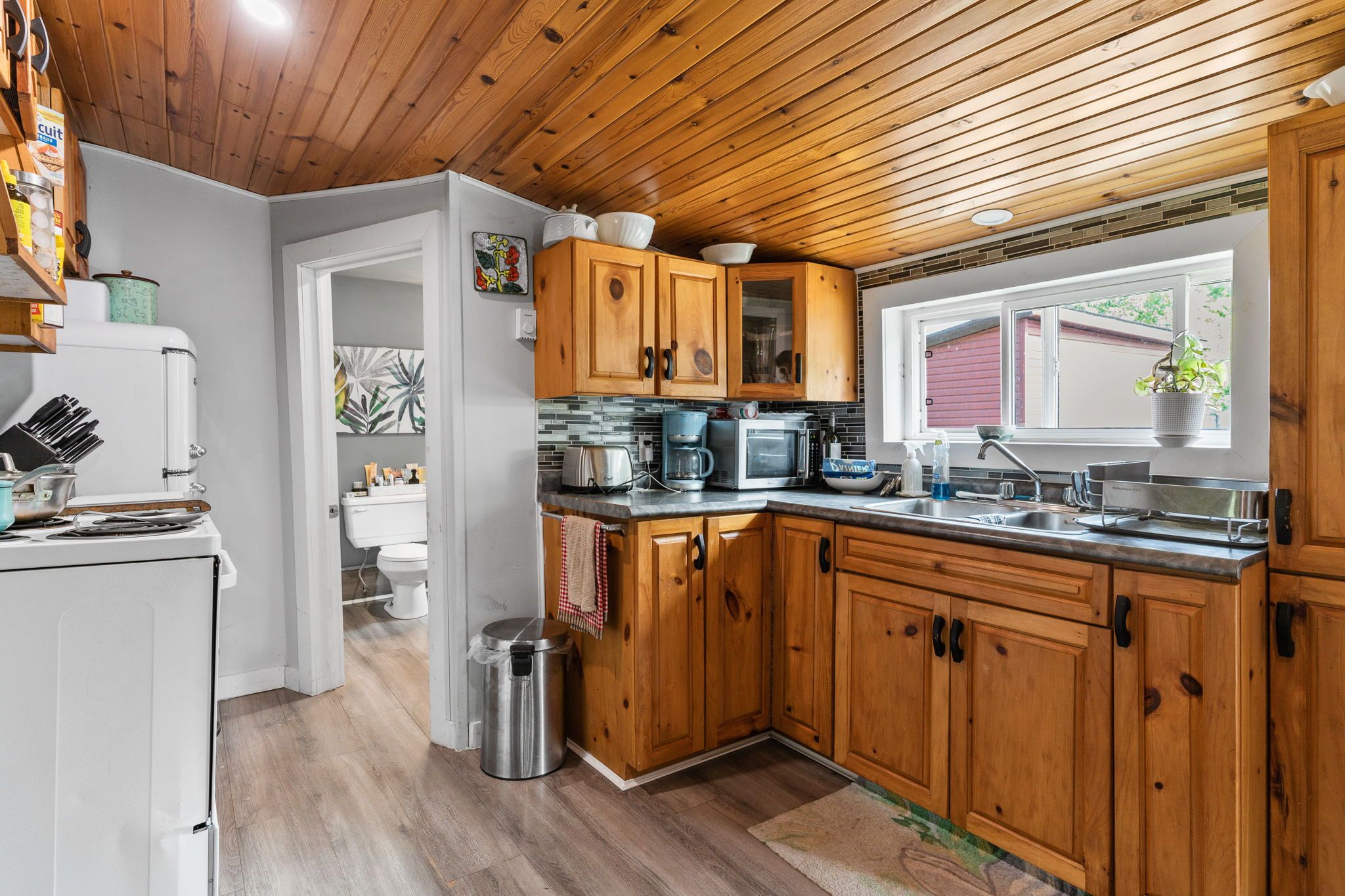 这座迷人的平房带阁楼,坐落于哈利伯顿县明登山(Minden Hills)古雅社区。这套两卧室住宅占地48.12×107英尺,后院无邻,私密性极佳。带顶棚的前廊通向宽敞的玄关,内置洗衣柜配备全尺寸洗衣烘干机。舒适的客厅拥有漂亮的松木拱形天花板和新款丙烷壁炉,为寒冷夜晚增添温暖。餐厨一体的厨房采用温馨的松木橱柜,配备复古风格冰箱和电炉——所有电器仅使用1年。主层设两间卧室、升级的三件套浴室(带站立式淋浴)以及通过木梯进入的 bonus 阁楼空间。全围栏后院、大型储物棚和三车位停车区一应俱全。