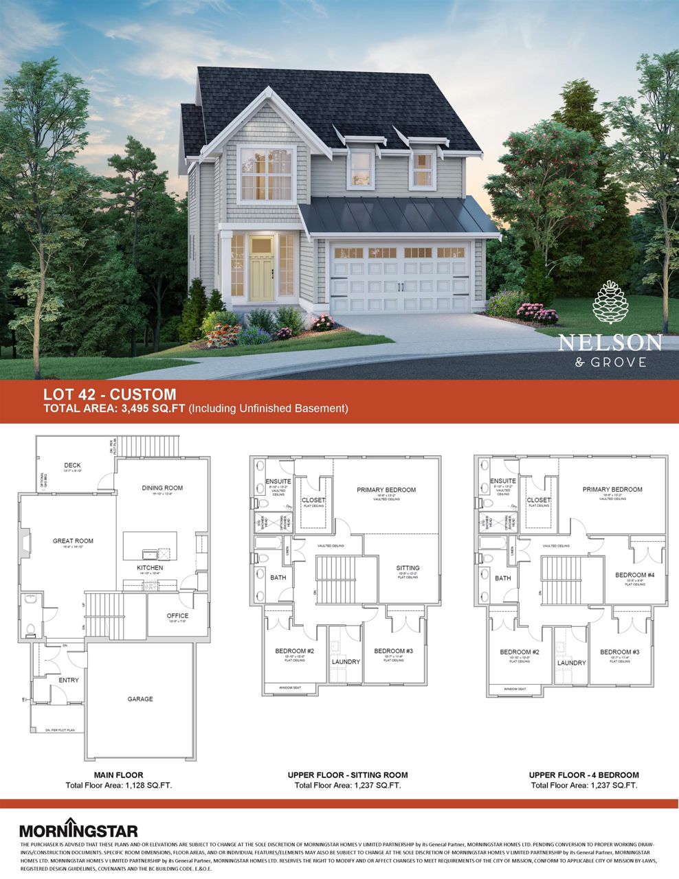 GST INCLUDED. Welcome to Nelson & Grove... the address you will love to call home. This CUSTOM HOME'S open concept plan combines both luxury & modern living style. Main level offers great room with vertical shiplap electric fireplace, gourmet-style kitchen with huge island, appliances & pantry. Large dining room with door onto sundeck. Private office space & powder room. Upper floor offers primary bedroom & sitting room (or change to 4th bedroom), spa-like ensuite & WIC. 2 additional bedrooms, laundry room & a full bath. FINISHED WALKOUT BASEMENT complete with huge rec.room, flex room with wet bar, bedroom & bathroom. Fenced yard backing onto GREENBELT. 2 car garage.
