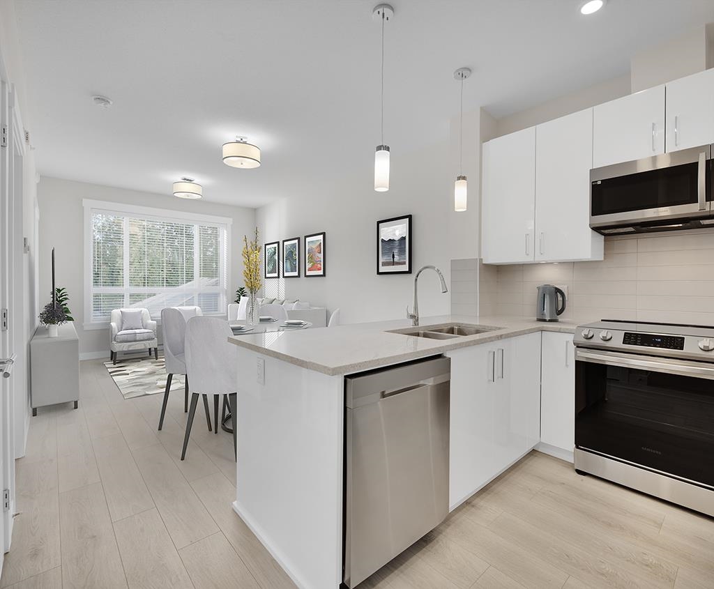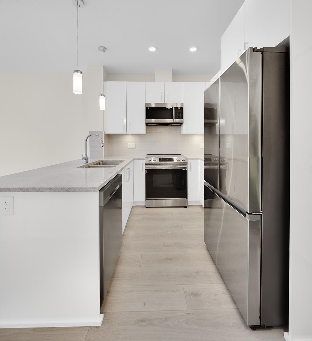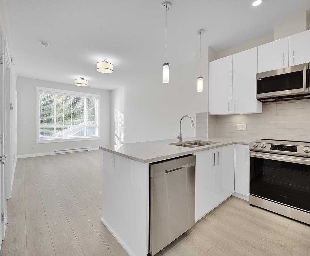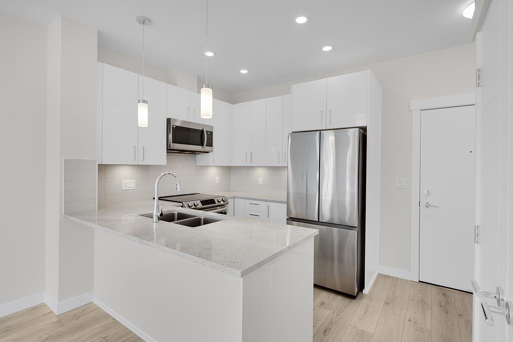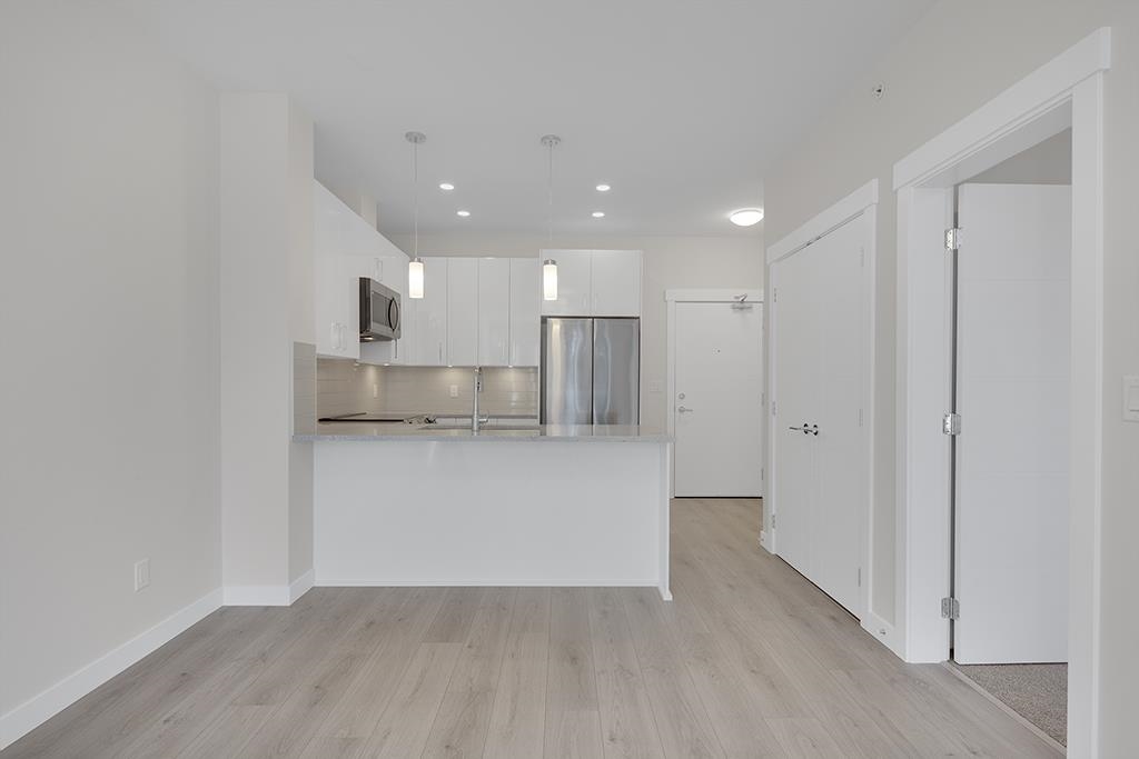 Brand new, TOP FLOOR 1 Bed & 1 Bath condo. Built by award-winning Redekop Faye. SW facing balcony. Beautiful open plan with 515 interior SF and 72 SF balcony. S/S appliance package including fridge w. ice maker & under cabinet lighting; Bathroom features undermount sinks w. white quartz countertops, mosaic tile surround, LED lighting. Sound limiting walls and ceilings, HE front-loading washer and dryer, B/I sprinkler systems, CO2 & smoke alarms. 2-5-10 Warranty, built with rainscreen technology and Hardie Plank siding. 1 PARKING spots & 1 LOCKER included. Amenities on each floor including a home office hub, yoga studio, pet wash station and games room. Explore nearby trails, hiking areas & just a few mins drive to the West Coast Express. Pets & rentals allowed. Move-in ready!