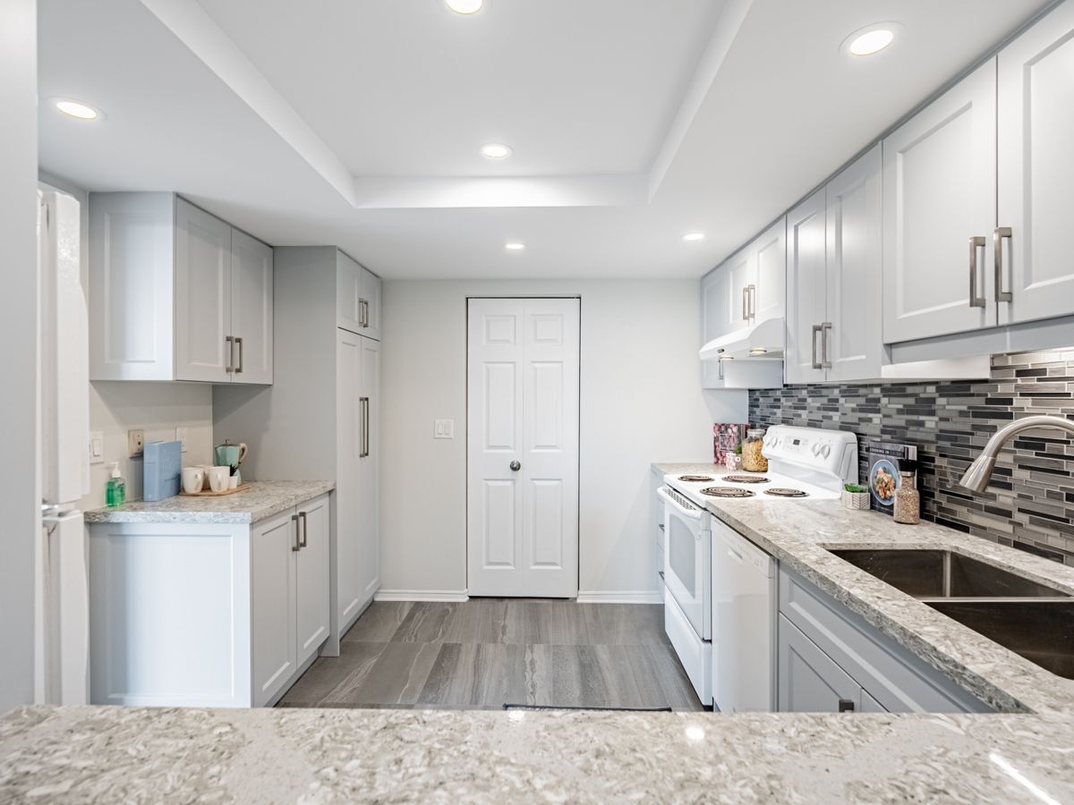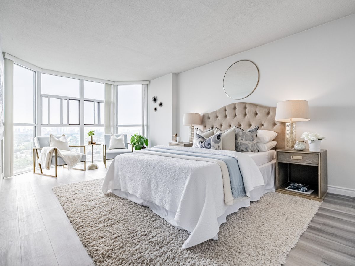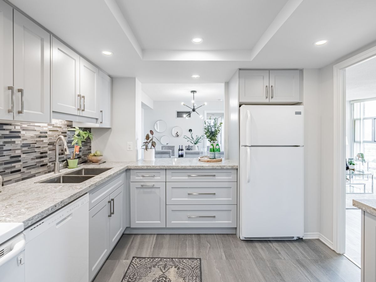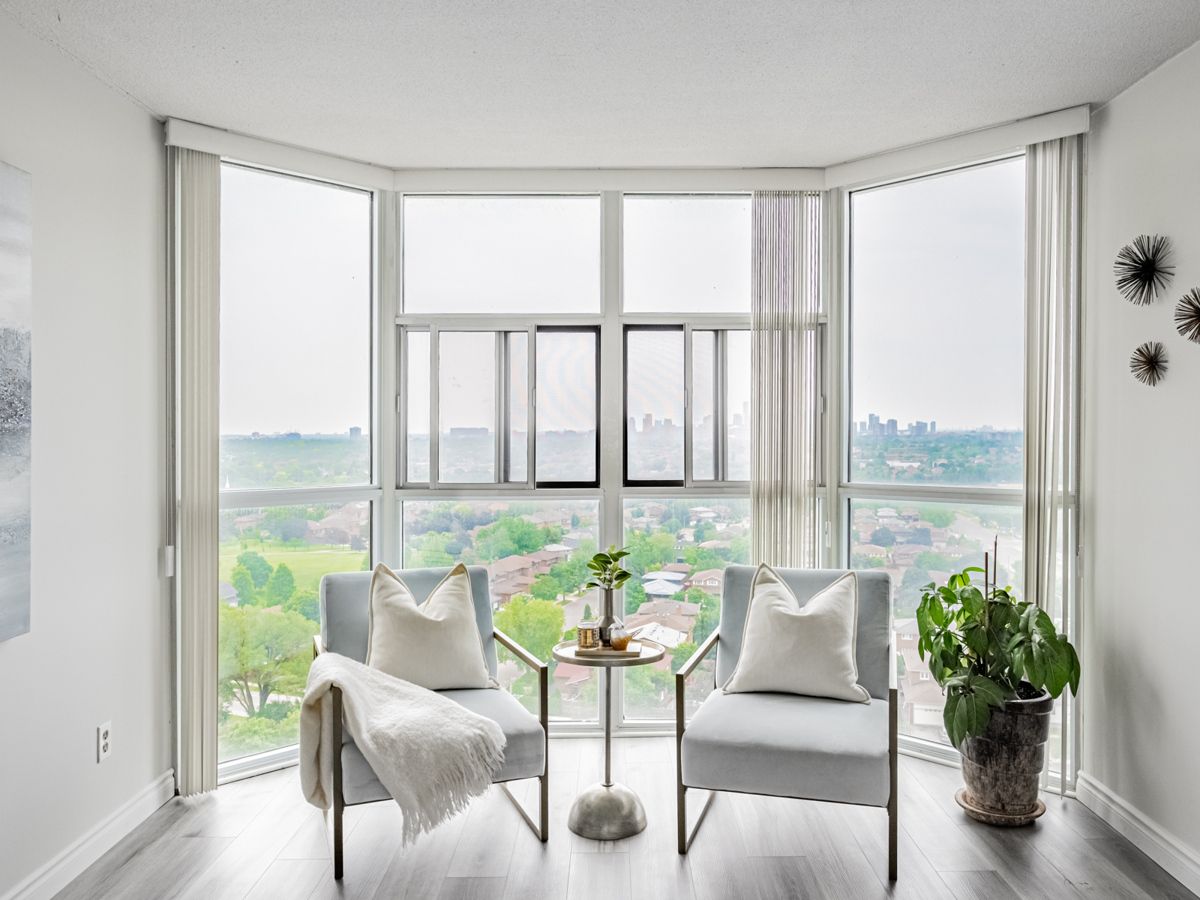 Luxurious Corner Recently Renovated 2 Bedroom 2 Full Bathrooms & spectacular North, West & South Views. Bright and Spacious 1253 sq ft Floor Plan. Custom Modern Kitchen with Soft Closing Drawers O/Ls Dining room. Two (2) newly renovated Bathrooms, Brand New Modern Vinyl Flooring, Unit freshly painted T/O. Large Living Room can fit an office. Master Bedroom has beautiful SW views & features a 4-piece Ensuite & Large Walk-In Closet. (Don't miss the) Ensuite Laundry in the Kitchen. Condo fees include EVERYTHING. 1 Underground Parking Spot & 1 Locker. Bldg Ideally located across the road from Rockwood Mall, near the Library,Aurora Meats& Cheese, Arkady Bistro Cafe & more in Wisla Plaza,Square One & Costco minutes away. Rathburn bus in front of building goes Direct to the Islington subway station. ***Offers on June 19 @ 7 pm. Please register by 5 pm. Minimum 5 % Bank Draft Deposit. July 13 possession is the preferred closing date but Seller will consider other dates if the price is right***Maintenance Fee INCLUDES ROGERS IGNITE Internet.