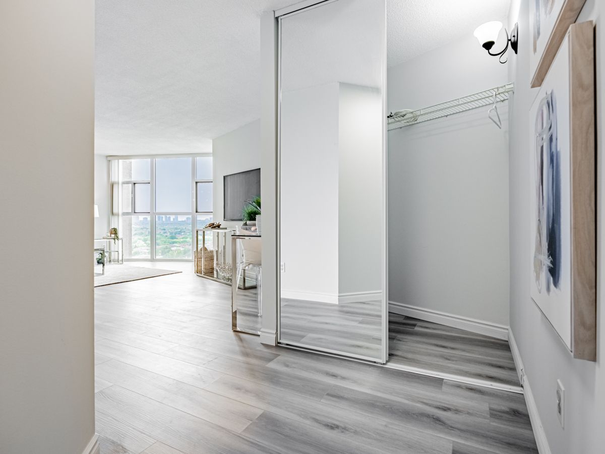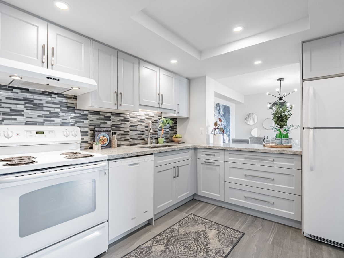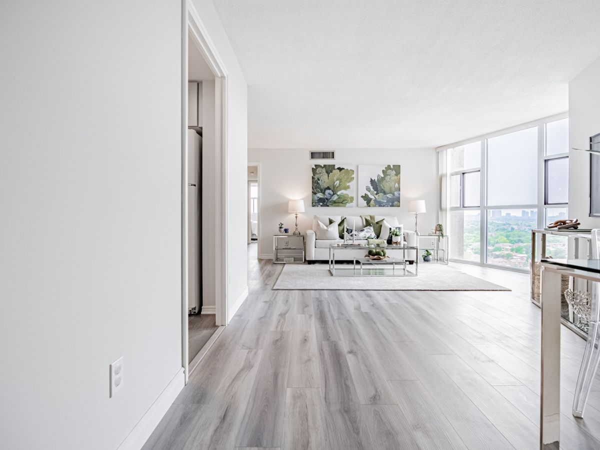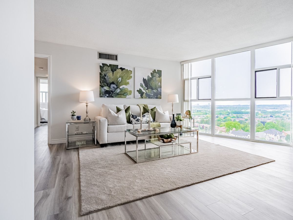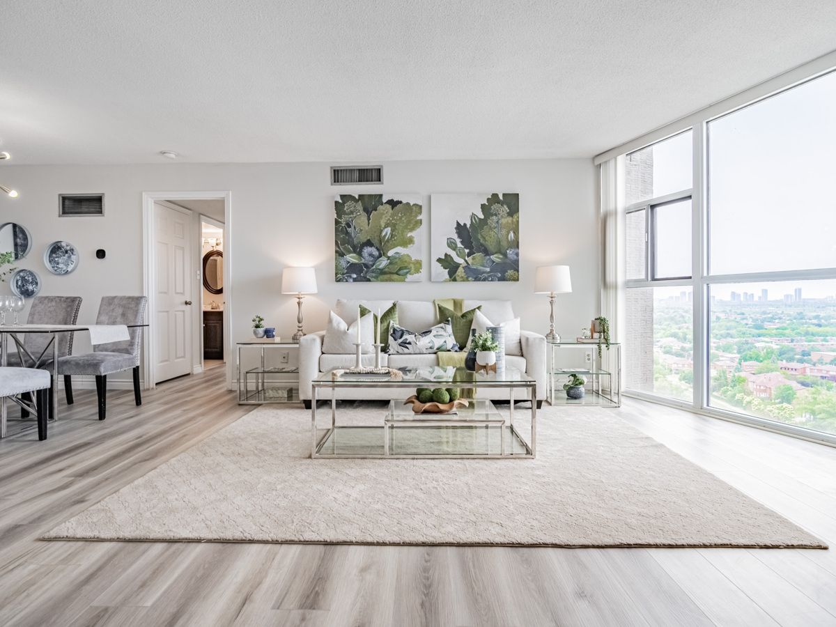 Luxurious Corner Recently Renovated 2 Bedroom 2 Full Bathrooms & spectacular North, West & South Views. Bright and Spacious 1253 sq ft Floor Plan. Custom Modern Kitchen with Soft Closing Drawers O/Ls Dining room. Two (2) newly renovated Bathrooms, Brand New Modern Vinyl Flooring, Unit freshly painted T/O. Large Living Room can fit an office. Master Bedroom has beautiful SW views & features a 4-piece Ensuite & Large Walk-In Closet. (Don't miss the) Ensuite Laundry in the Kitchen. Condo fees include EVERYTHING. 1 Underground Parking Spot & 1 Locker. Bldg Ideally located across the road from Rockwood Mall, near the Library,Aurora Meats& Cheese, Arkady Bistro Cafe & more in Wisla Plaza,Square One & Costco minutes away. Rathburn bus in front of building goes Direct to the Islington subway station. ***Offers on June 19 @ 7 pm. Please register by 5 pm. Minimum 5 % Bank Draft Deposit. July 13 possession is the preferred closing date but Seller will consider other dates if the price is right***Maintenance Fee INCLUDES ROGERS IGNITE Internet.