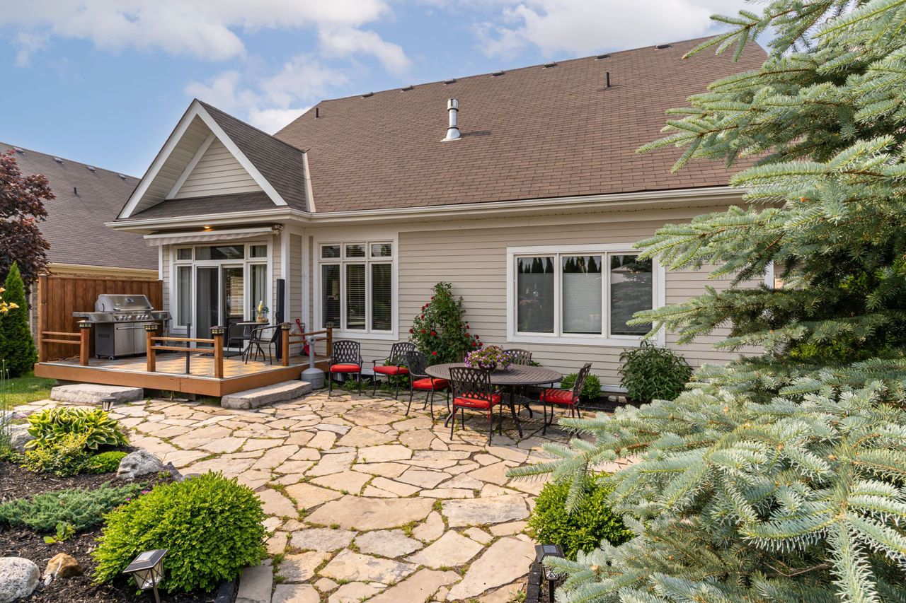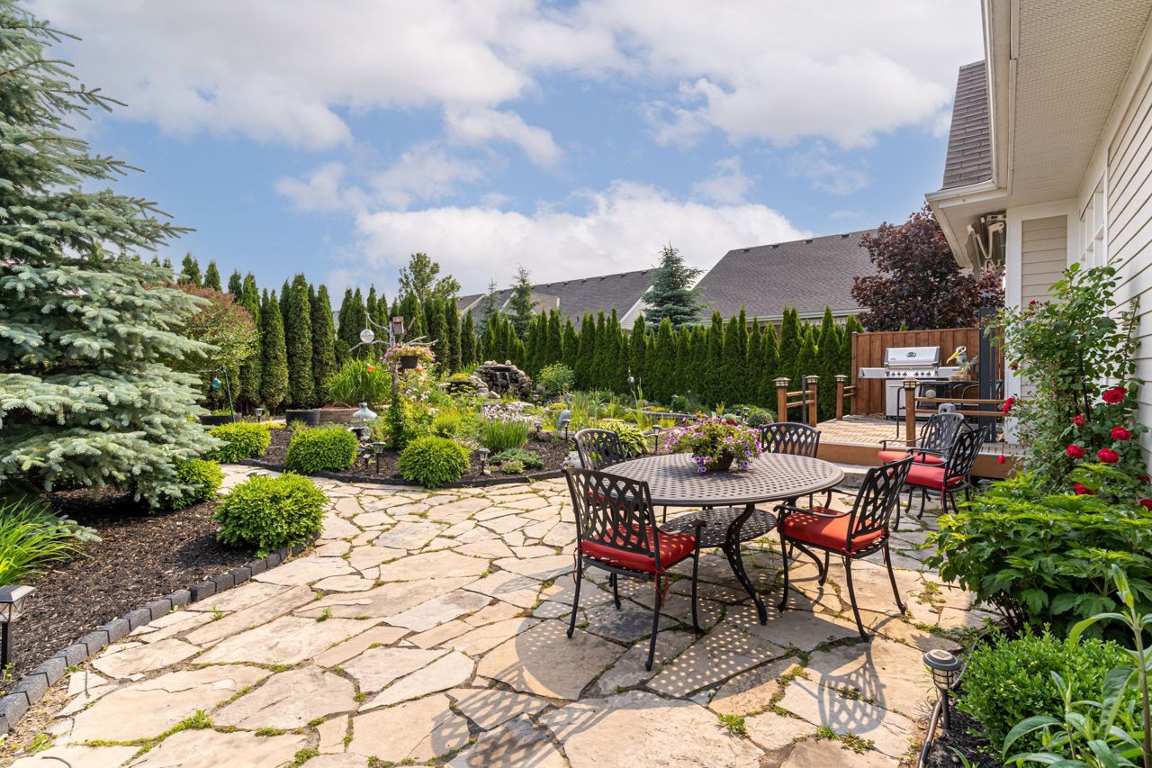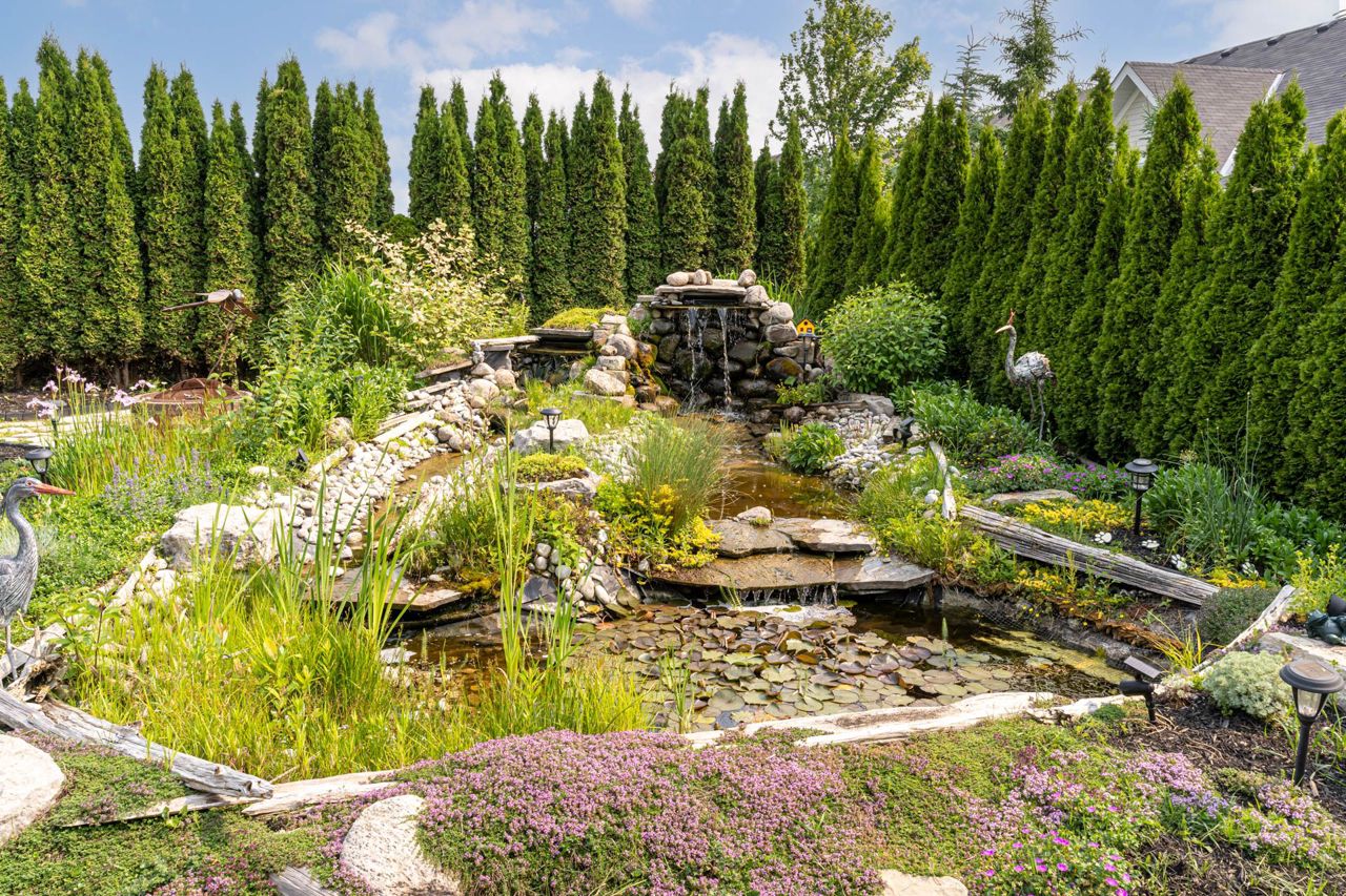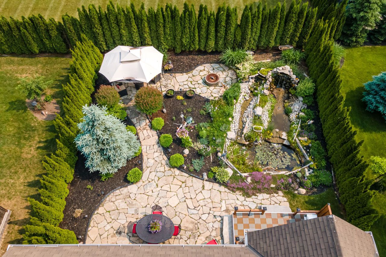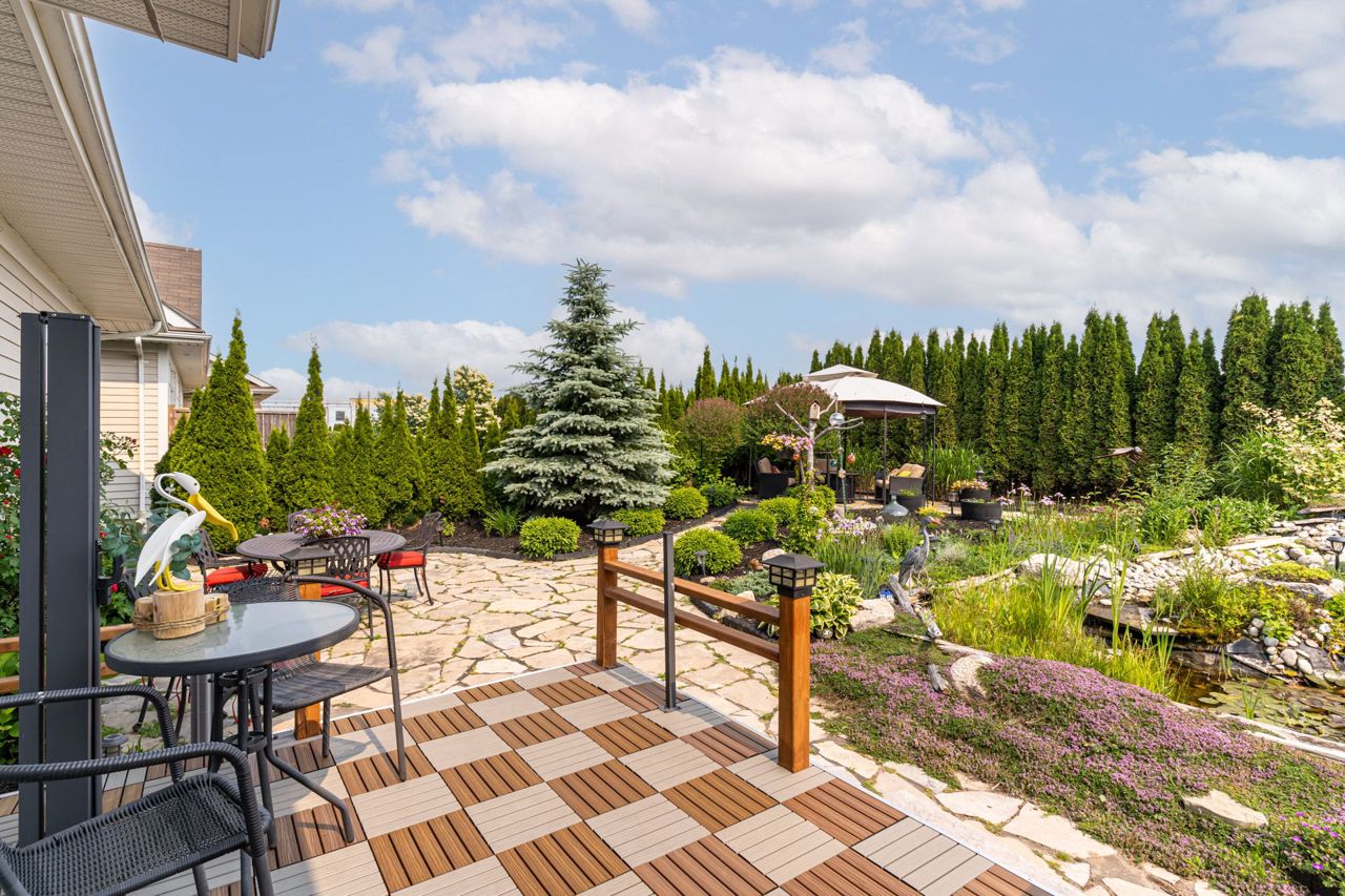 professionally landscaped backyard, double waterfall,perennial flowers and high live fencing of cedars, Your Private Oasis awaits With No Neighbours Behind You.