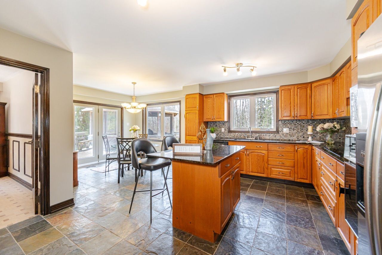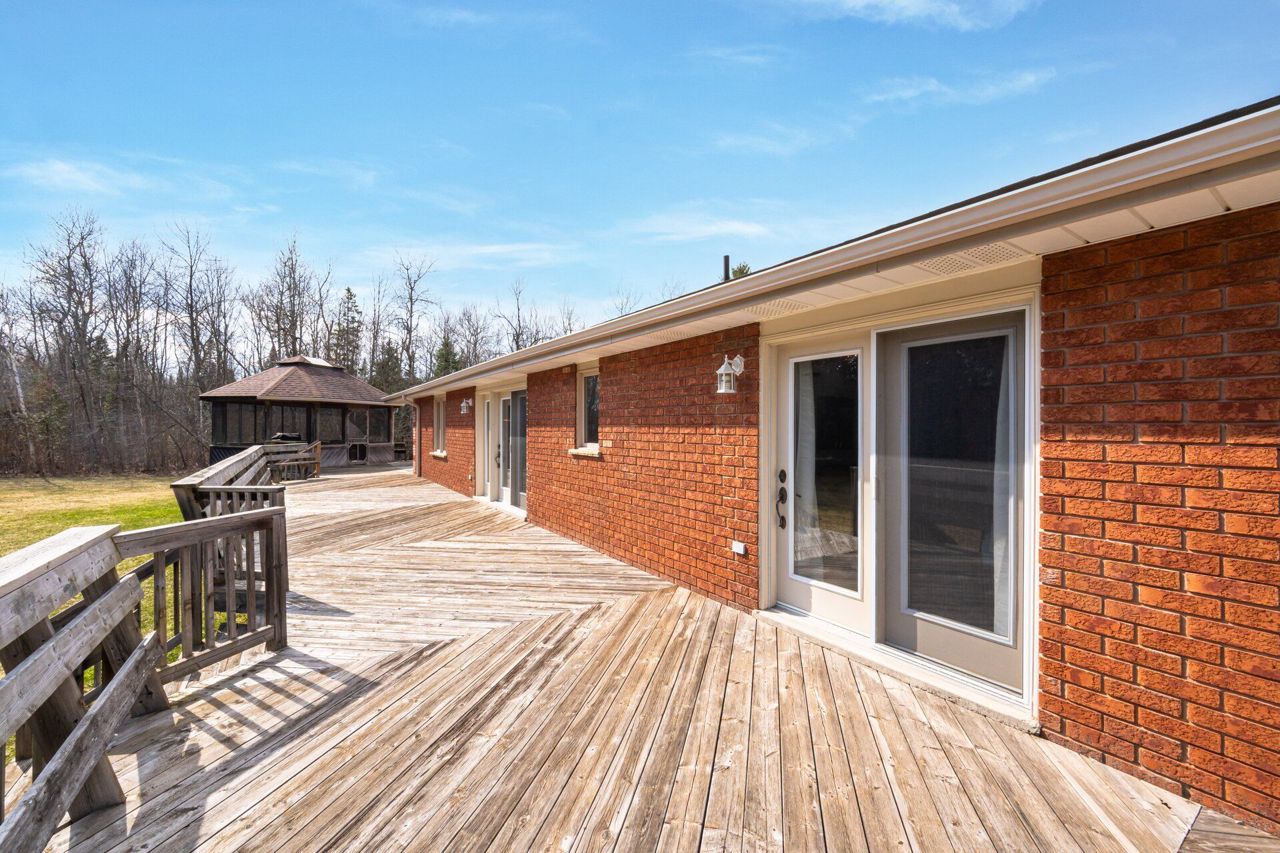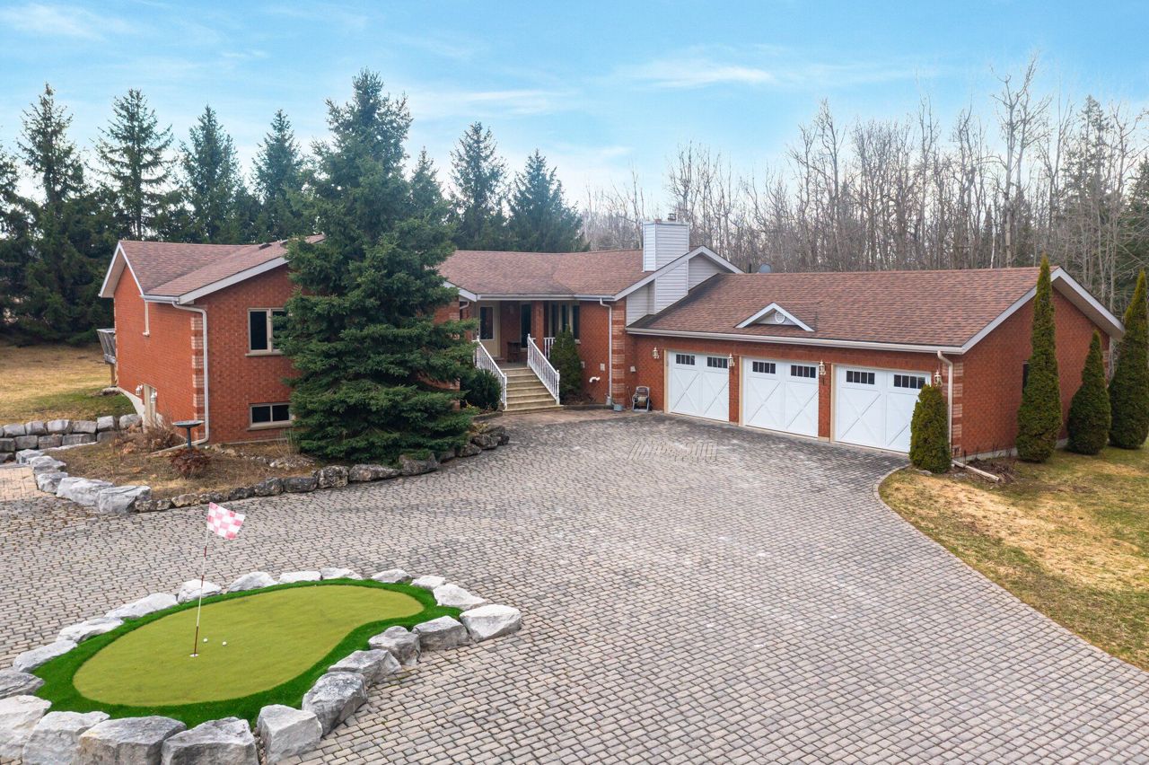 Welcome to this incredible opportunity nestled on a sprawling 7.66-acre wooded and partially cleared private estate lot. Step inside the Beautifully Renovated 3+2 bedroom All-Brick bungalow, where warmth and sophistication await. The Main Floor boasts an open-concept layout with hardwood floors gracing the spacious Living and Dining areas. A Family-size gourmet Kitchen featuring granite counters, slate floors, and built-in appliances. Cozy family room has wood fireplace, accentuated by cathedral ceilings, offering a perfect retreat. Three generous bedrooms, Master Bedroom with a walk-in closet and ensuite bath, provide comfort and luxury. Fully finished walkout basement offers additional living space, including two bedrooms, a large recreation room, an eat-in kitchen, and a full bath - ideal for accommodating guests, In Law Suite or extended family. Adjacent to the main residence, discover a custom detached 4-bay heated workshop, boasting 1600 sq ft of space, a powder room, and ample overhang for storage - Including Hydro & Central Metering From Pole 200 Amps. Entertain in style on the massive custom 1450 sq ft deck, featuring bench seating and three sets of stairs for convenience. A charming 350Sq.Ft screened-in gazebo with a skylight offers a serene escape amidst nature's beauty. Experience the ease of daily life with two laundry rooms on each floor. A triple Car Garage, putting green, and custom stone driveway complete the picture of luxury living. A Must see !!