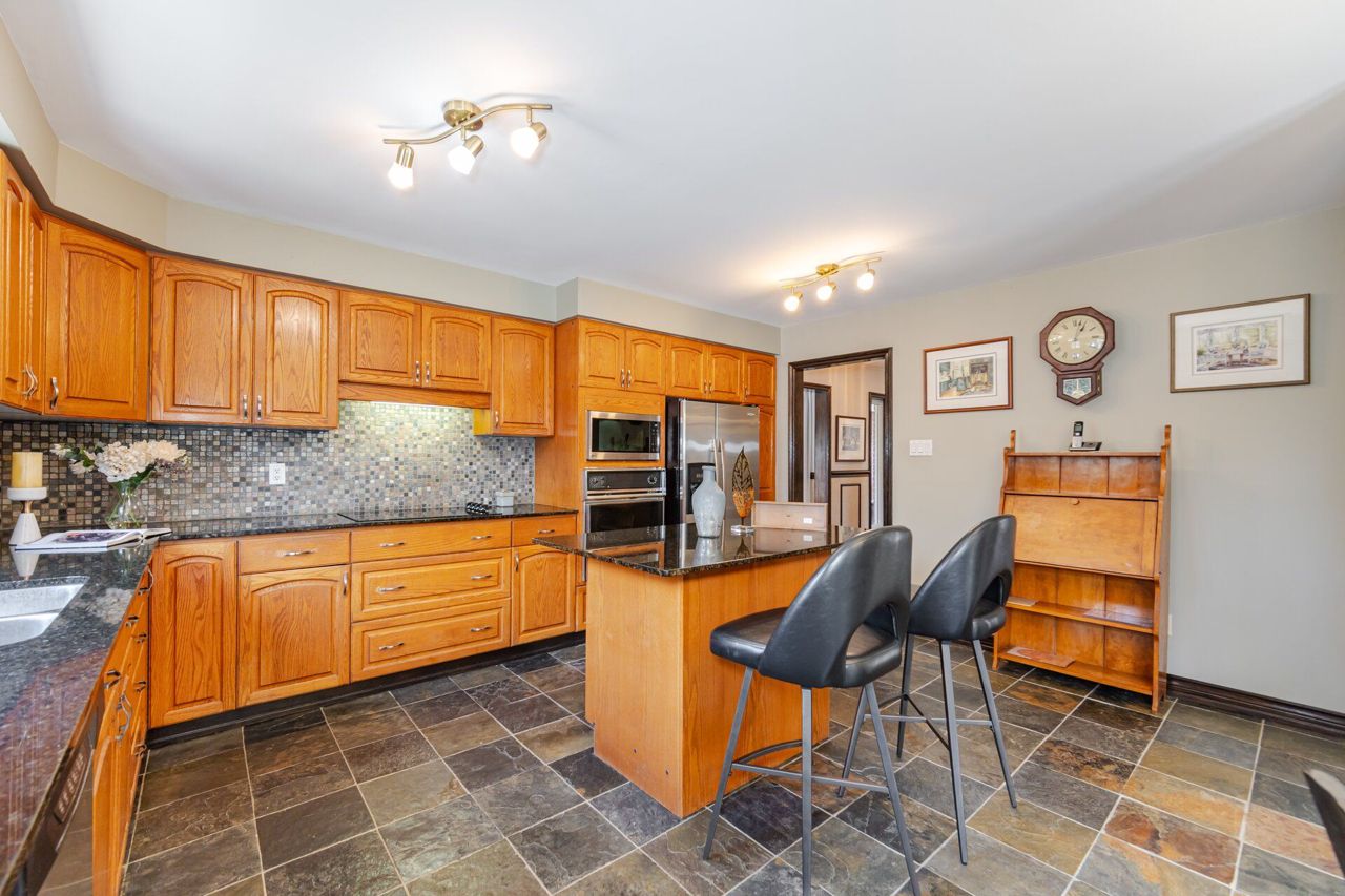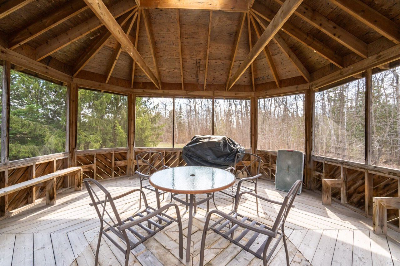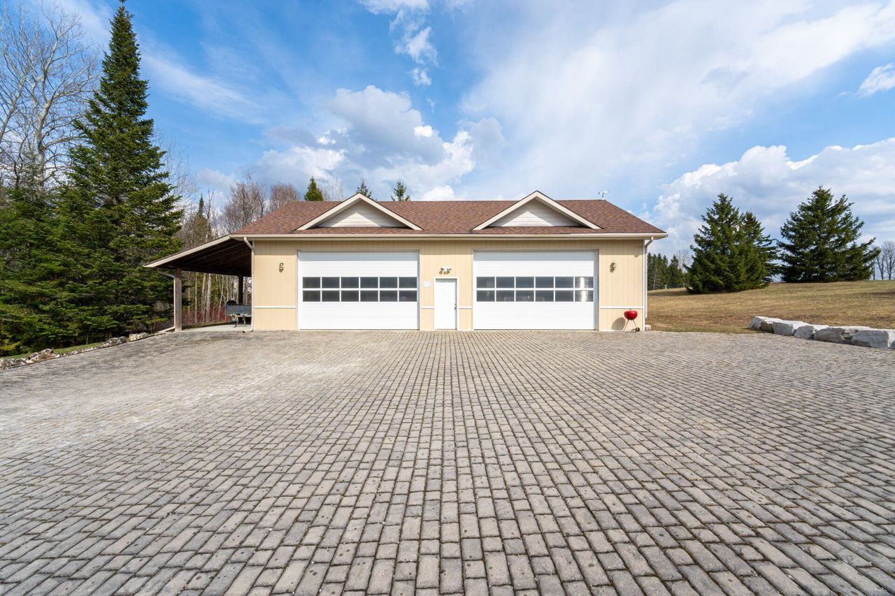 Welcome to this incredible opportunity nestled on a sprawling 7.66-acre wooded and partially cleared private estate lot. Step inside the Beautifully Renovated 3+2 bedroom All-Brick bungalow, where warmth and sophistication await. The Main Floor boasts an open-concept layout with hardwood floors gracing the spacious Living and Dining areas. A Family-size gourmet Kitchen featuring granite counters, slate floors, and built-in appliances. Cozy family room has wood fireplace, accentuated by cathedral ceilings, offering a perfect retreat. Three generous bedrooms, Master Bedroom with a walk-in closet and ensuite bath, provide comfort and luxury. Fully finished walkout basement offers additional living space, including two bedrooms, a large recreation room, an eat-in kitchen, and a full bath - ideal for accommodating guests, In Law Suite or extended family. Adjacent to the main residence, discover a custom detached 4-bay heated workshop, boasting 1600 sq ft of space, a powder room, and ample overhang for storage - Including Hydro & Central Metering From Pole 200 Amps. Entertain in style on the massive custom 1450 sq ft deck, featuring bench seating and three sets of stairs for convenience. A charming 350Sq.Ft screened-in gazebo with a skylight offers a serene escape amidst nature's beauty. Experience the ease of daily life with two laundry rooms on each floor. A triple Car Garage, putting green, and custom stone driveway complete the picture of luxury living. A Must see !!