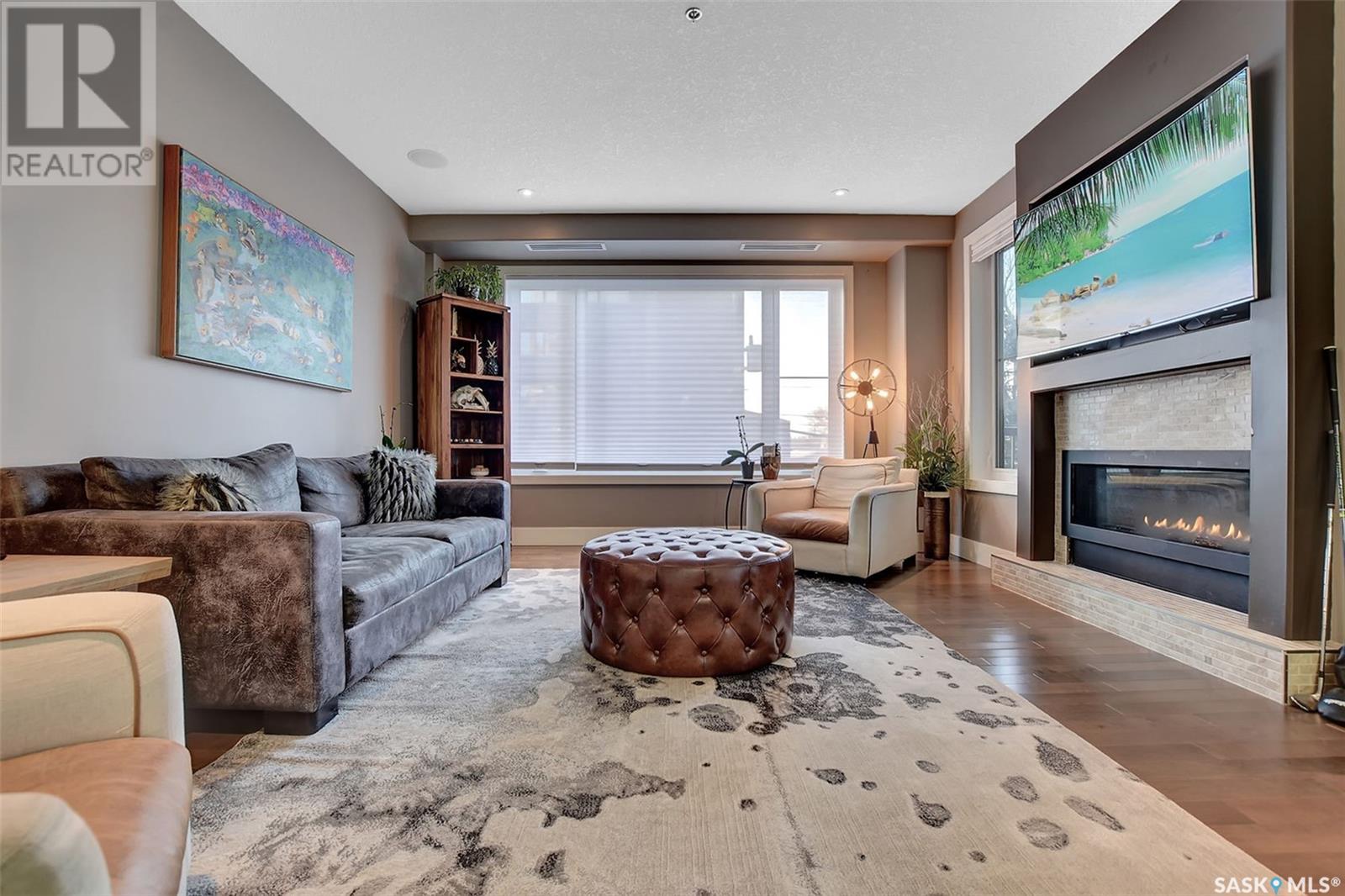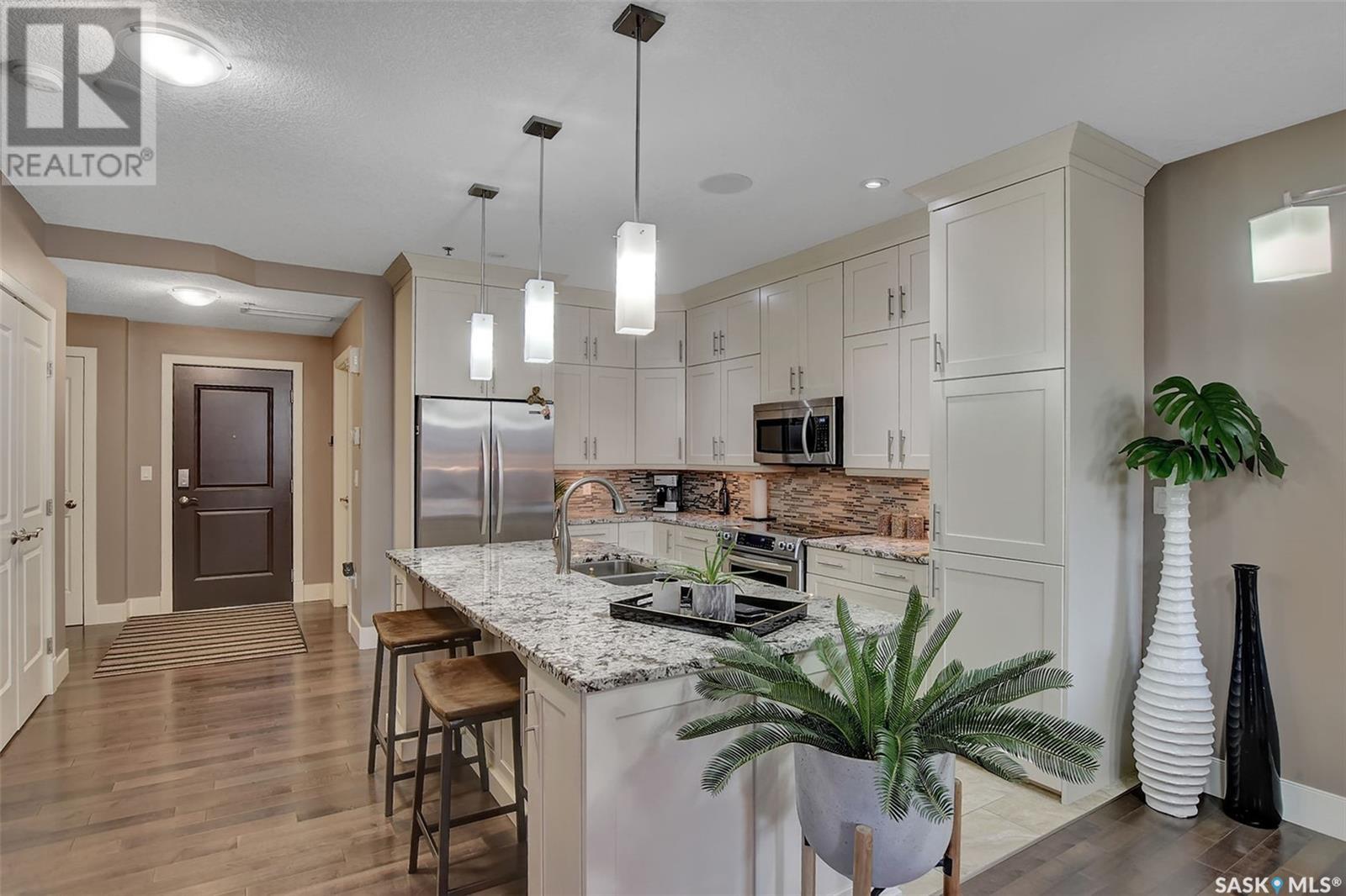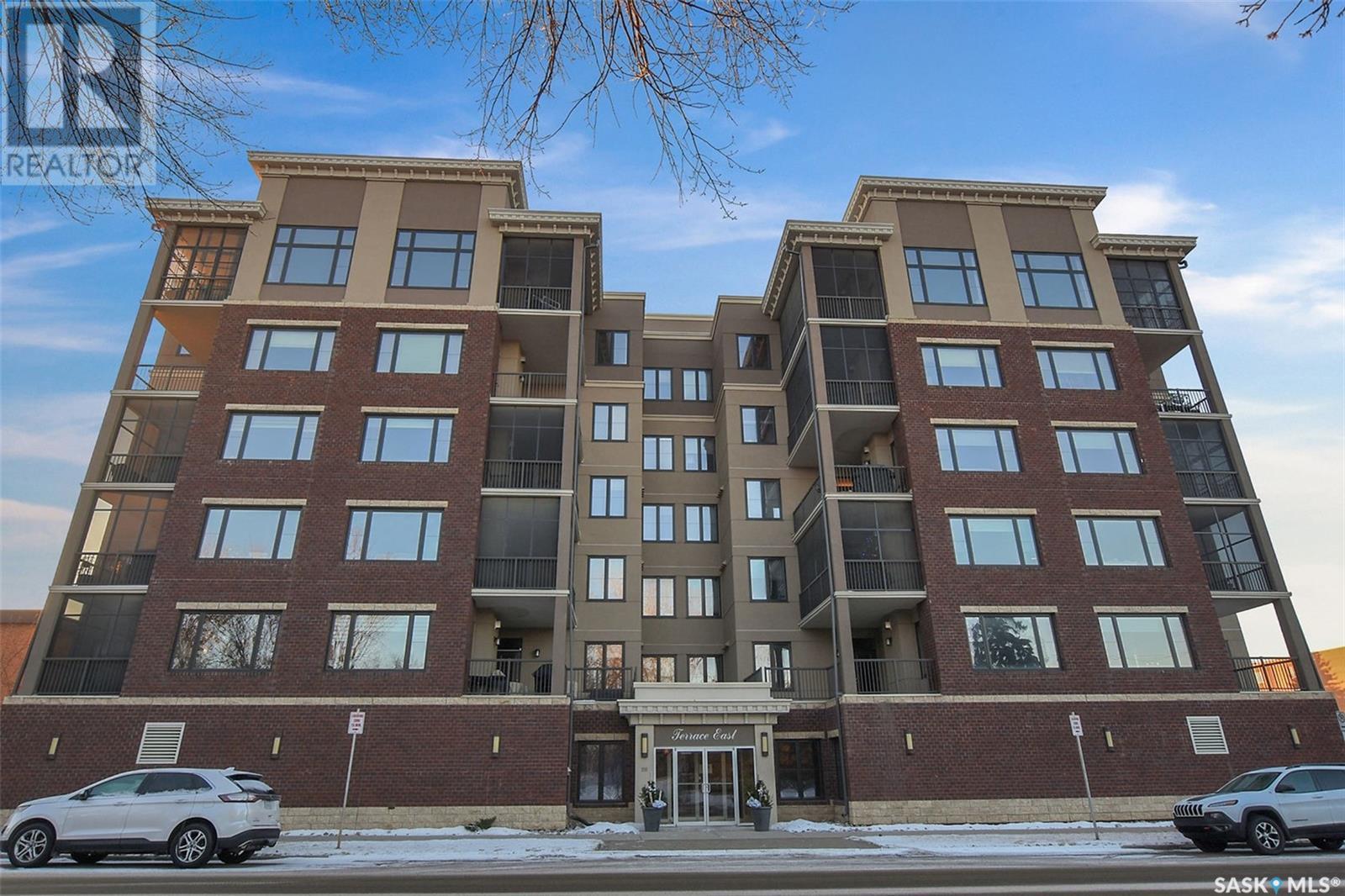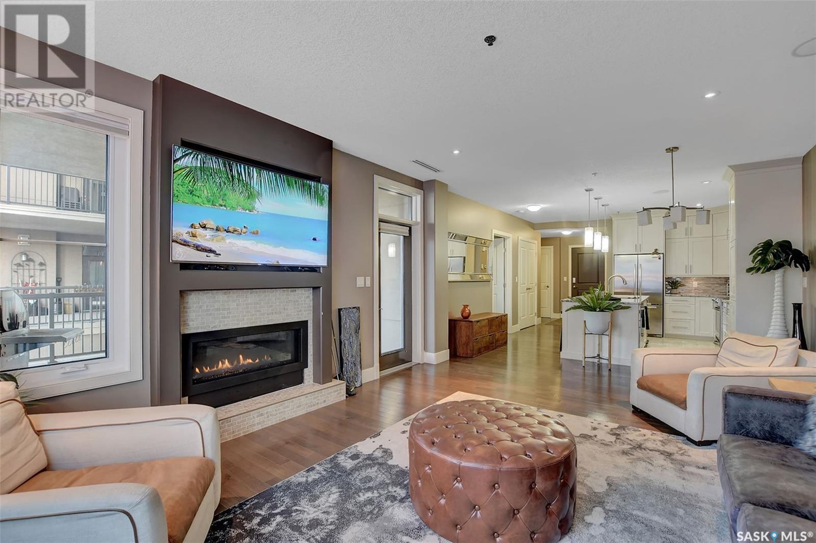 Welcome to Terrace East located in the heart of Moose Jaw. You will be impressed by the exterior curb appeal and further impressed when you enter this beautiful building. This one bedroom southern exposed condo is bright with white kitchen cabinetry and cheery atmosphere. Kitchen is equipped with stainless steel appliances and stone countertops. Both living room and dining area contains beautiful hardwood floors plus gas fireplace in living room. Enjoy the large walk in closet plus bathroom access from bedroom and hallway. Bathroom boasts an expensive tub/shower combination for your convenience. Surround sound allows flow of music in all the rooms. A large balcony for summertime enjoyment is complete with natural gas barbecue hook up. This building offers a library, fitness room, guest suite and common room for resident gatherings or private functions. The reasonable condo fee includes heat, water, building insurance and exterior maintenance. Each unit has a heated parking space and large storage unit. If you are looking for a maintenance free lifestyle this could be the perfect new home for you. This is a very solidly built secure building located across from Crescent Park and close to so many downtown amenities. Just move in and enjoy! Pets allowed with restrictions, (Dogs are not allowed). Call for your personal viewing today. (id:22211)