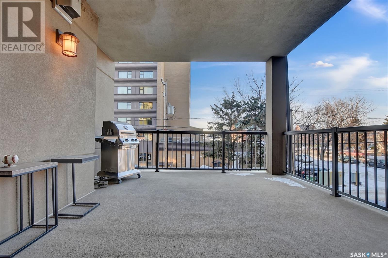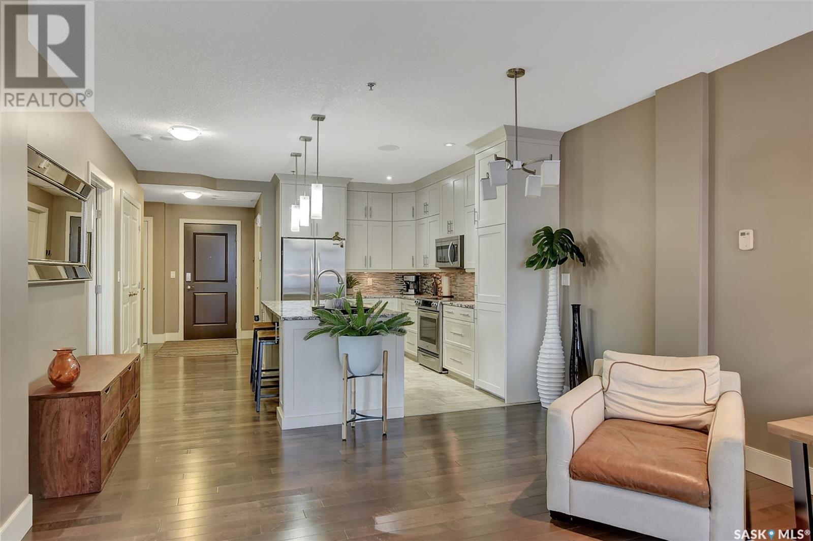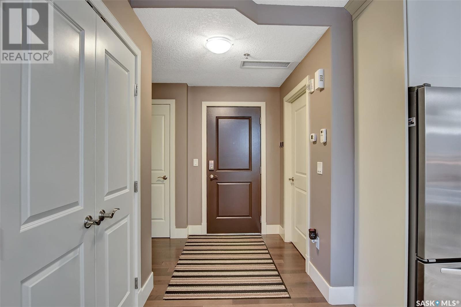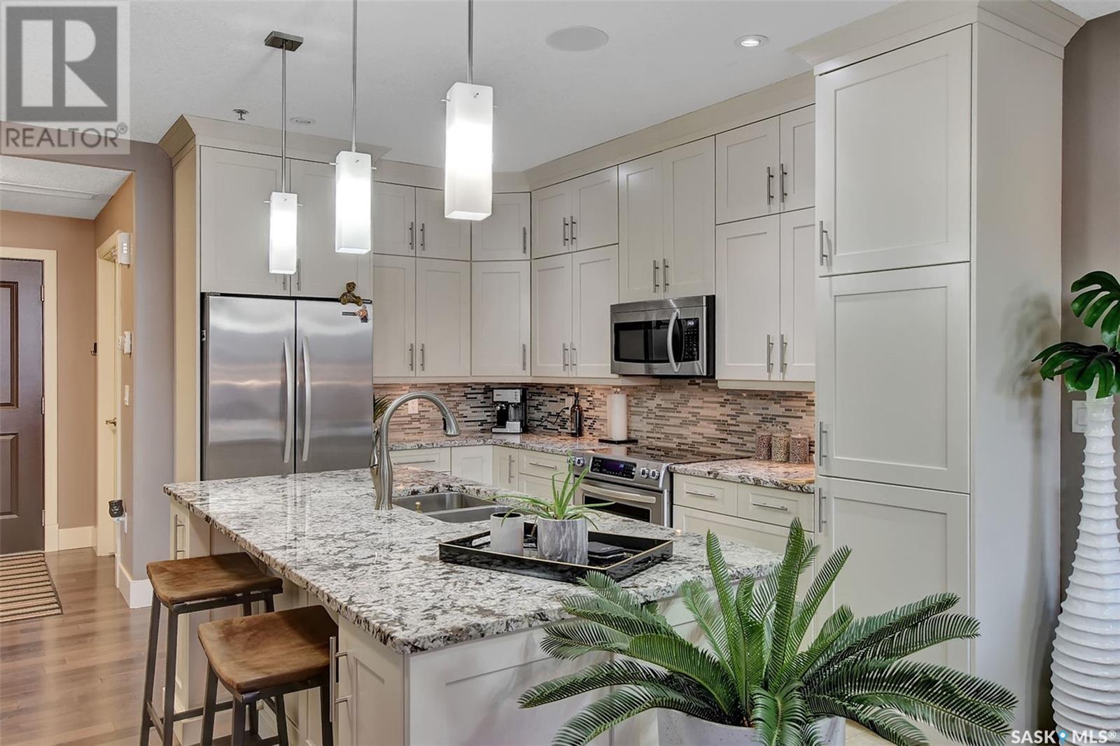 Welcome to Terrace East located in the heart of Moose Jaw. You will be impressed by the exterior curb appeal and further impressed when you enter this beautiful building. This one bedroom southern exposed condo is bright with white kitchen cabinetry and cheery atmosphere. Kitchen is equipped with stainless steel appliances and stone countertops. Both living room and dining area contains beautiful hardwood floors plus gas fireplace in living room. Enjoy the large walk in closet plus bathroom access from bedroom and hallway. Bathroom boasts an expensive tub/shower combination for your convenience. Surround sound allows flow of music in all the rooms. A large balcony for summertime enjoyment is complete with natural gas barbecue hook up. This building offers a library, fitness room, guest suite and common room for resident gatherings or private functions. The reasonable condo fee includes heat, water, building insurance and exterior maintenance. Each unit has a heated parking space and large storage unit. If you are looking for a maintenance free lifestyle this could be the perfect new home for you. This is a very solidly built secure building located across from Crescent Park and close to so many downtown amenities. Just move in and enjoy! Pets allowed with restrictions, (Dogs are not allowed). Call for your personal viewing today. (id:22211)