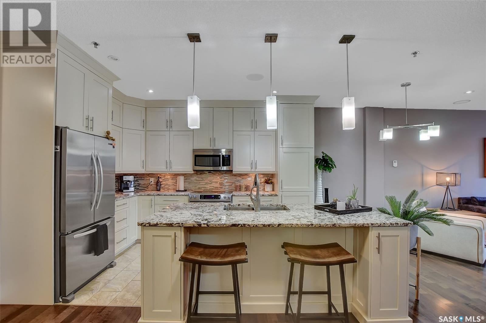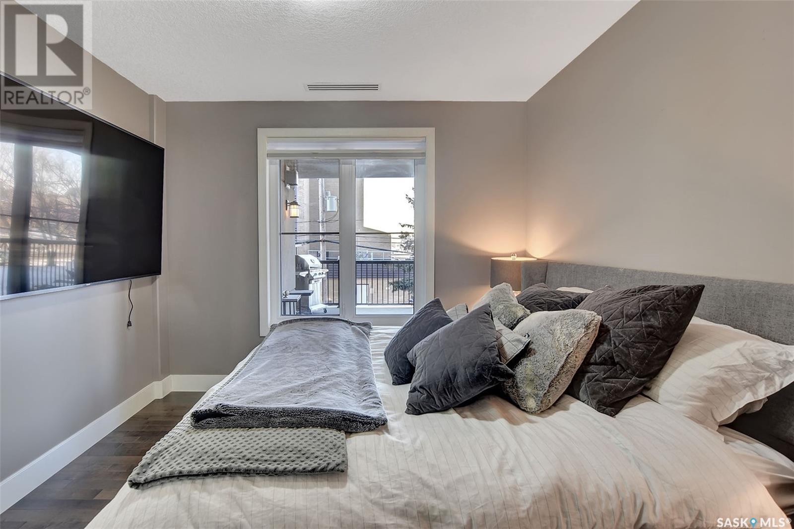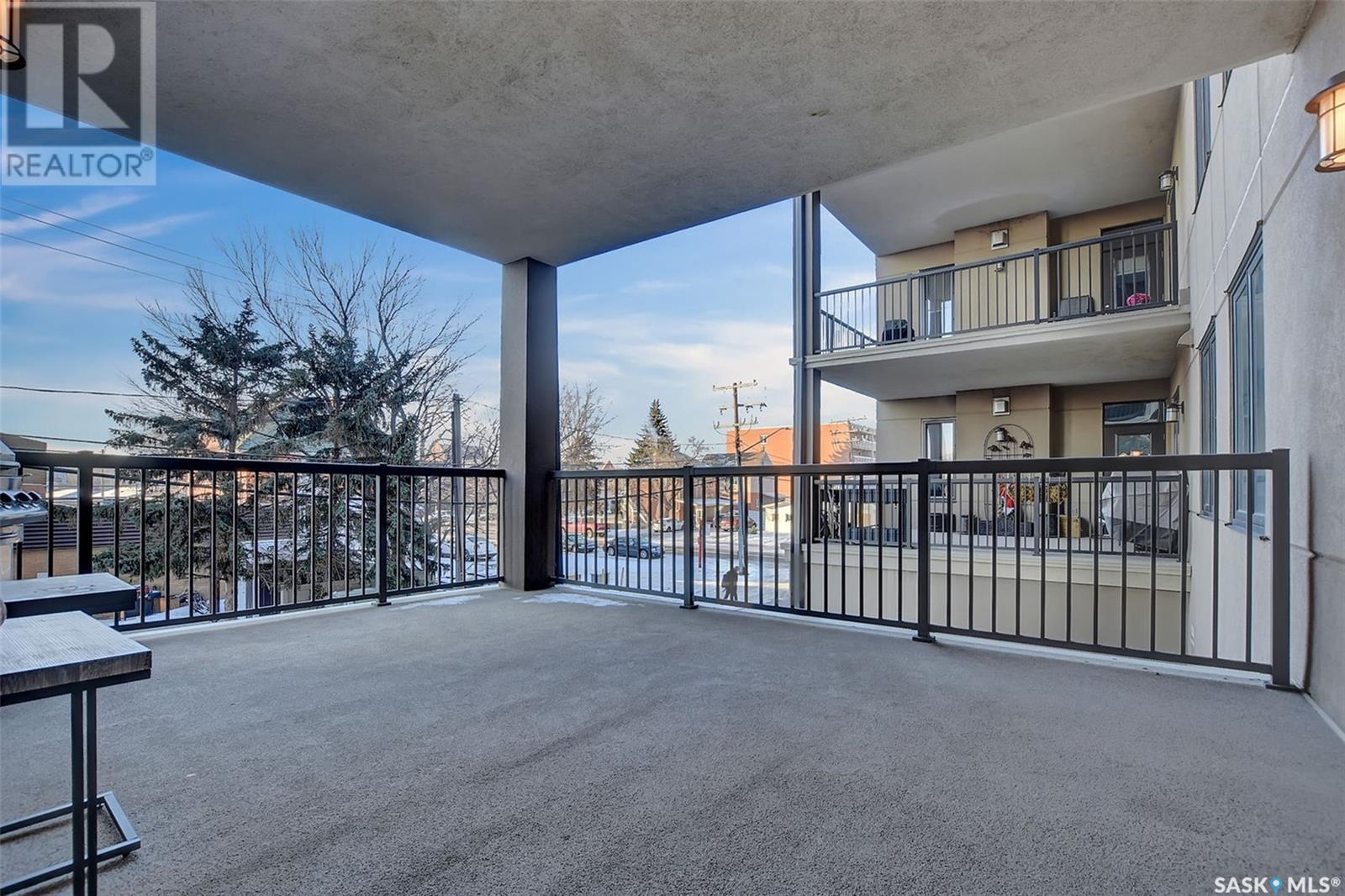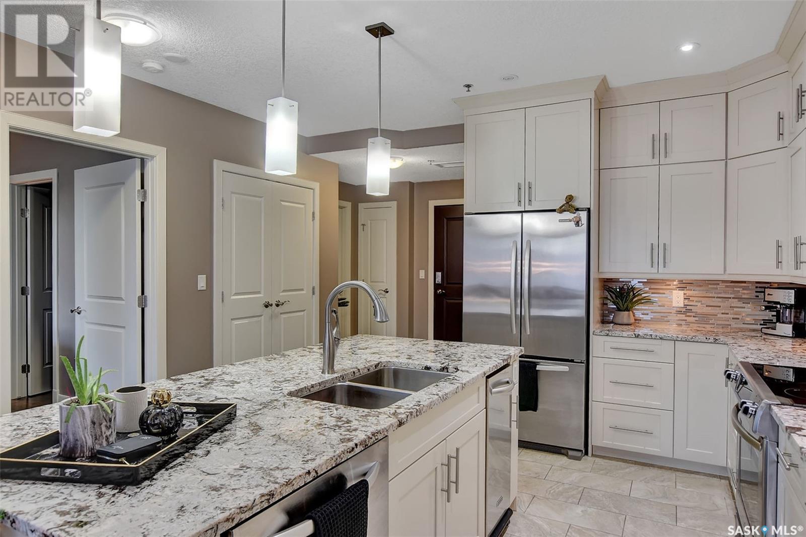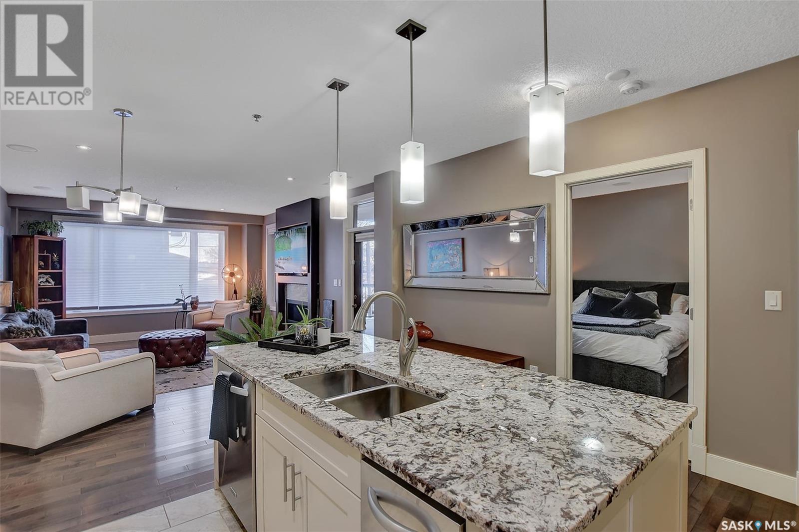 Welcome to Terrace East located in the heart of Moose Jaw. You will be impressed by the exterior curb appeal and further impressed when you enter this beautiful building. This one bedroom southern exposed condo is bright with white kitchen cabinetry and cheery atmosphere. Kitchen is equipped with stainless steel appliances and stone countertops. Both living room and dining area contains beautiful hardwood floors plus gas fireplace in living room. Enjoy the large walk in closet plus bathroom access from bedroom and hallway. Bathroom boasts an expensive tub/shower combination for your convenience. Surround sound allows flow of music in all the rooms. A large balcony for summertime enjoyment is complete with natural gas barbecue hook up. This building offers a library, fitness room, guest suite and common room for resident gatherings or private functions. The reasonable condo fee includes heat, water, building insurance and exterior maintenance. Each unit has a heated parking space and large storage unit. If you are looking for a maintenance free lifestyle this could be the perfect new home for you. This is a very solidly built secure building located across from Crescent Park and close to so many downtown amenities. Just move in and enjoy! Pets allowed with restrictions, (Dogs are not allowed). Call for your personal viewing today. (id:22211)