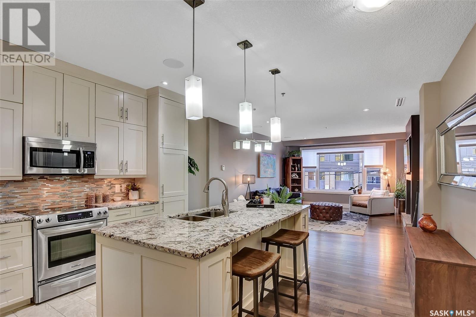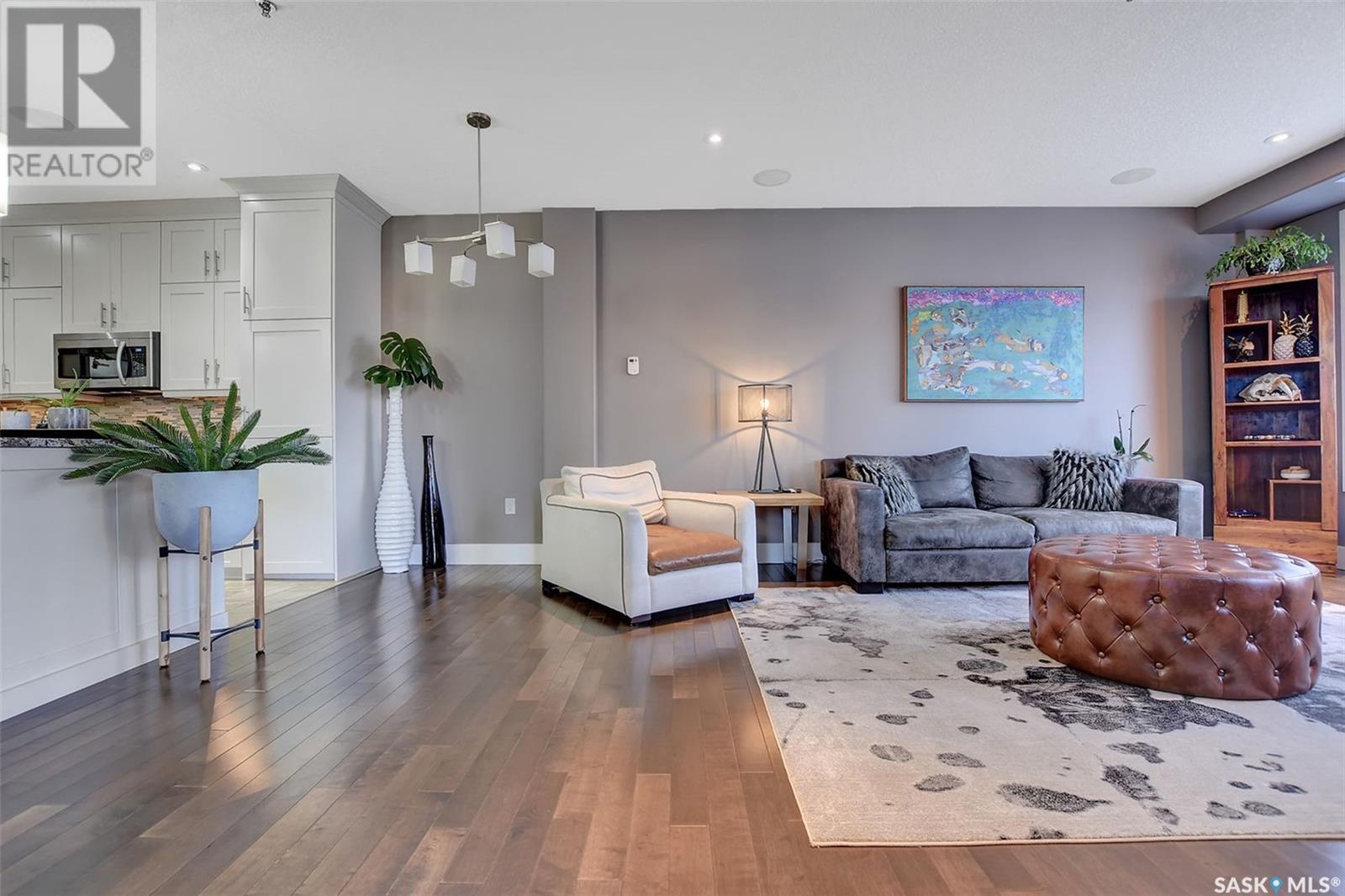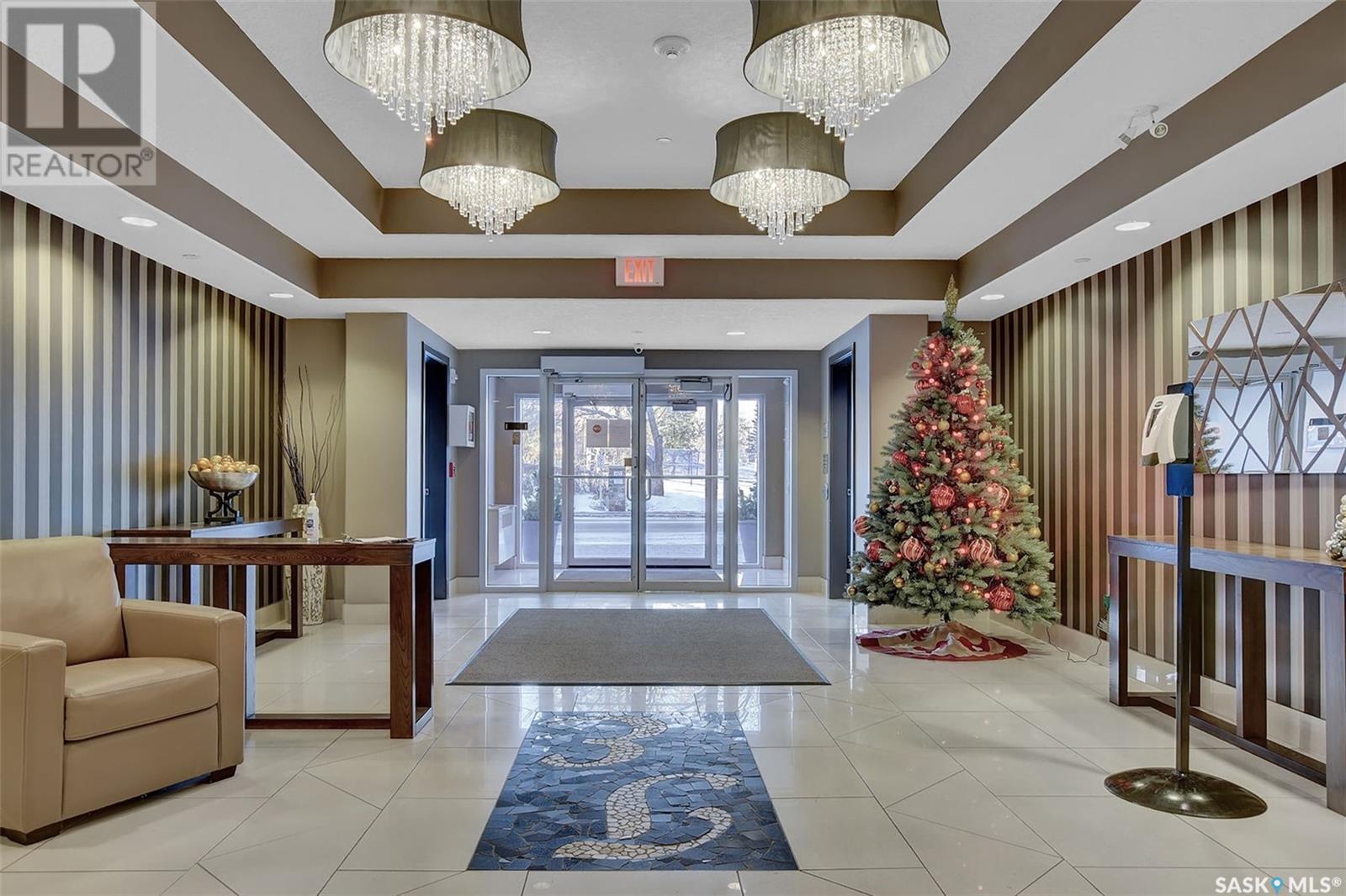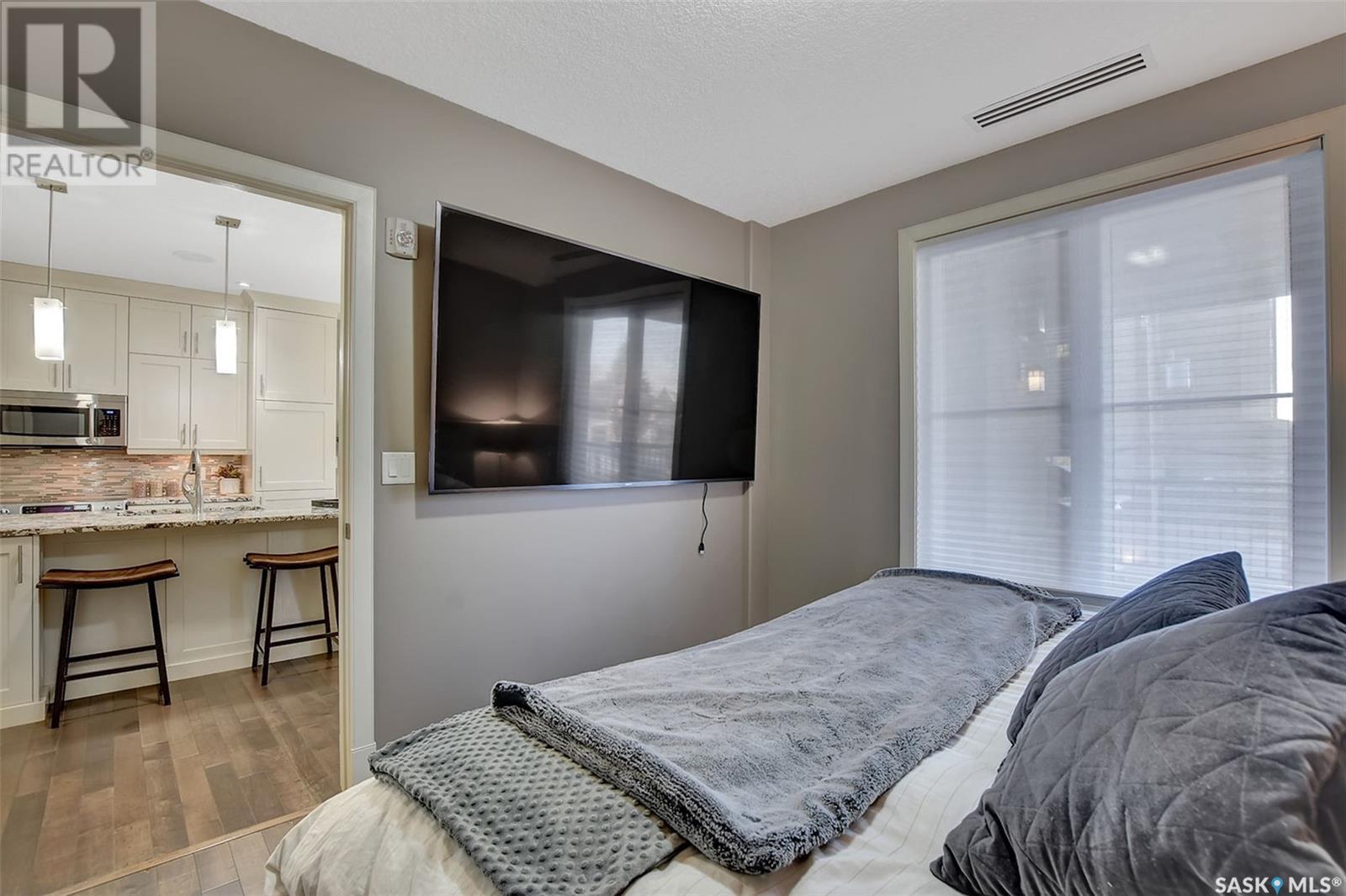 Welcome to Terrace East located in the heart of Moose Jaw. You will be impressed by the exterior curb appeal and further impressed when you enter this beautiful building. This one bedroom southern exposed condo is bright with white kitchen cabinetry and cheery atmosphere. Kitchen is equipped with stainless steel appliances and stone countertops. Both living room and dining area contains beautiful hardwood floors plus gas fireplace in living room. Enjoy the large walk in closet plus bathroom access from bedroom and hallway. Bathroom boasts an expensive tub/shower combination for your convenience. Surround sound allows flow of music in all the rooms. A large balcony for summertime enjoyment is complete with natural gas barbecue hook up. This building offers a library, fitness room, guest suite and common room for resident gatherings or private functions. The reasonable condo fee includes heat, water, building insurance and exterior maintenance. Each unit has a heated parking space and large storage unit. If you are looking for a maintenance free lifestyle this could be the perfect new home for you. This is a very solidly built secure building located across from Crescent Park and close to so many downtown amenities. Just move in and enjoy! Pets allowed with restrictions, (Dogs are not allowed). Call for your personal viewing today. (id:22211)