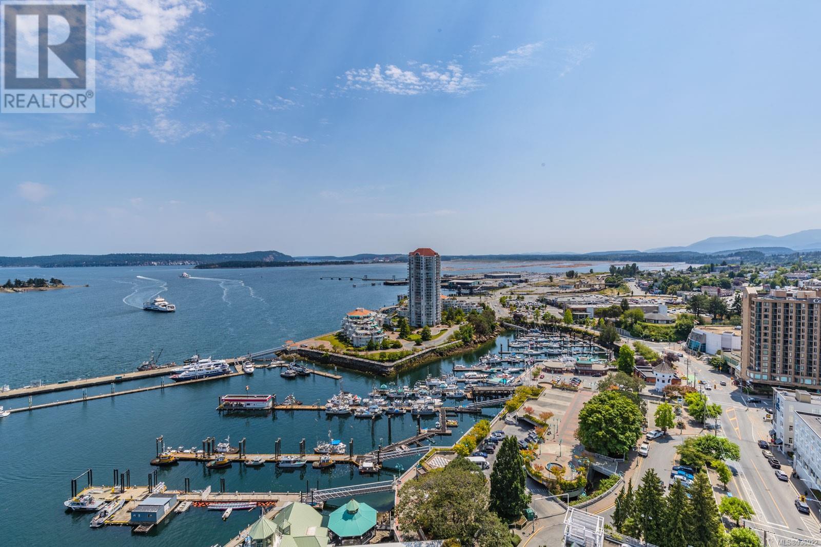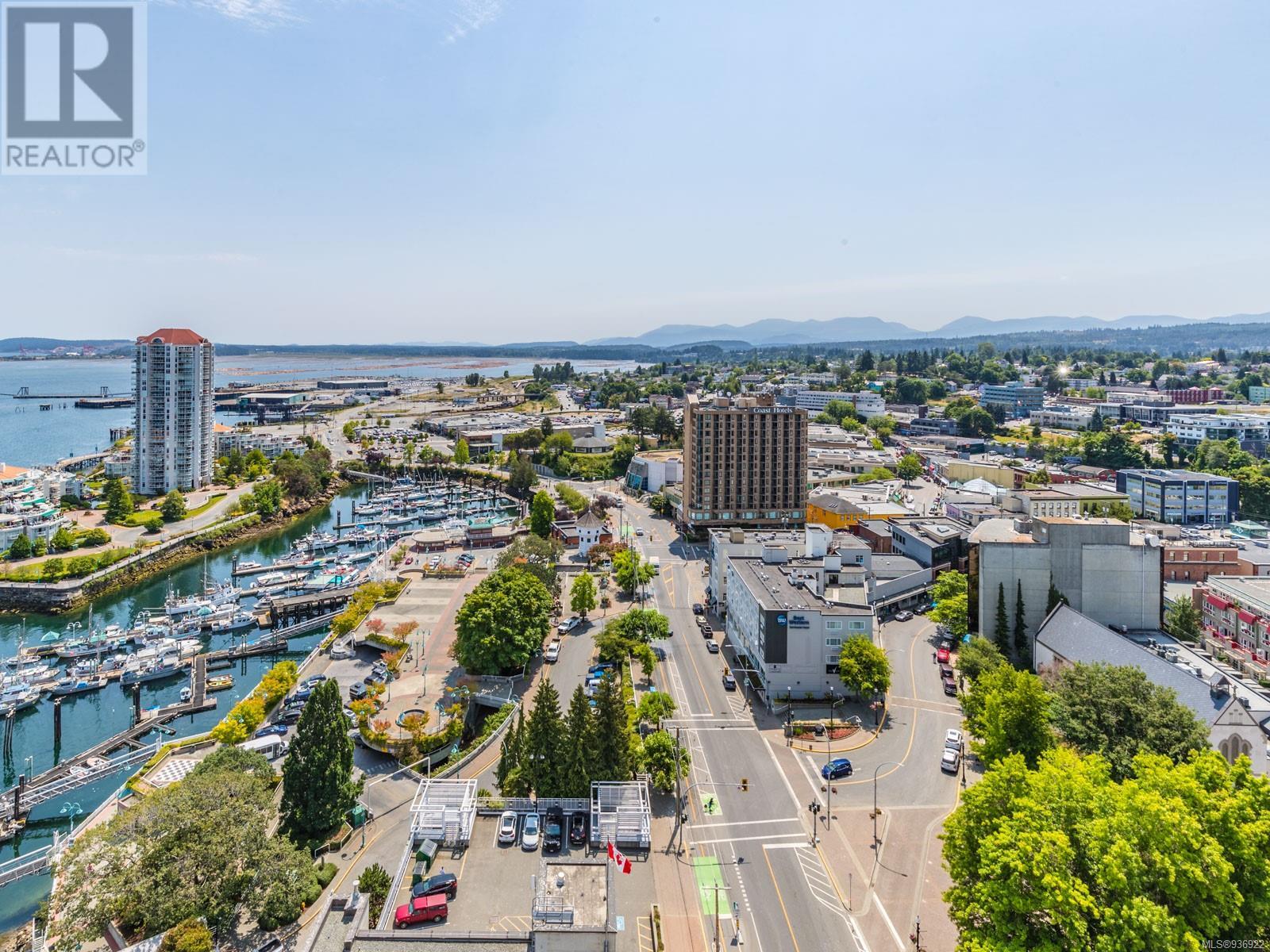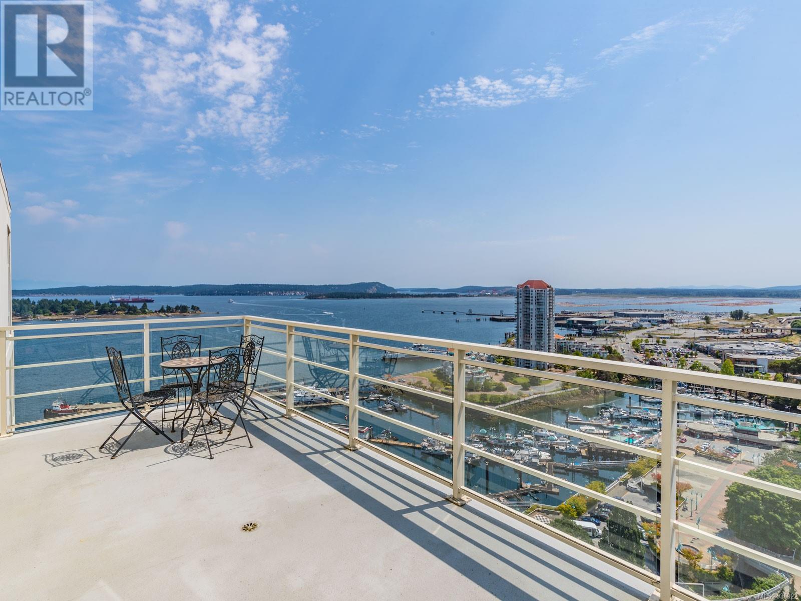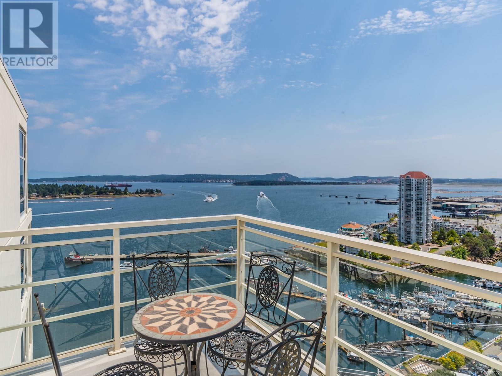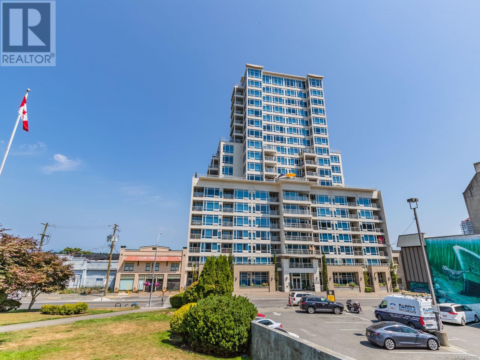 Top Floor Penthouse unit with soaring 10 foot ceilings! Welcome home to the Pacifica - Nanaimo's premiere Waterfront condominium. This unit features spectacular City, Mountain & Ocean views overlooking the inner harbour towards Gabriola Island. The open-concept living space & both bedrooms boast floor to ceiling windows. The kitchen features a Natural Gas range, granite countertops, high-end s/s appliances & honey teak inspired cabinetry. The large primary bedroom includes a Walk in closet & 4 piece ensuite w/ granite counters, double sink & a tiled shower. With 90 degree floor to ceiling windows on two sides, you have the best sights that the Harbour City has to offer. This unit features a large deck directly off the living room & facing the ocean & city. Ideally situated in Nanaimo's downtown core with entertainment, restaurants, shopping & all amenities just steps away including the waterfront walk way. Msmts approx., pls verify if important. (id:22211)