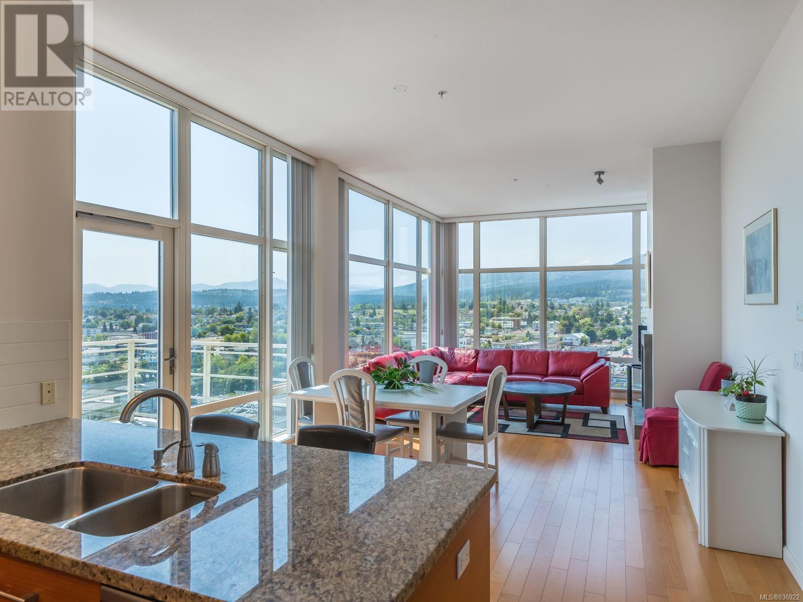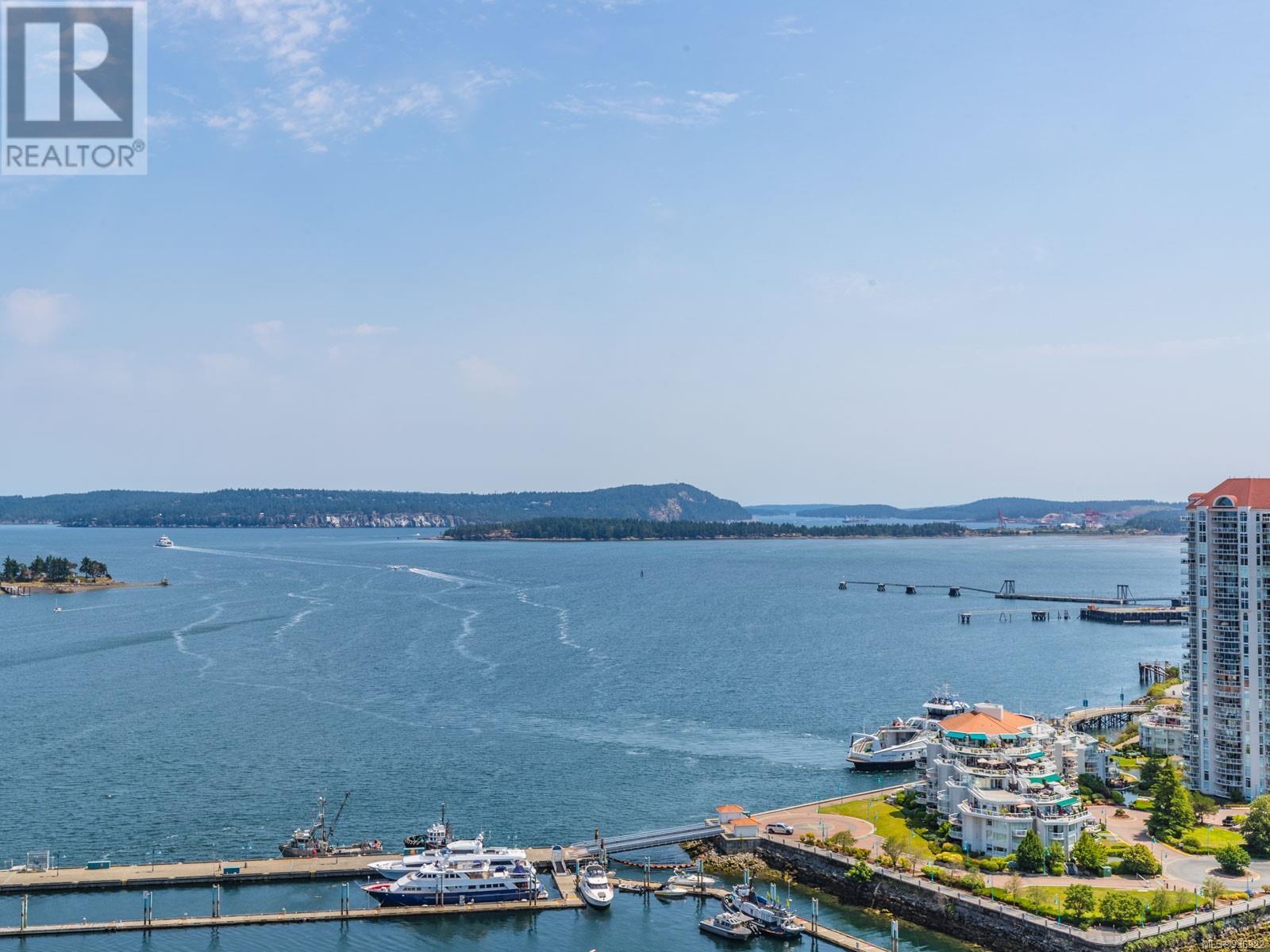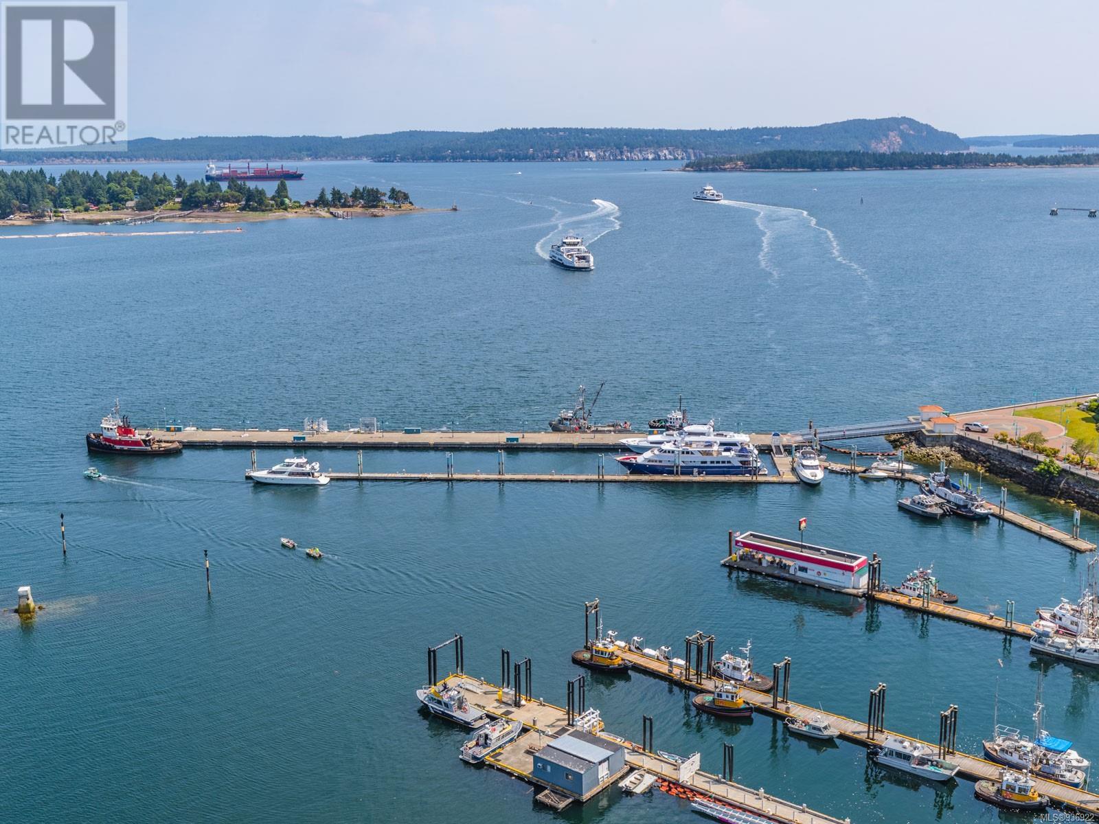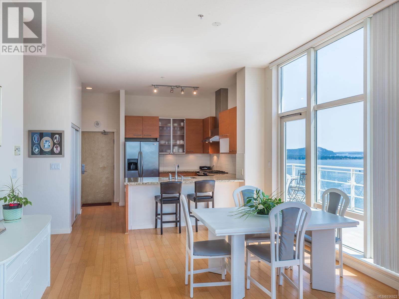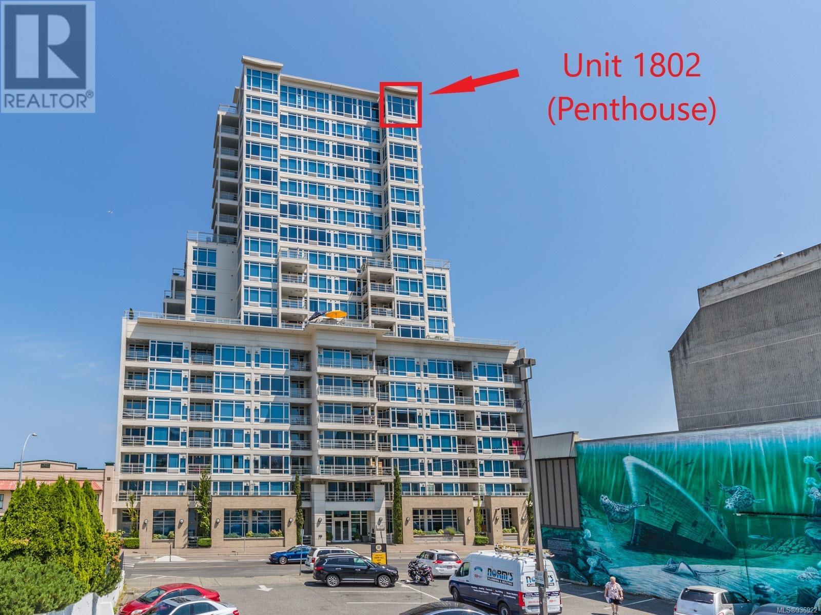 Top Floor Penthouse unit with soaring 10 foot ceilings! Welcome home to the Pacifica - Nanaimo's premiere Waterfront condominium. This unit features spectacular City, Mountain & Ocean views overlooking the inner harbour towards Gabriola Island. The open-concept living space & both bedrooms boast floor to ceiling windows. The kitchen features a Natural Gas range, granite countertops, high-end s/s appliances & honey teak inspired cabinetry. The large primary bedroom includes a Walk in closet & 4 piece ensuite w/ granite counters, double sink & a tiled shower. With 90 degree floor to ceiling windows on two sides, you have the best sights that the Harbour City has to offer. This unit features a large deck directly off the living room & facing the ocean & city. Ideally situated in Nanaimo's downtown core with entertainment, restaurants, shopping & all amenities just steps away including the waterfront walk way. Msmts approx., pls verify if important. (id:22211)