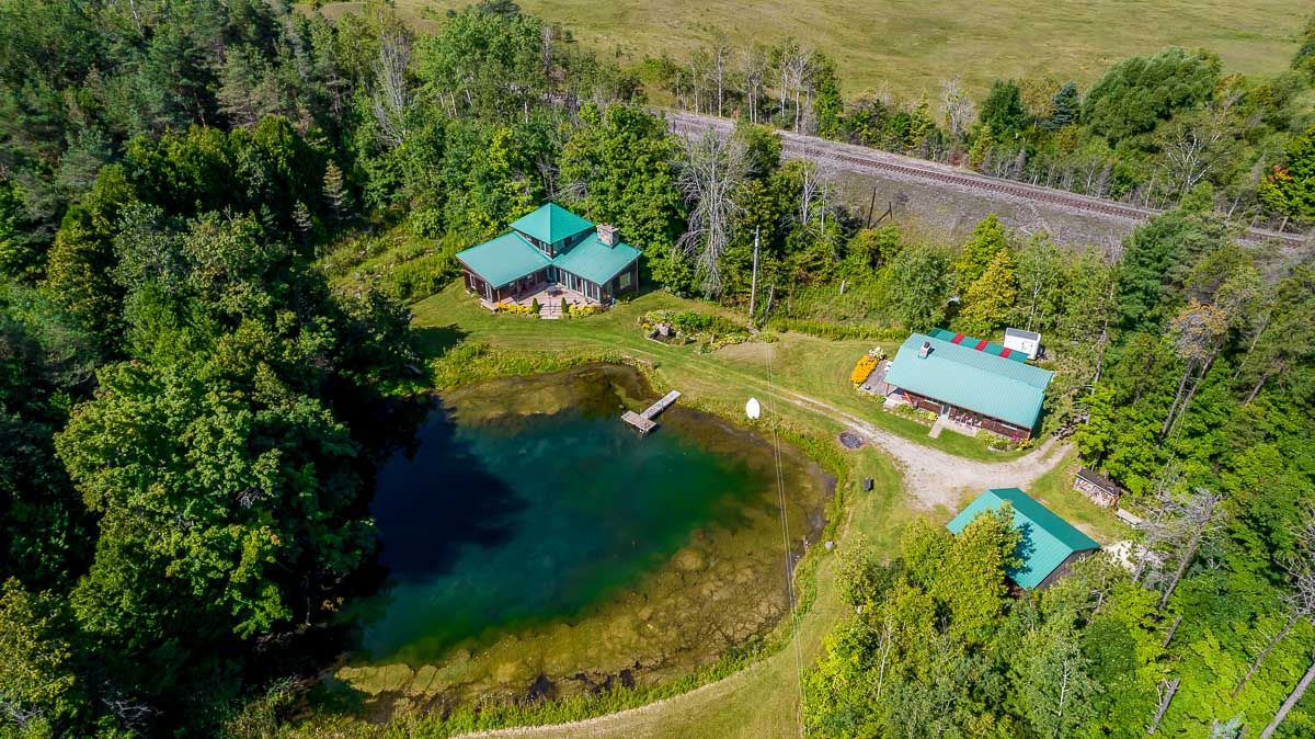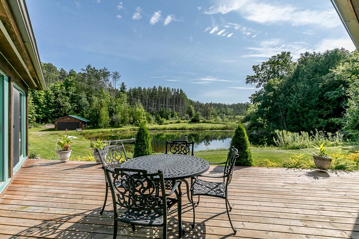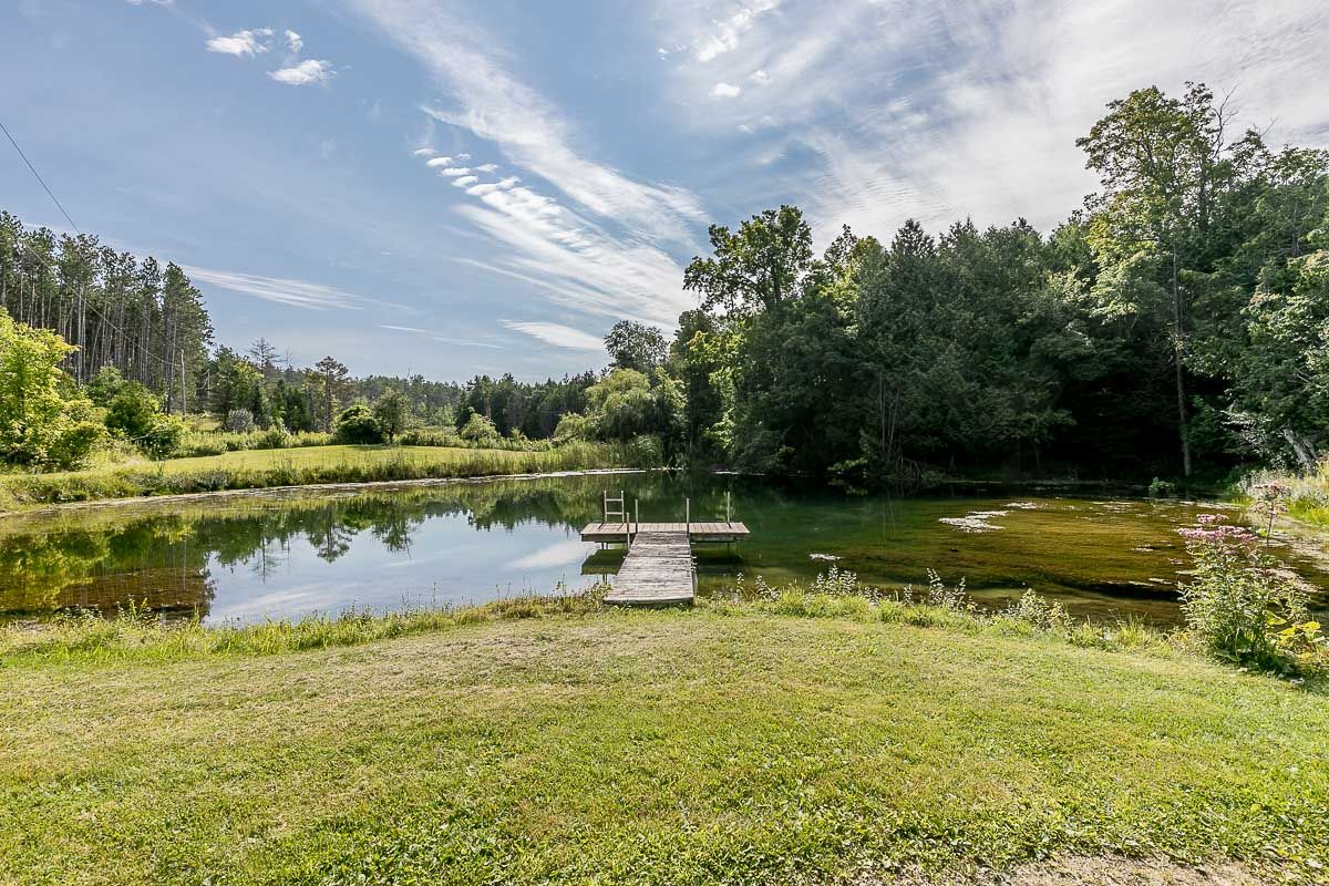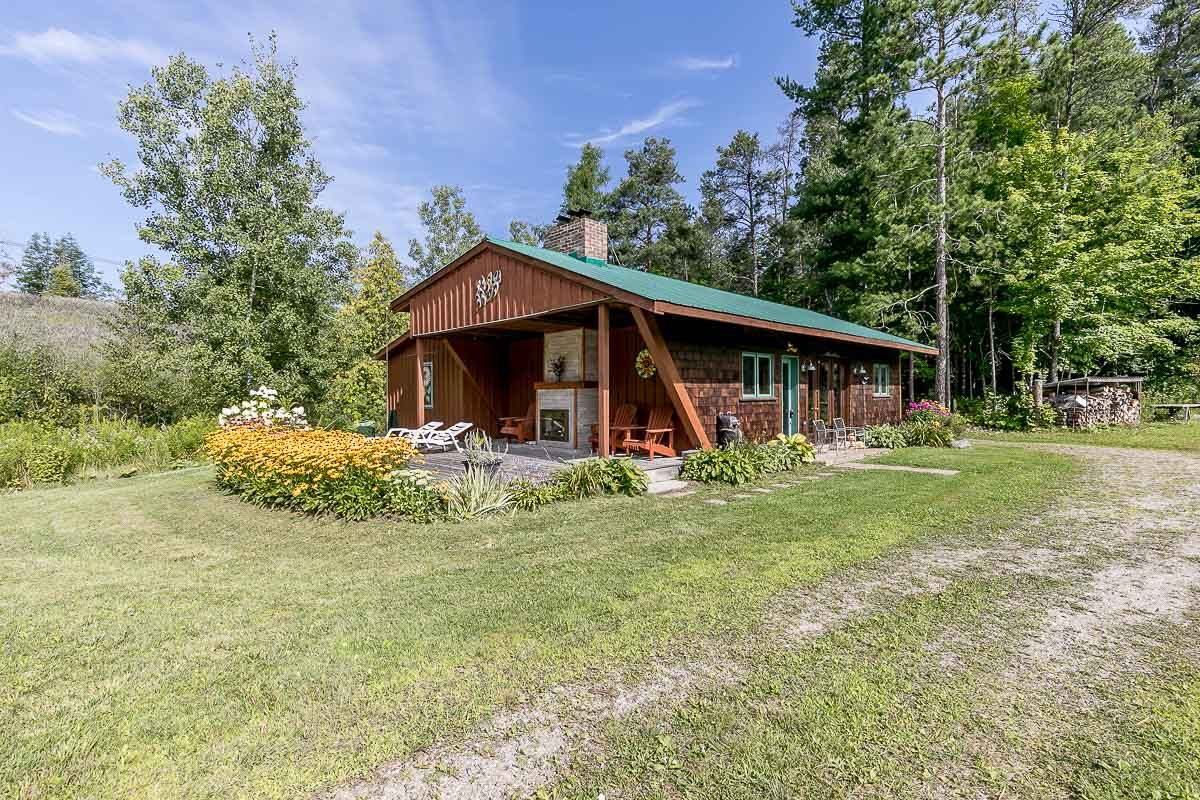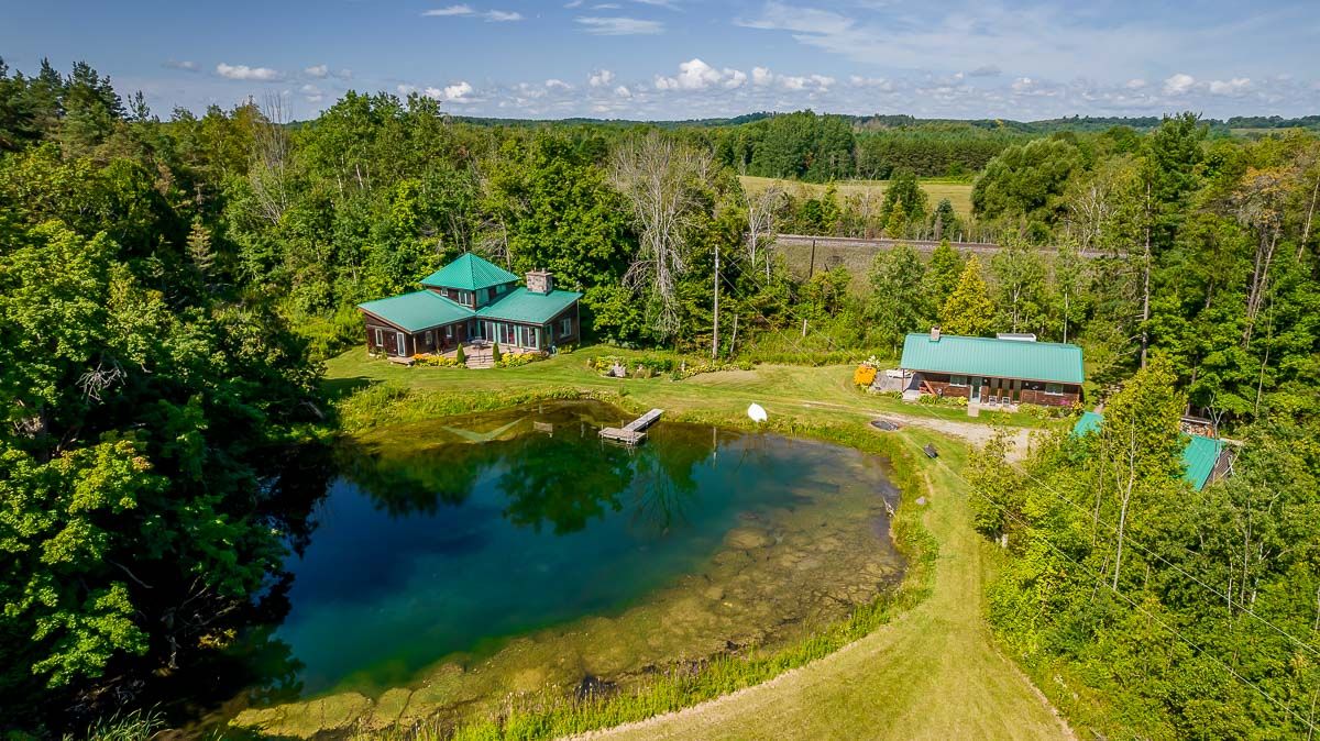 50+ acre parklike setting. Enjoy trails, spring fed pond, babbling brook and privacy at its finest. Four season 1.5 Storey with 1.5 baths, 2 bedrooms plus a loft. Separate studio like building with a mostly finished 3pc bath. Very accessible, being 1 minute from highway 9 between 50 & 27. Make this your weekend getaway or an Airbnb hot spot.