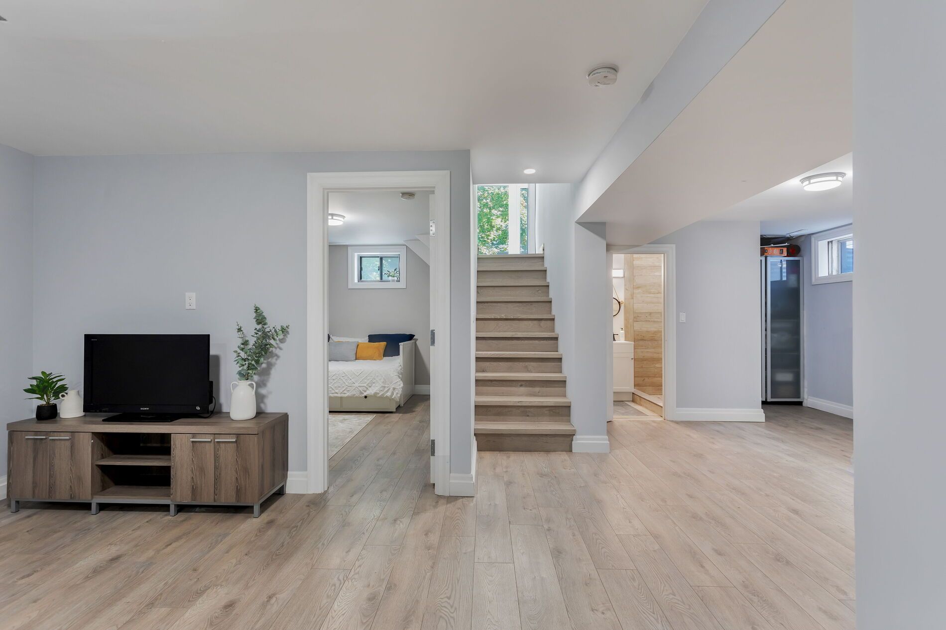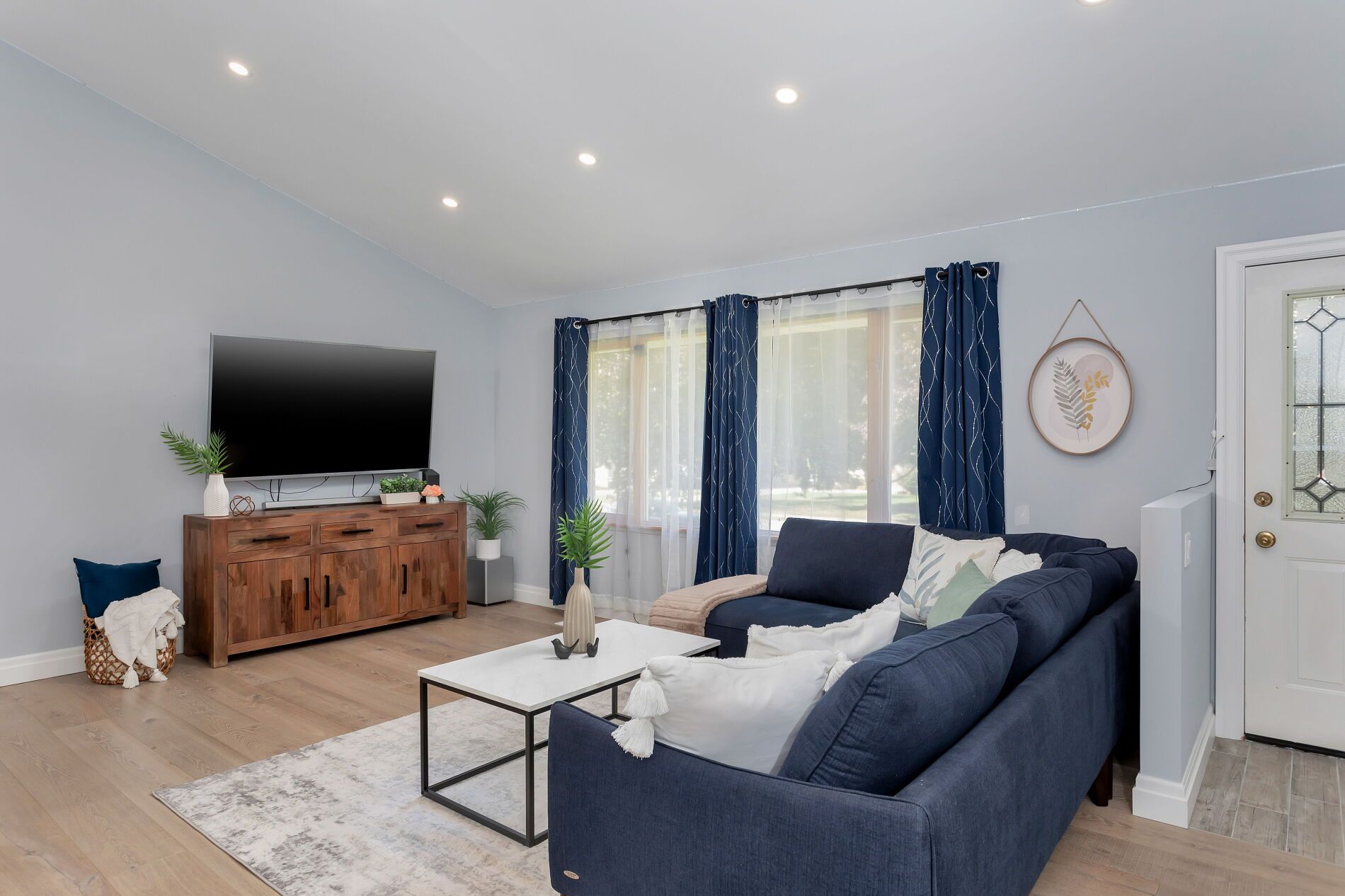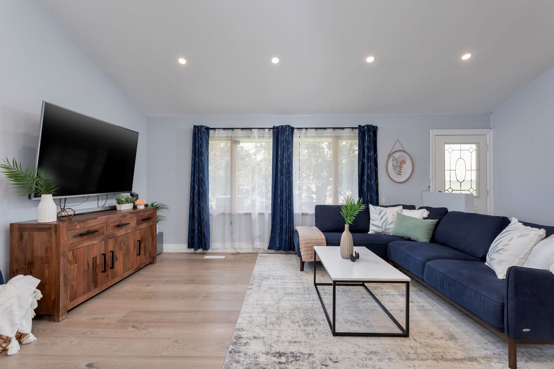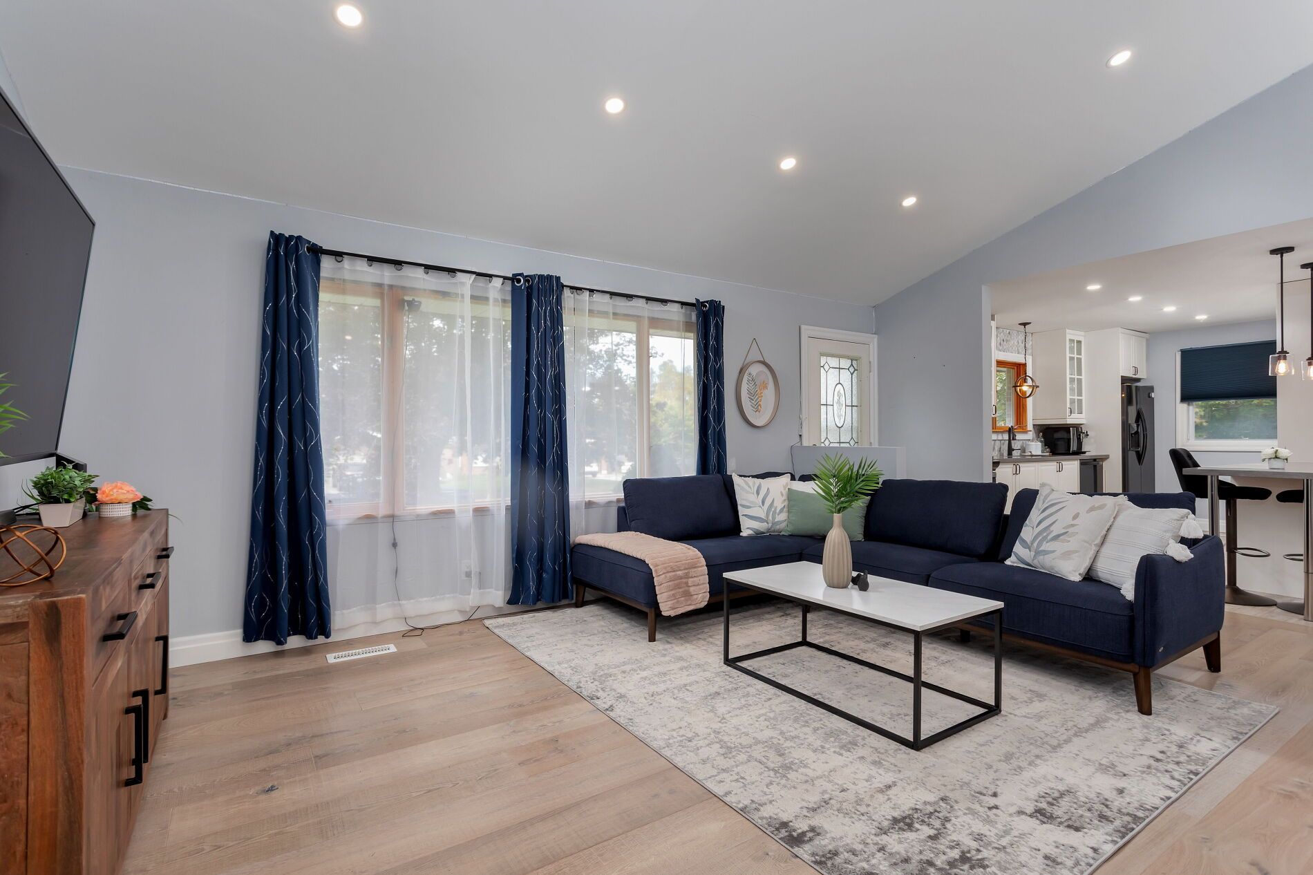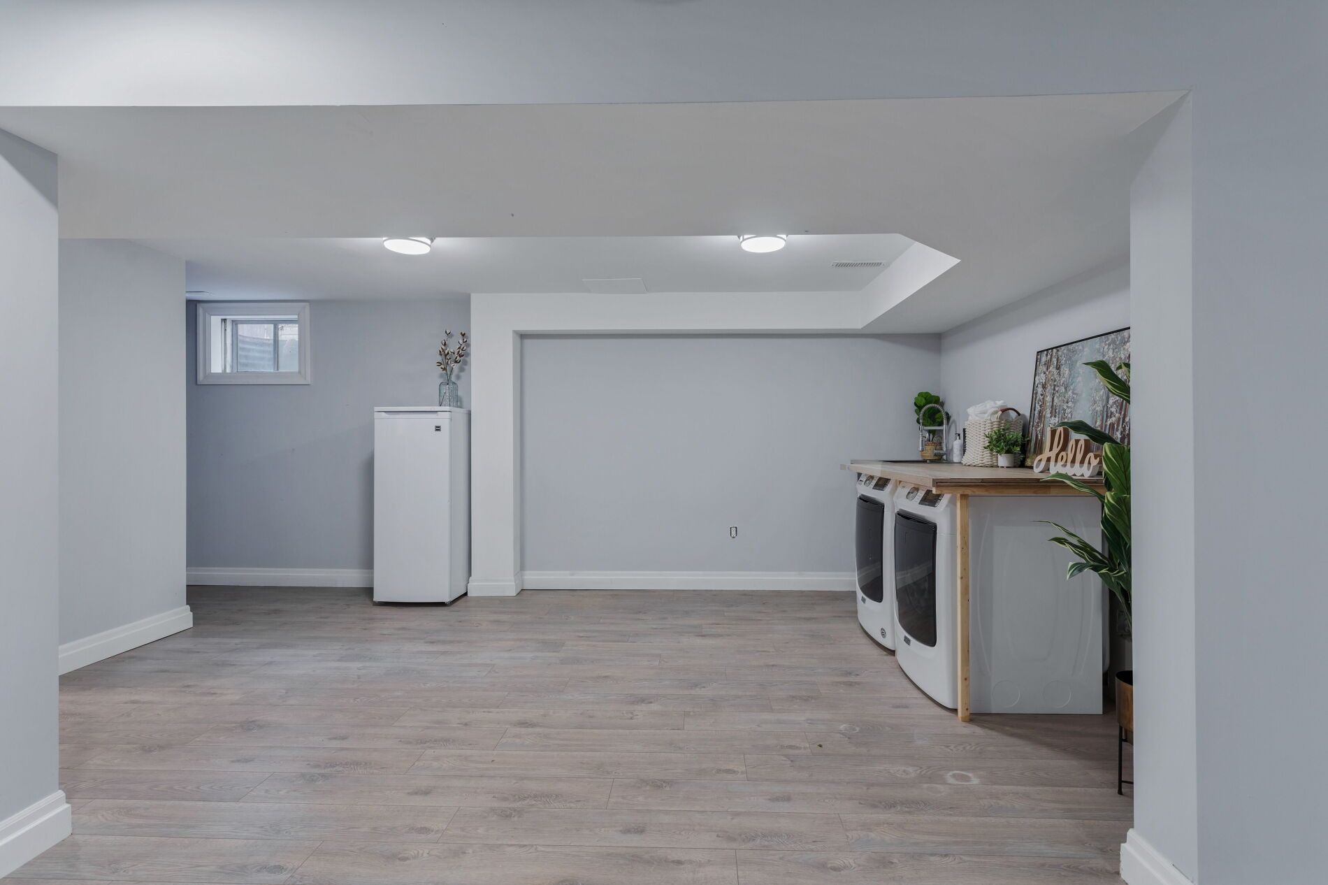 This spectacular bungalow boasts an astonishing interior living area with a brand-new and open-concept kitchen. No corner has been left untouched in this full-scale renovation. New insulation, dry walls, and vapor barriers. Complete with engineered 8.25" hand-scraped hardwoods, new baseboards, and trims. The intriguing cathedral ceiling elevates the space to new heights. Solid, heavy-duty doors further enhance the luxurious appeal.Embrace the full spa experience in the bthr fitted with a freestanding soaker tub, a walk-in shower a rain shower head, modern matte black finishes,& a linear drain. Experience the charm of the vaulted ceilings and chandelier is a perfect finishing touch to this delightful retreat. Backyard made for both relaxation and play. With a playground and a newly fenced North side, you can sit back &enjoy your outdoor space. The sunroom - which doubles as a mudroom. Exhibiting new tiles and fresh paint, this addition beautifully seals the allure of this suburban gem.Existing Black Stainless Steel Appliances: Double Door Fridge, Gas Stove, Hood Fan, Built-in Dishwasher. Washer and Dryer Machines.