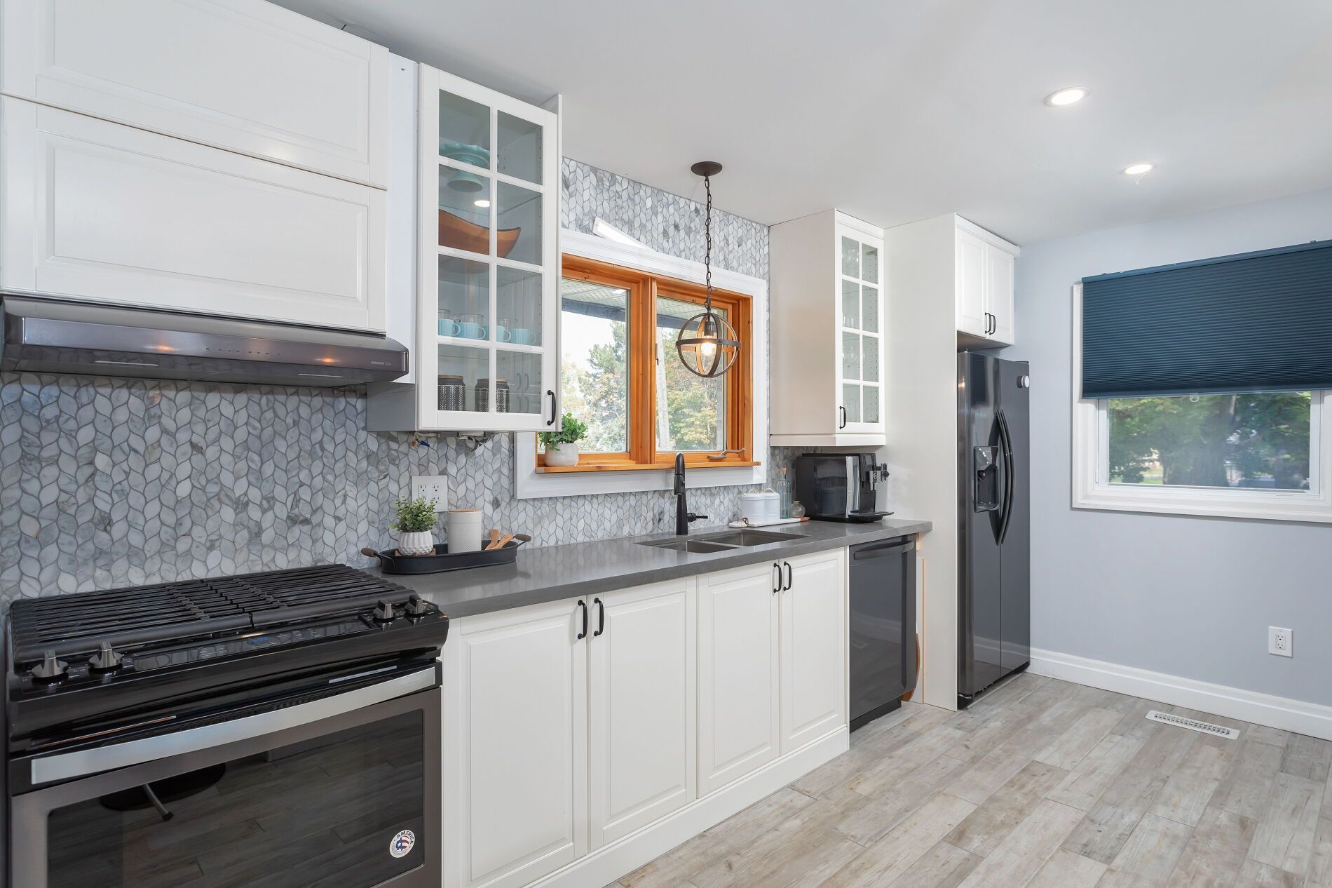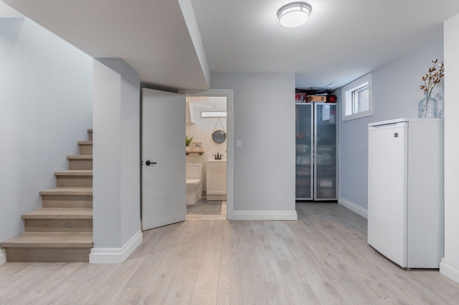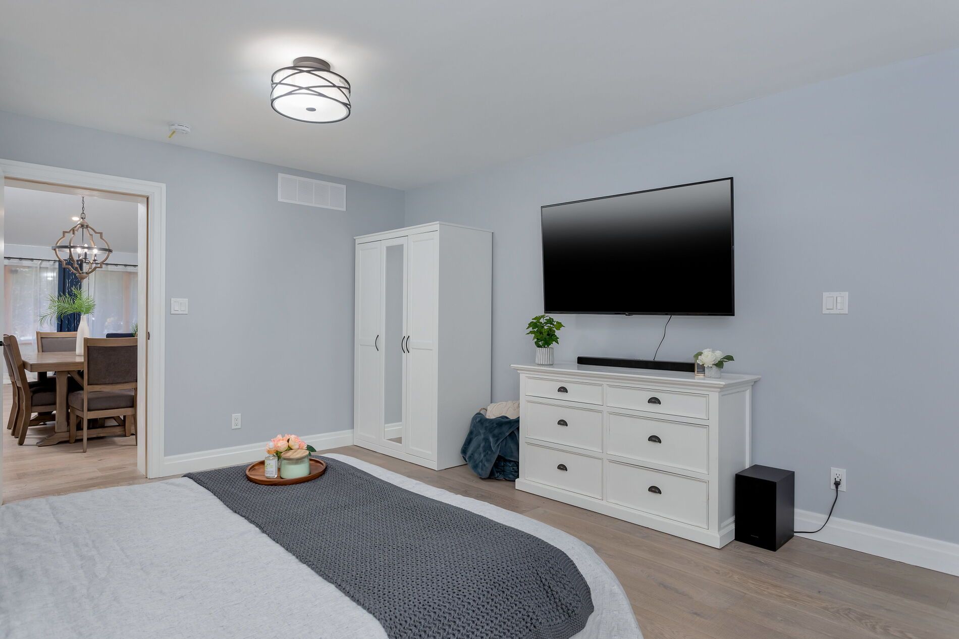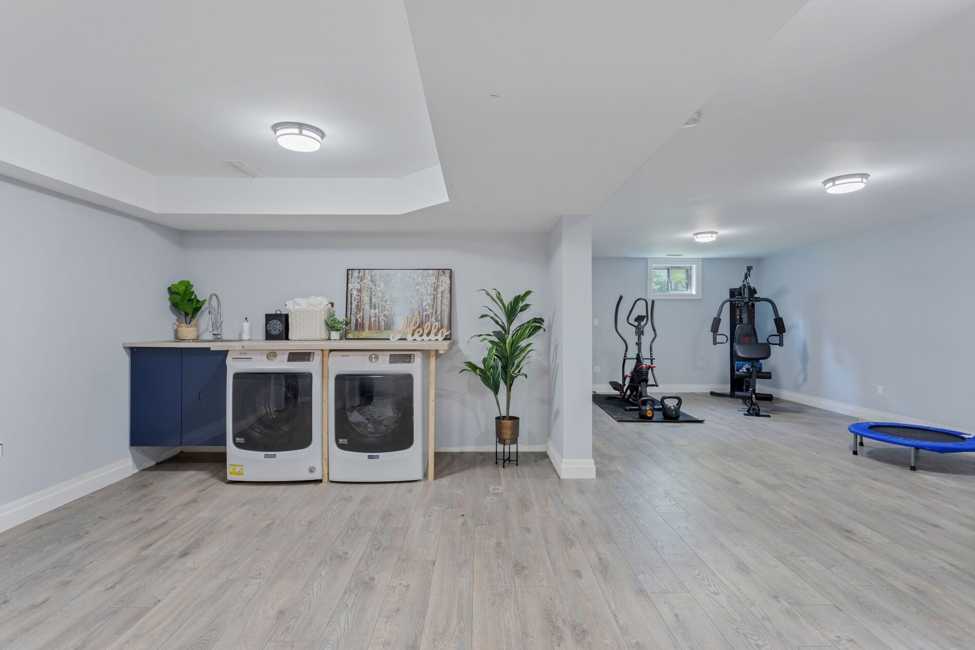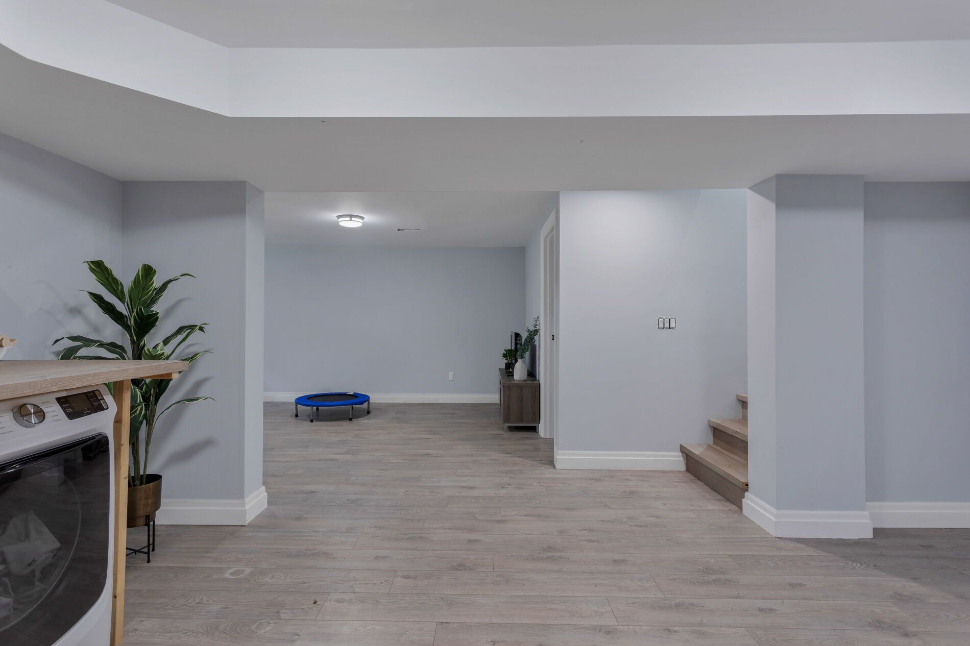 This spectacular bungalow boasts an astonishing interior living area with a brand-new and open-concept kitchen. No corner has been left untouched in this full-scale renovation. New insulation, dry walls, and vapor barriers. Complete with engineered 8.25" hand-scraped hardwoods, new baseboards, and trims. The intriguing cathedral ceiling elevates the space to new heights. Solid, heavy-duty doors further enhance the luxurious appeal.Embrace the full spa experience in the bthr fitted with a freestanding soaker tub, a walk-in shower a rain shower head, modern matte black finishes,& a linear drain. Experience the charm of the vaulted ceilings and chandelier is a perfect finishing touch to this delightful retreat. Backyard made for both relaxation and play. With a playground and a newly fenced North side, you can sit back &enjoy your outdoor space. The sunroom - which doubles as a mudroom. Exhibiting new tiles and fresh paint, this addition beautifully seals the allure of this suburban gem.Existing Black Stainless Steel Appliances: Double Door Fridge, Gas Stove, Hood Fan, Built-in Dishwasher. Washer and Dryer Machines.