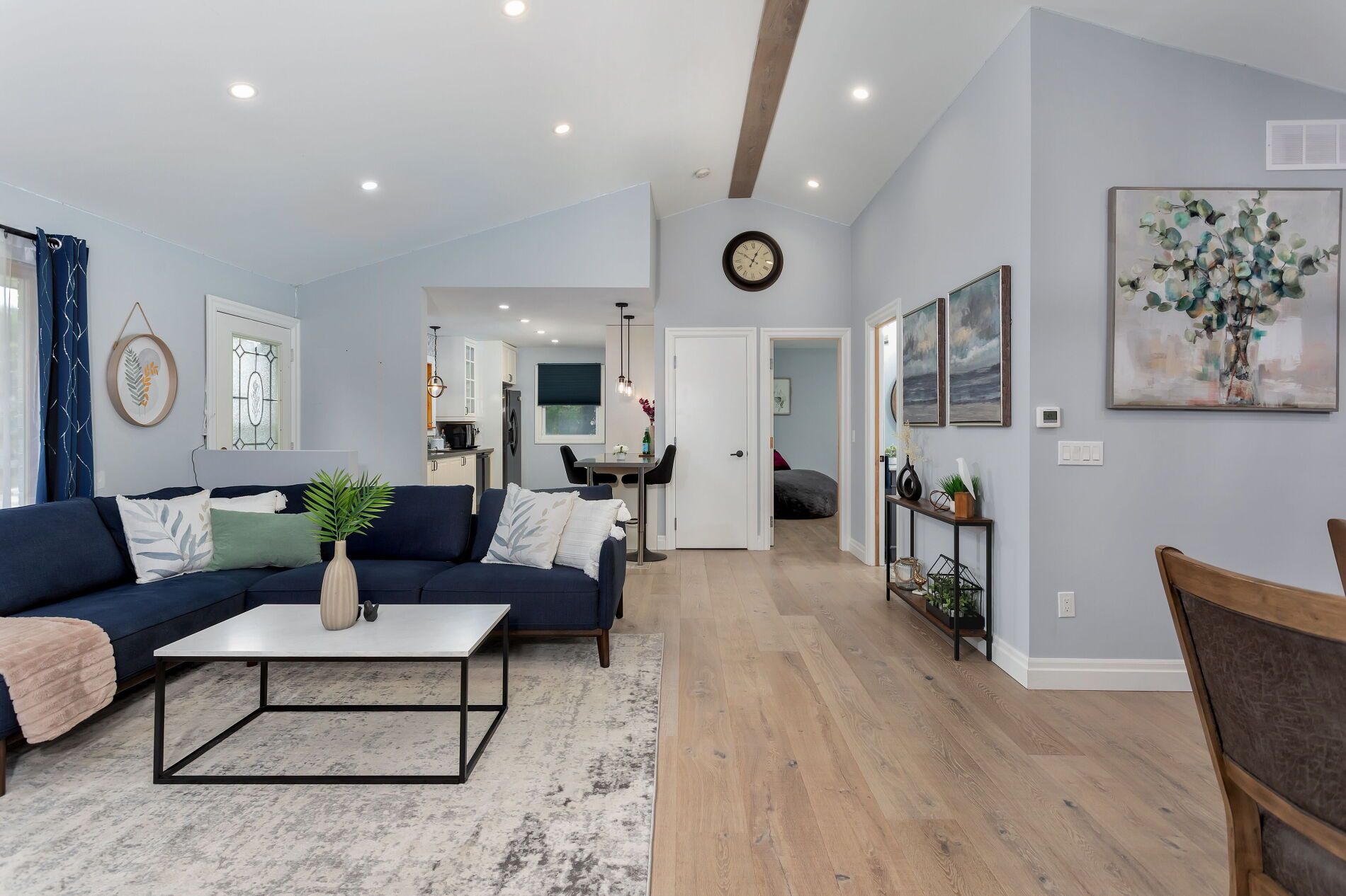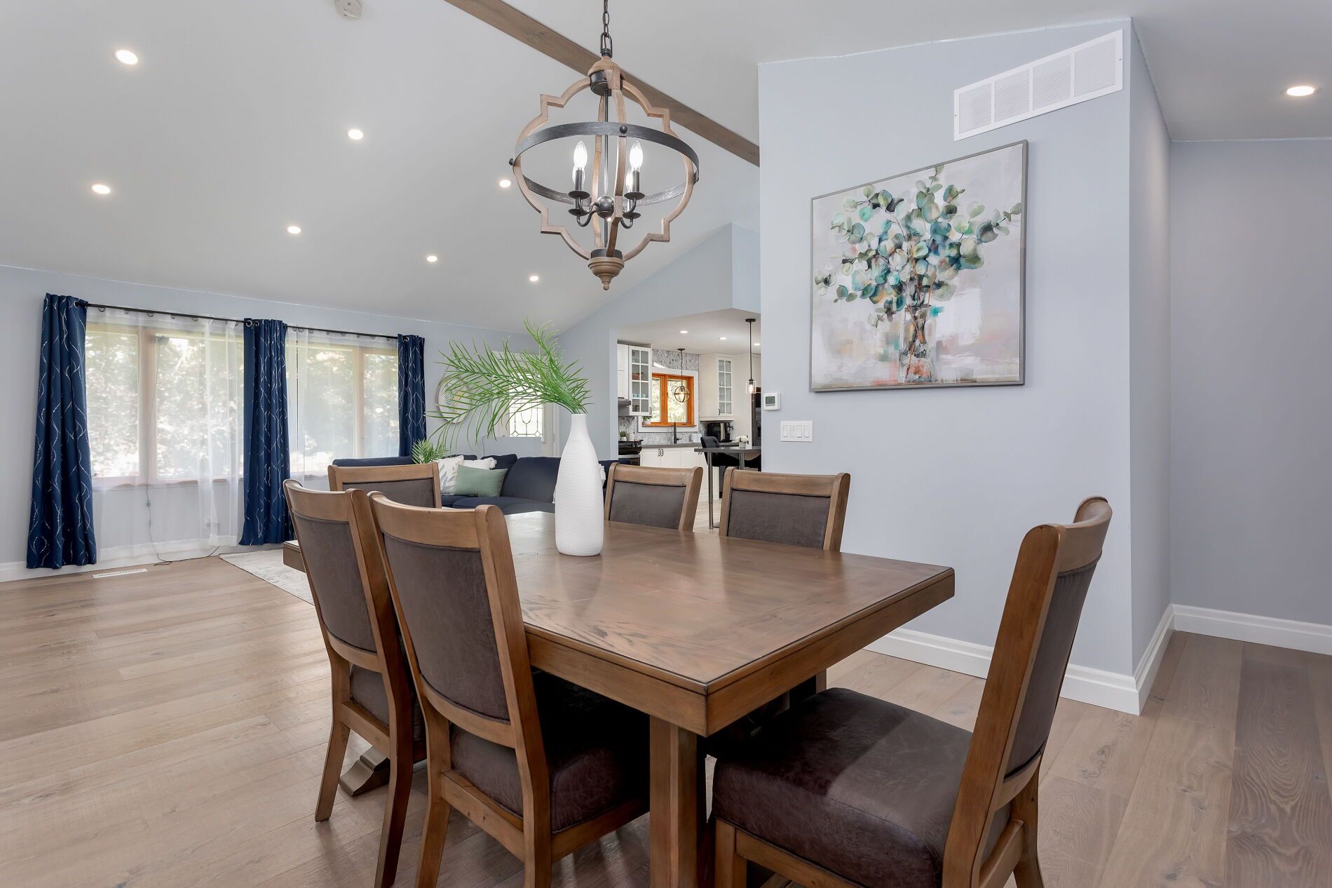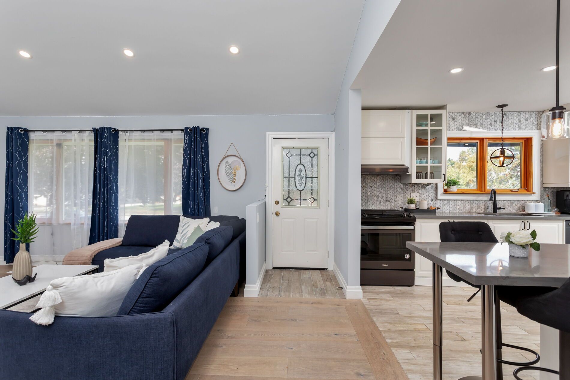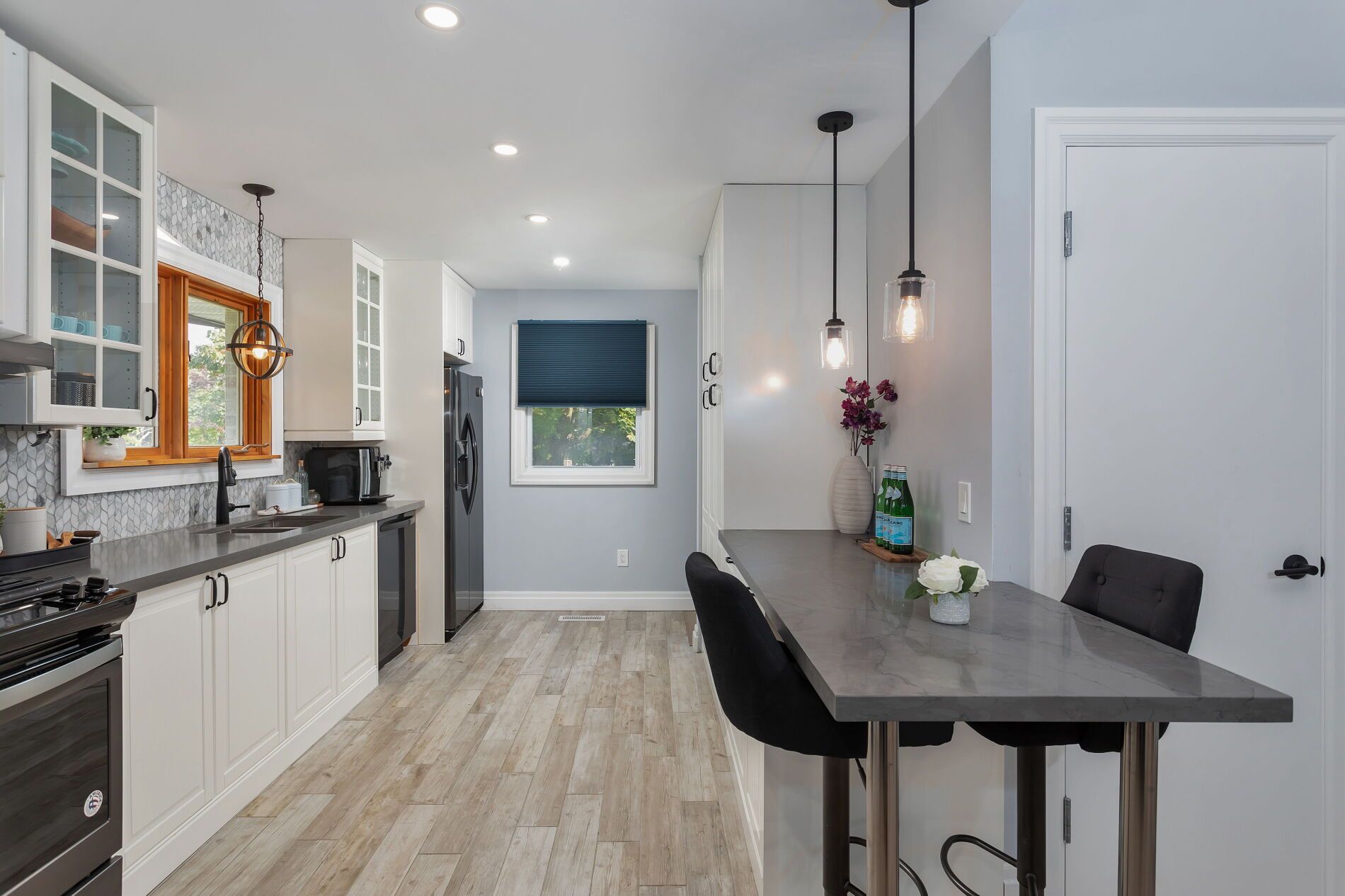 This spectacular bungalow boasts an astonishing interior living area with a brand-new and open-concept kitchen. No corner has been left untouched in this full-scale renovation. New insulation, dry walls, and vapor barriers. Complete with engineered 8.25" hand-scraped hardwoods, new baseboards, and trims. The intriguing cathedral ceiling elevates the space to new heights. Solid, heavy-duty doors further enhance the luxurious appeal.Embrace the full spa experience in the bthr fitted with a freestanding soaker tub, a walk-in shower a rain shower head, modern matte black finishes,& a linear drain. Experience the charm of the vaulted ceilings and chandelier is a perfect finishing touch to this delightful retreat. Backyard made for both relaxation and play. With a playground and a newly fenced North side, you can sit back &enjoy your outdoor space. The sunroom - which doubles as a mudroom. Exhibiting new tiles and fresh paint, this addition beautifully seals the allure of this suburban gem.Existing Black Stainless Steel Appliances: Double Door Fridge, Gas Stove, Hood Fan, Built-in Dishwasher. Washer and Dryer Machines.