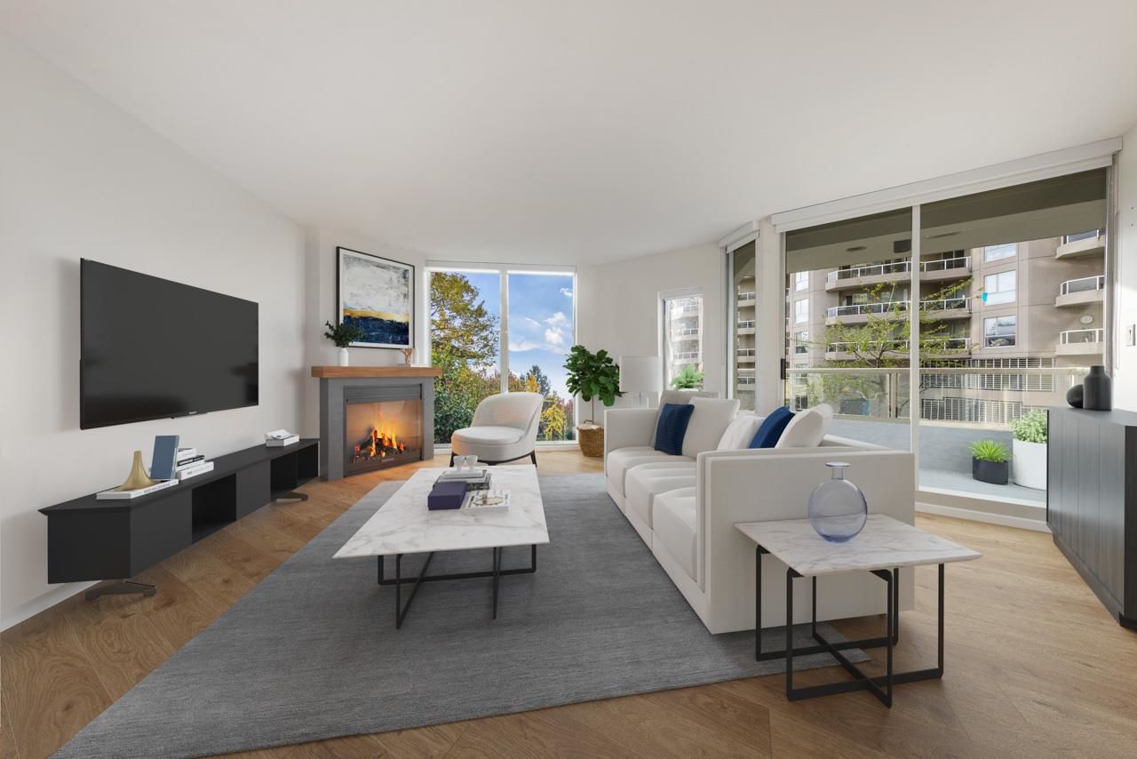 FULLY RENOVATED & spacious 1158sqft 2 bed, 2 bath in the Quay! This SW facing unit features plenty of light, winter water views & a modern floor plan that can fit your big furniture. The kitchen features new cabinets, quartz counters, Whirlpool appls & a modern layout with great storage and room for 3 barstools. The living room offers a cozy gas fireplace, big windows & access to the covered balcony. Extras include new blinds, quality flooring, flat ceilings & fully renovated bathrooms with modern fixtures & tiling. Also includes in suite laundry, 1 parking, 1 locker, gym, EV charging potential. Building has high CRF, updated piping & elevators. You're right on the Seawall for evening strolls, a short walk to Safeway, amenities & the Skytrain. Showings by appt - please contact me to view!