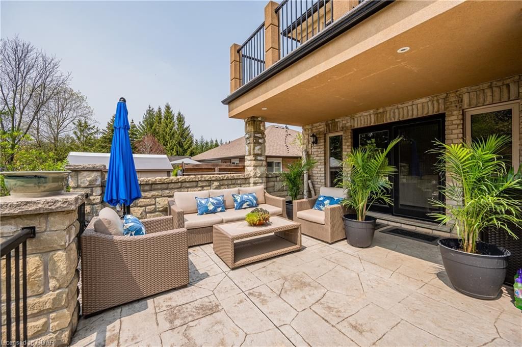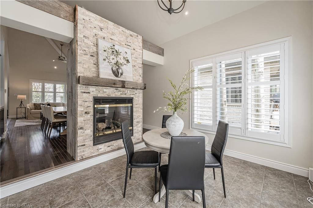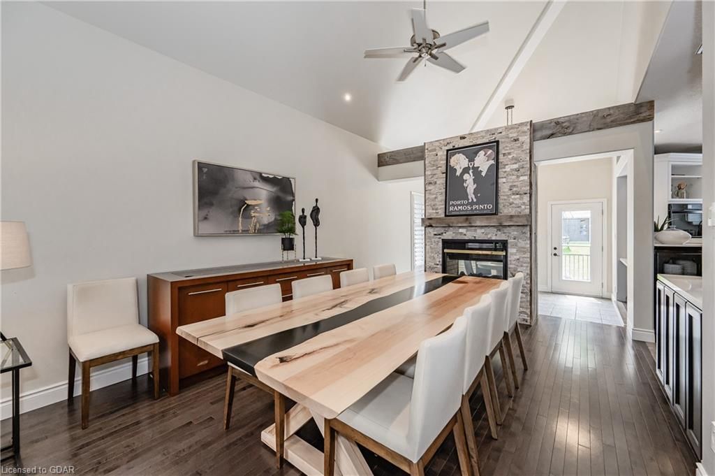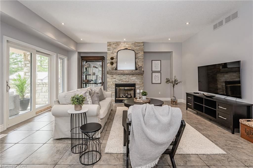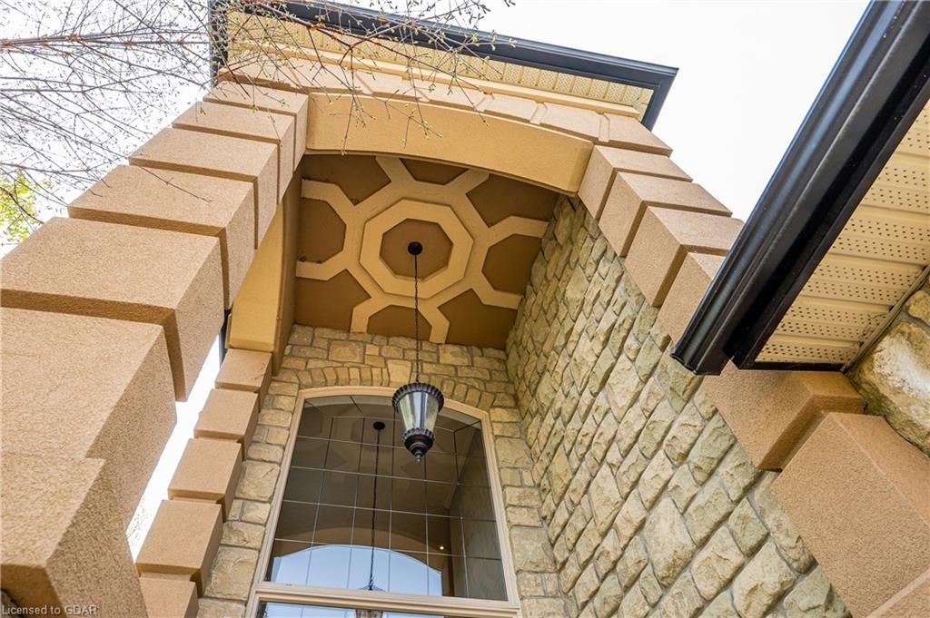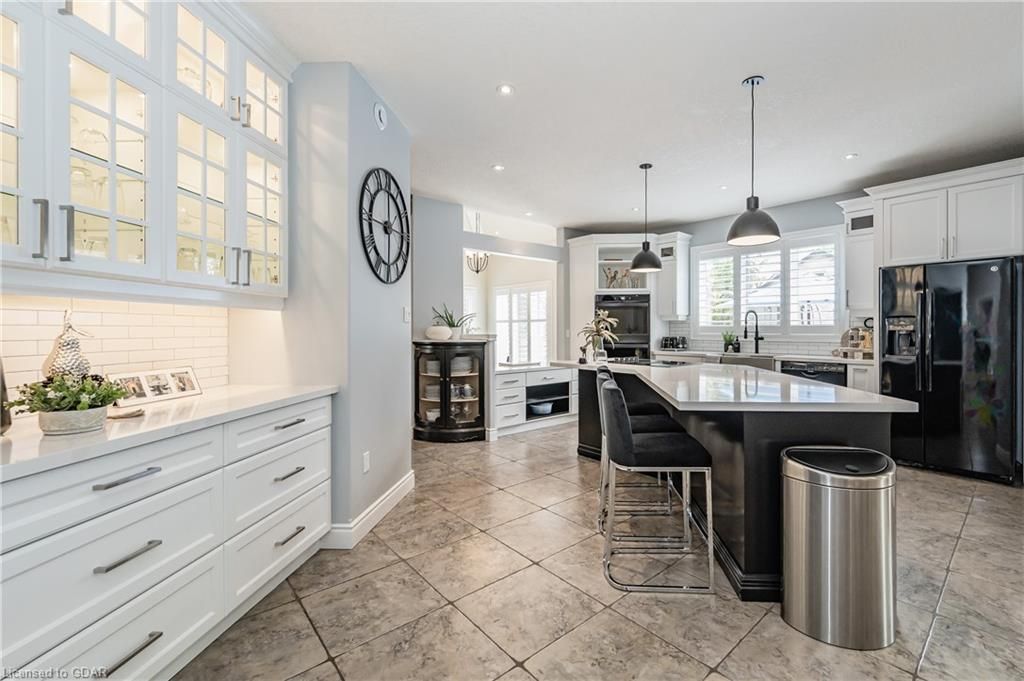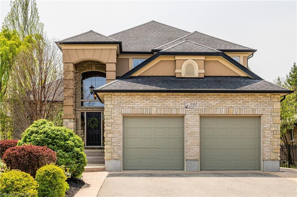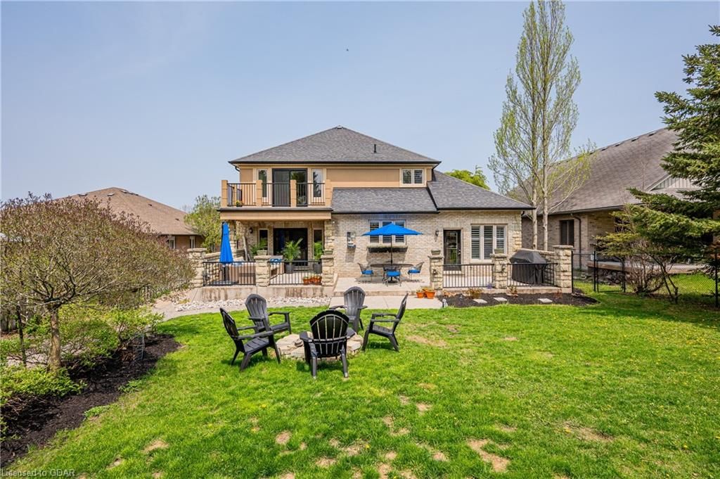 Nestled on a beautiful street in Ayr, this executive home offers just under 3000 sqft of living space. Extraordinary features include bullnosed corners, 9 ft ceilings on the main & lower level, a double sided stone fireplace, 3 additional fireplaces, 4 bathrooms w/heated floors, lighted kitchen cabinetry, double ovens, a Juliette balcony off of the primary, 3 additional bedrooms, California shutters, rustic & regal wooden mantels above the fireplaces, backyard views, & a main floor laundry room. Recently upgraded kitchen (2022) includes Ceasar stone counter tops, Jen-air cooktop, and trendy lighting. Separate wet bar area with access to the outdoors w/a natural gas bbq line. The exterior is a combination of stone, stucco & modern black accents, with easy to maintain landscaping. The backyard has a massive stamped concrete patio, partially covered and surrounded with stone pillars, and a brick building to be used as a gardeners shed, home office, or gym. Book your private showing today!