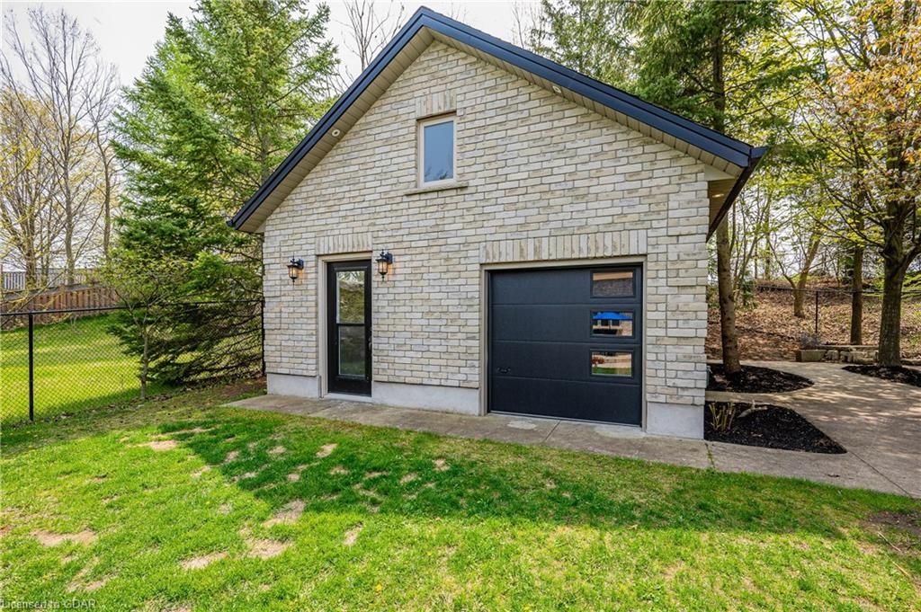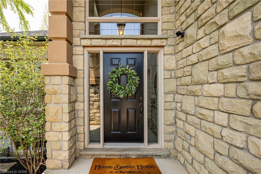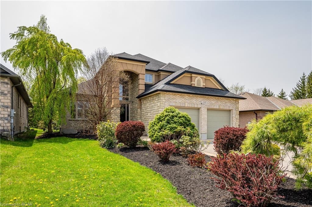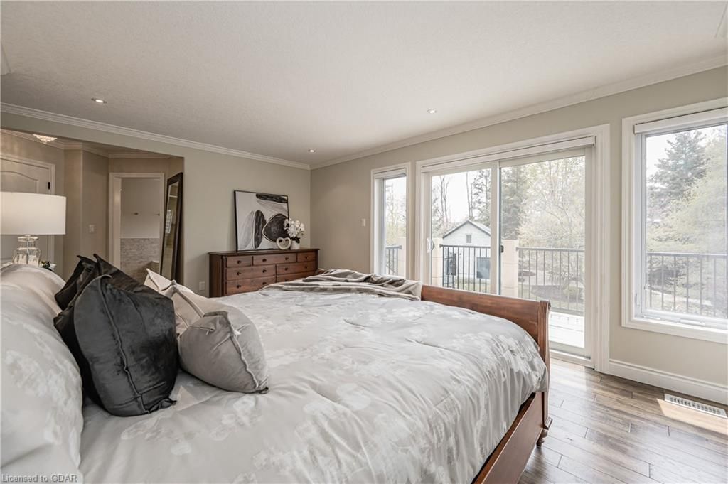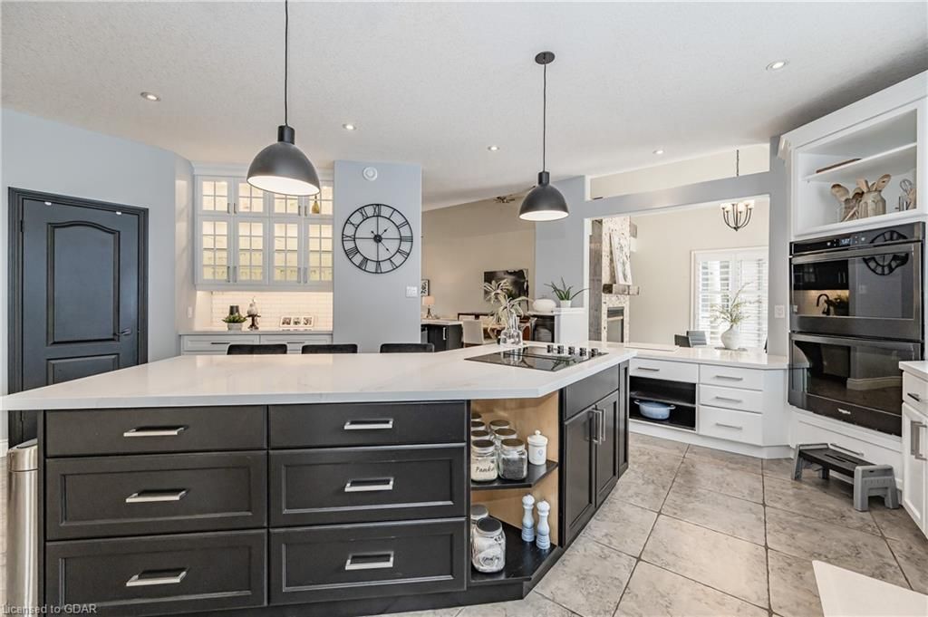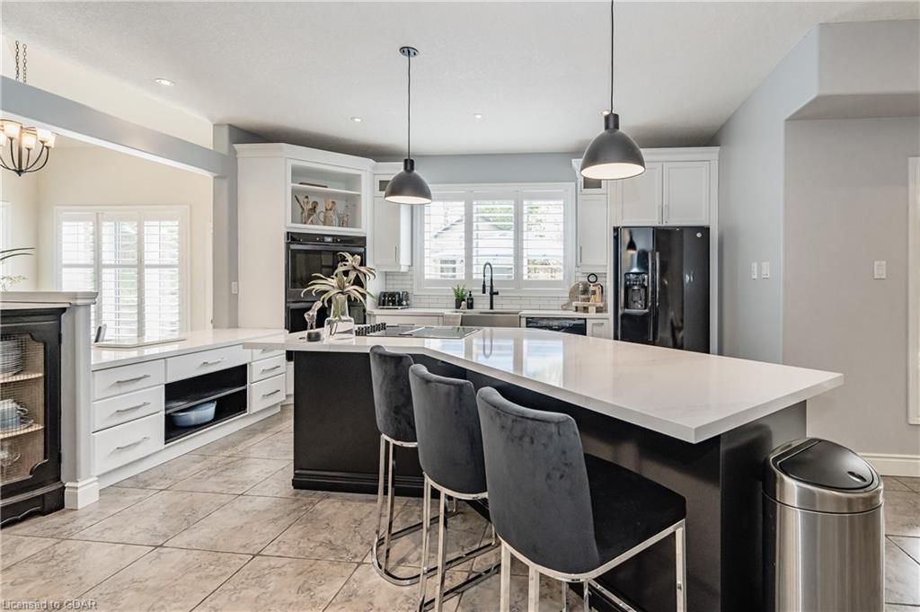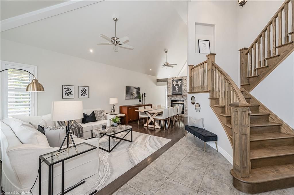 Nestled on a beautiful street in Ayr, this executive home offers just under 3000 sqft of living space. Extraordinary features include bullnosed corners, 9 ft ceilings on the main & lower level, a double sided stone fireplace, 3 additional fireplaces, 4 bathrooms w/heated floors, lighted kitchen cabinetry, double ovens, a Juliette balcony off of the primary, 3 additional bedrooms, California shutters, rustic & regal wooden mantels above the fireplaces, backyard views, & a main floor laundry room. Recently upgraded kitchen (2022) includes Ceasar stone counter tops, Jen-air cooktop, and trendy lighting. Separate wet bar area with access to the outdoors w/a natural gas bbq line. The exterior is a combination of stone, stucco & modern black accents, with easy to maintain landscaping. The backyard has a massive stamped concrete patio, partially covered and surrounded with stone pillars, and a brick building to be used as a gardeners shed, home office, or gym. Book your private showing today!