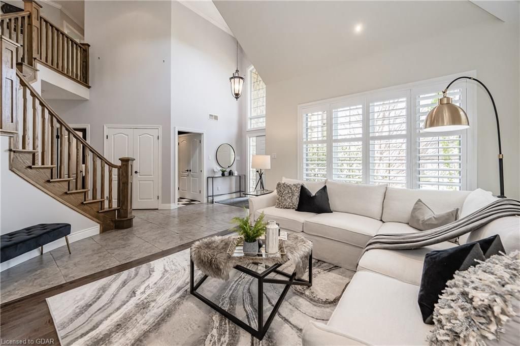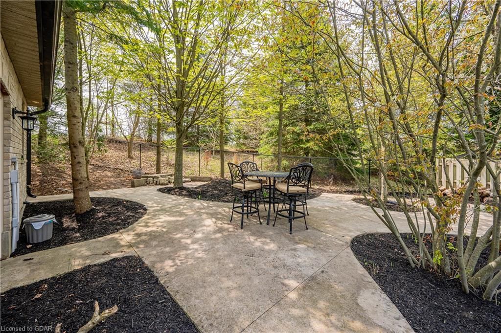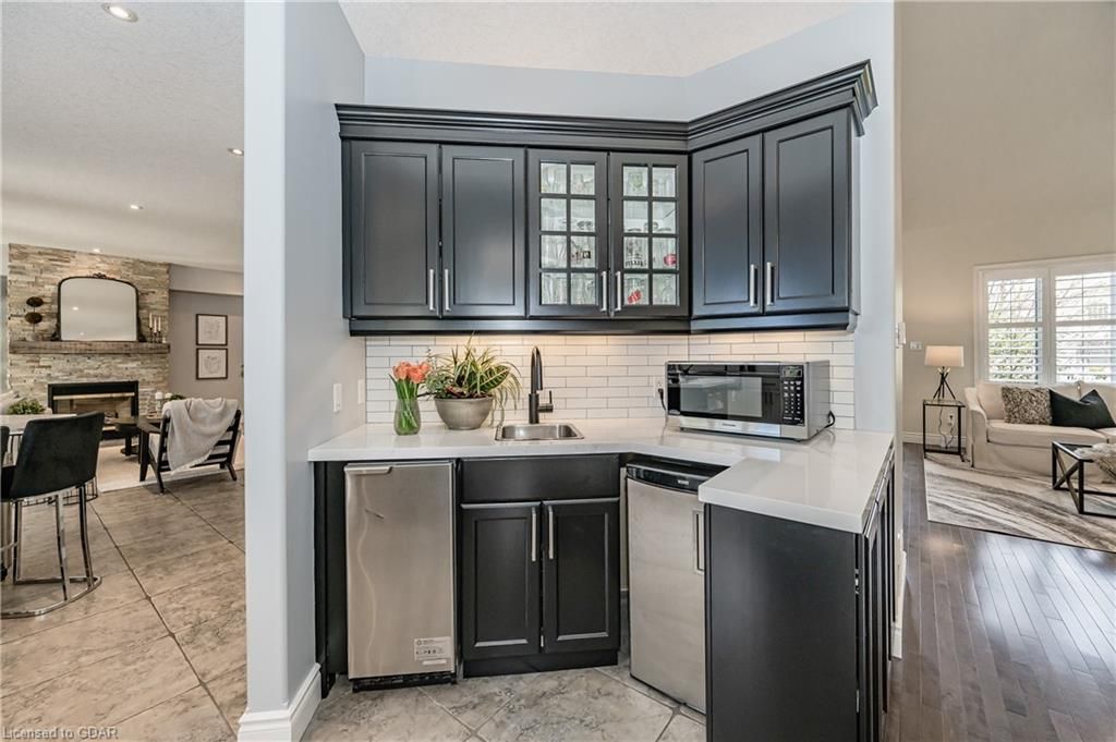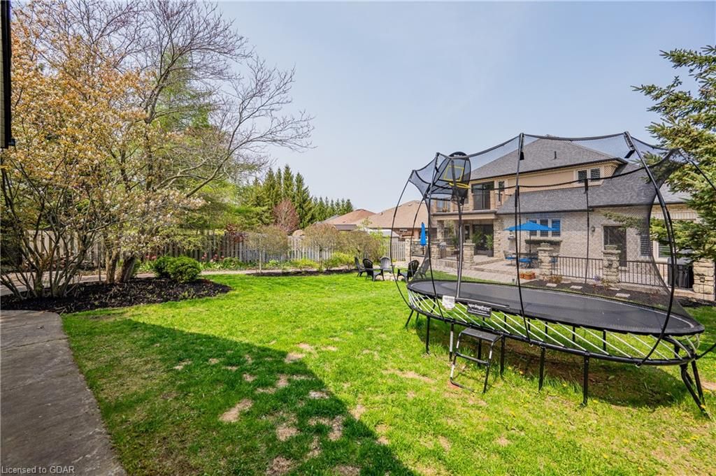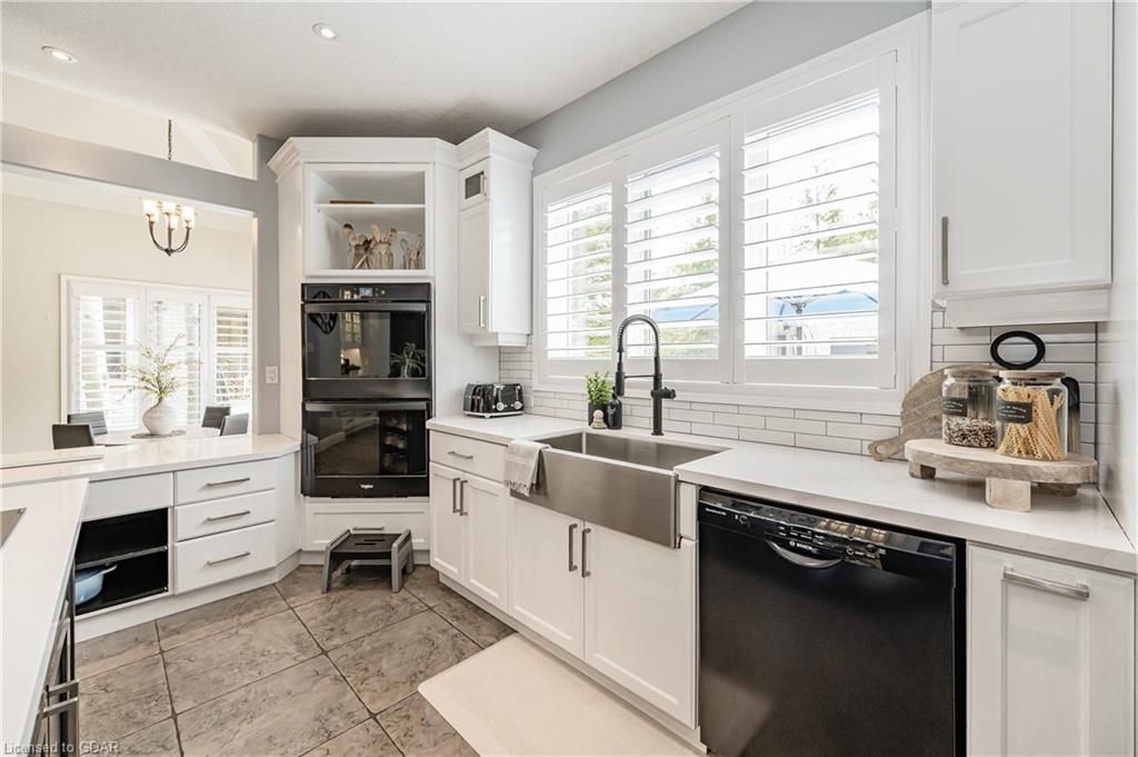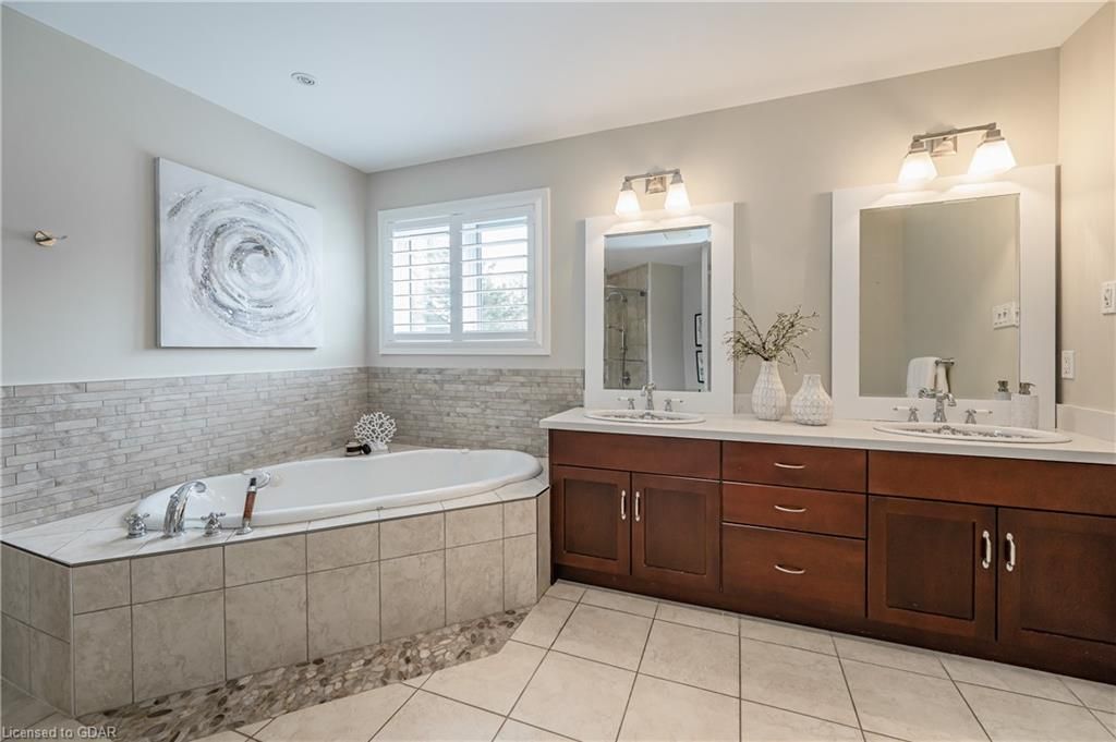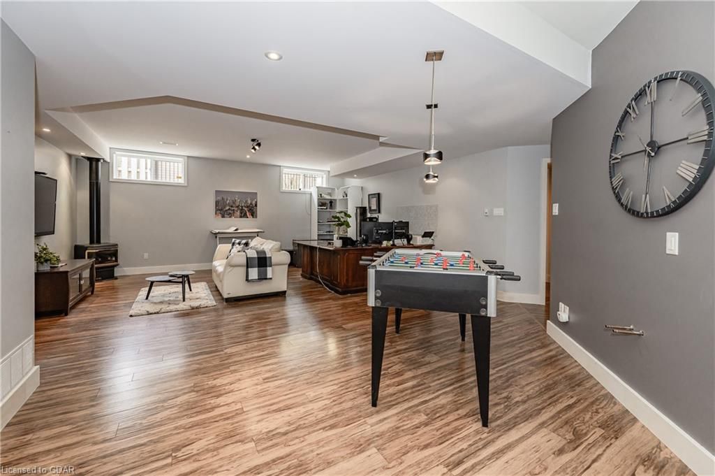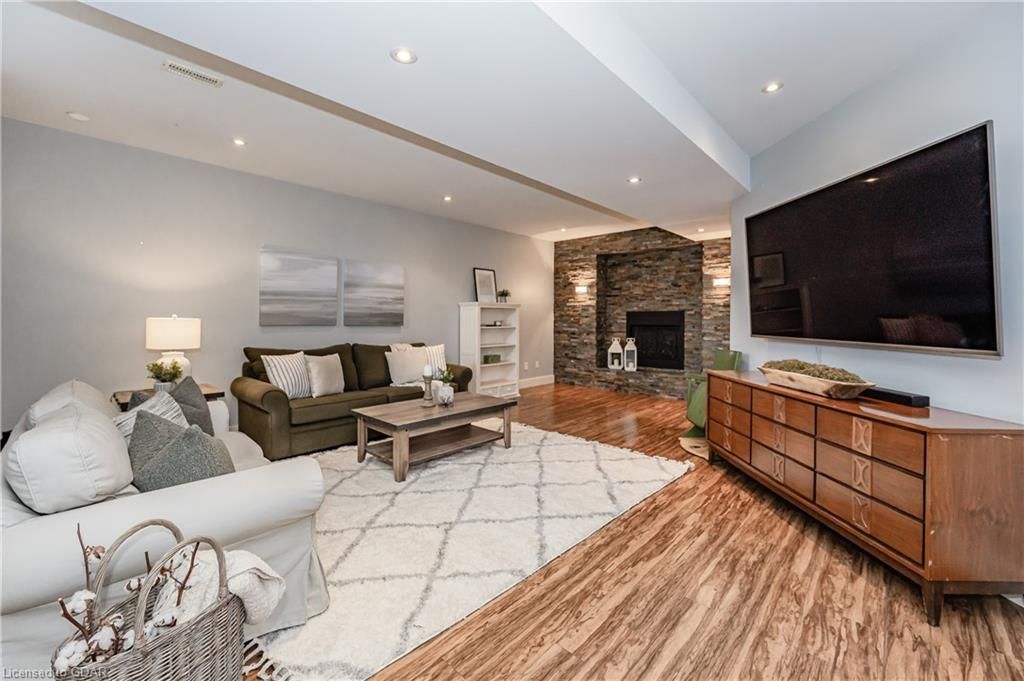 Nestled on a beautiful street in Ayr, this executive home offers just under 3000 sqft of living space. Extraordinary features include bullnosed corners, 9 ft ceilings on the main & lower level, a double sided stone fireplace, 3 additional fireplaces, 4 bathrooms w/heated floors, lighted kitchen cabinetry, double ovens, a Juliette balcony off of the primary, 3 additional bedrooms, California shutters, rustic & regal wooden mantels above the fireplaces, backyard views, & a main floor laundry room. Recently upgraded kitchen (2022) includes Ceasar stone counter tops, Jen-air cooktop, and trendy lighting. Separate wet bar area with access to the outdoors w/a natural gas bbq line. The exterior is a combination of stone, stucco & modern black accents, with easy to maintain landscaping. The backyard has a massive stamped concrete patio, partially covered and surrounded with stone pillars, and a brick building to be used as a gardeners shed, home office, or gym. Book your private showing today!