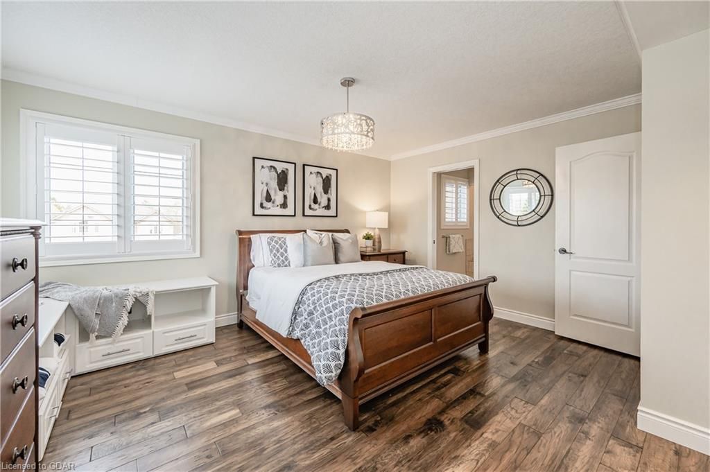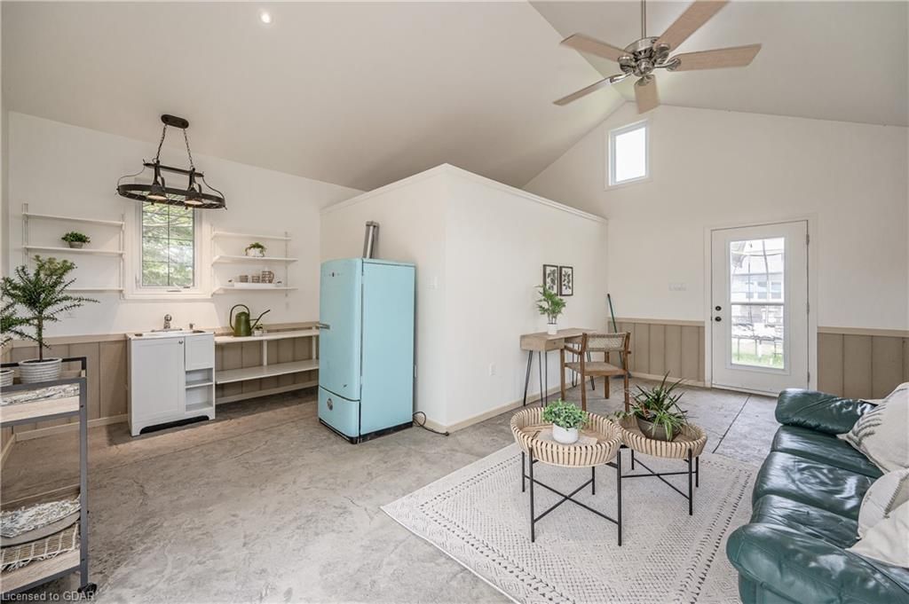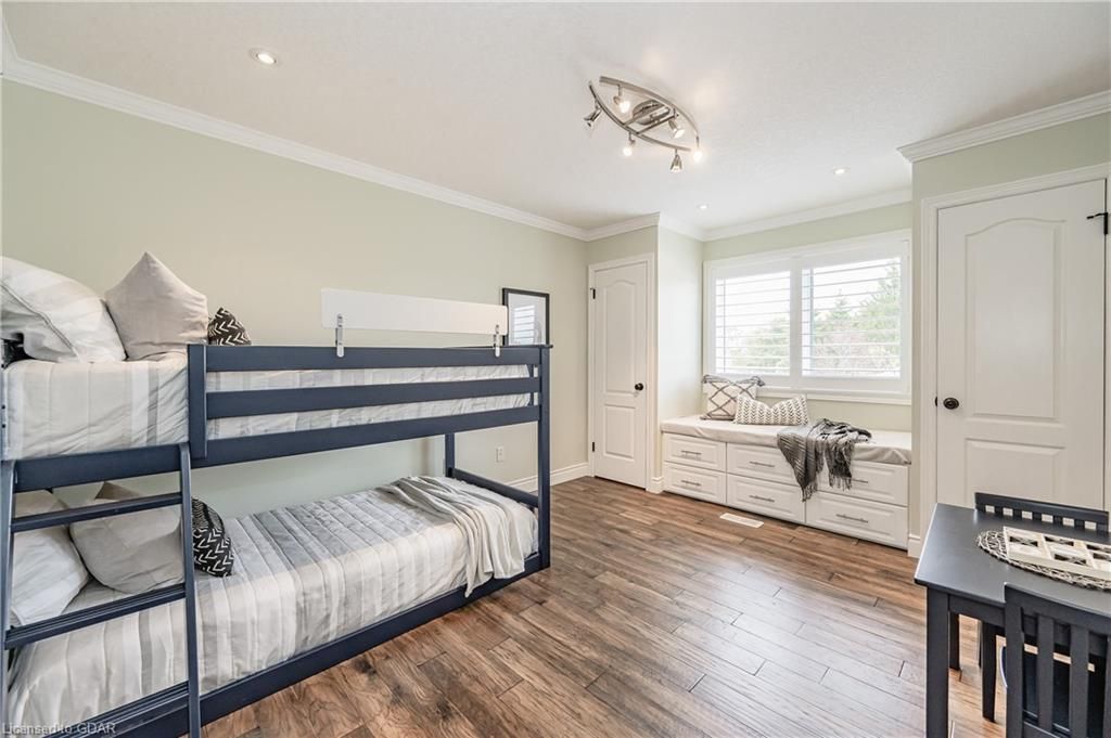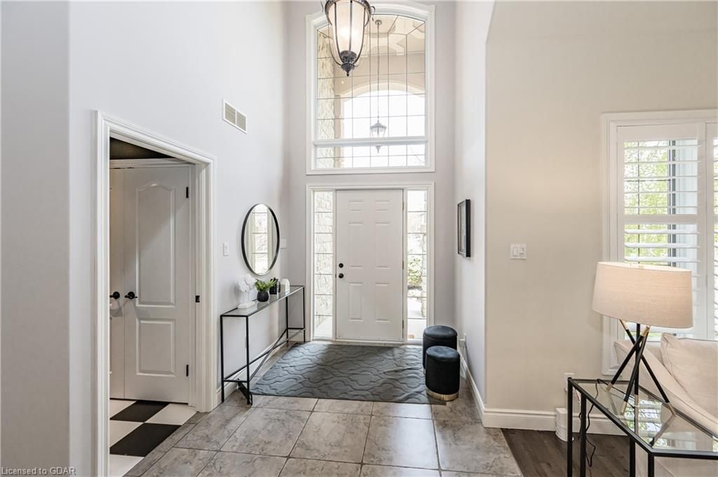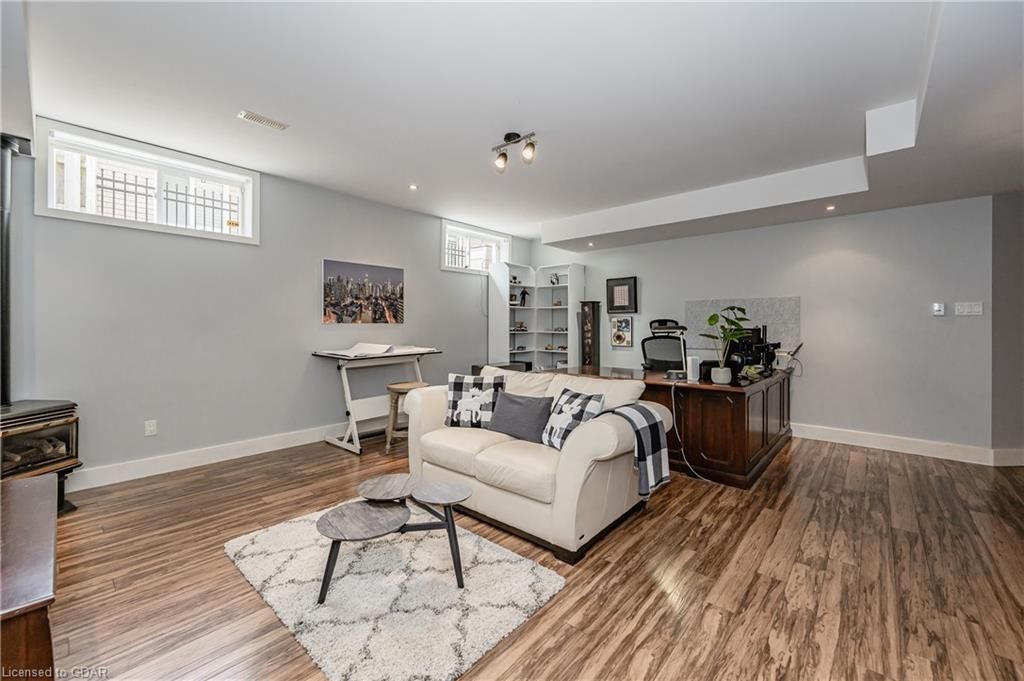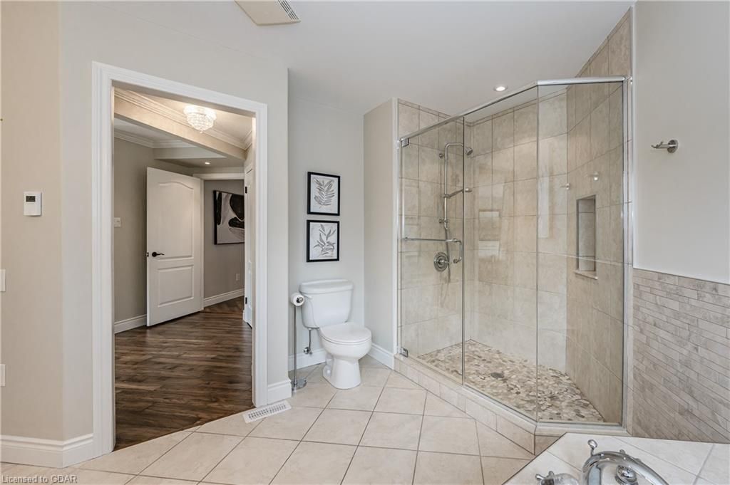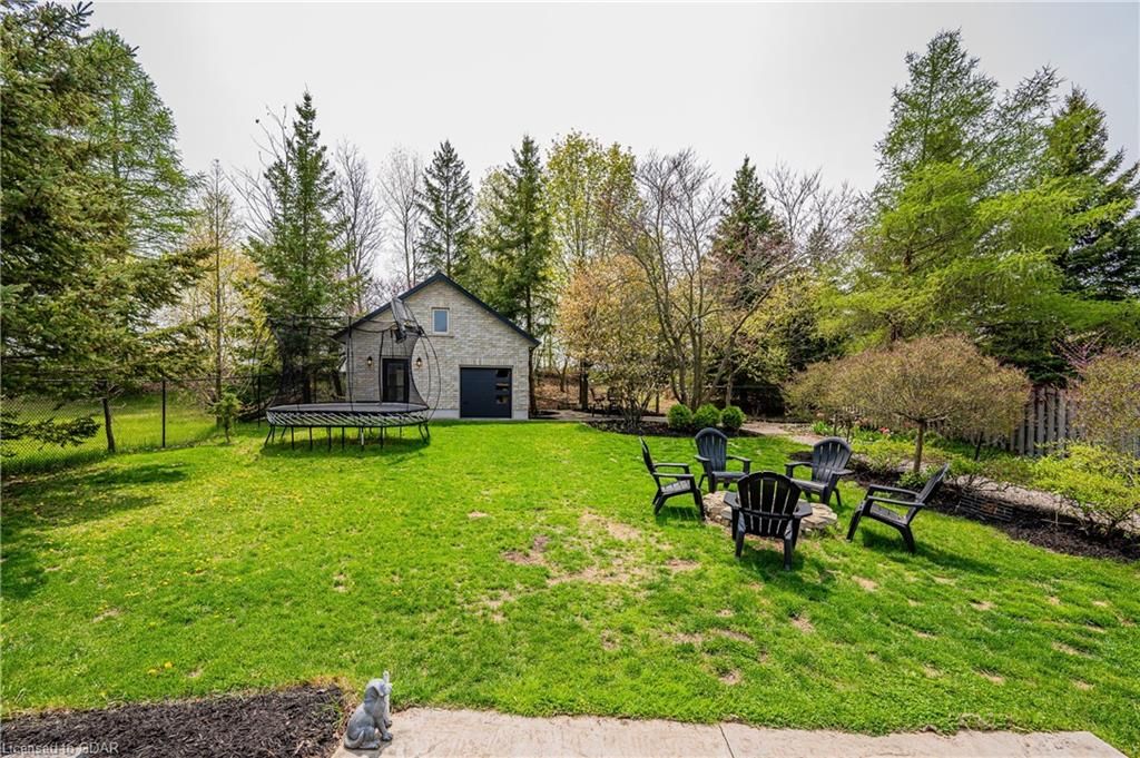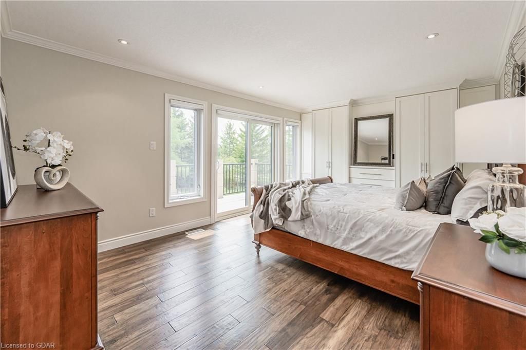 Nestled on a beautiful street in Ayr, this executive home offers just under 3000 sqft of living space. Extraordinary features include bullnosed corners, 9 ft ceilings on the main & lower level, a double sided stone fireplace, 3 additional fireplaces, 4 bathrooms w/heated floors, lighted kitchen cabinetry, double ovens, a Juliette balcony off of the primary, 3 additional bedrooms, California shutters, rustic & regal wooden mantels above the fireplaces, backyard views, & a main floor laundry room. Recently upgraded kitchen (2022) includes Ceasar stone counter tops, Jen-air cooktop, and trendy lighting. Separate wet bar area with access to the outdoors w/a natural gas bbq line. The exterior is a combination of stone, stucco & modern black accents, with easy to maintain landscaping. The backyard has a massive stamped concrete patio, partially covered and surrounded with stone pillars, and a brick building to be used as a gardeners shed, home office, or gym. Book your private showing today!