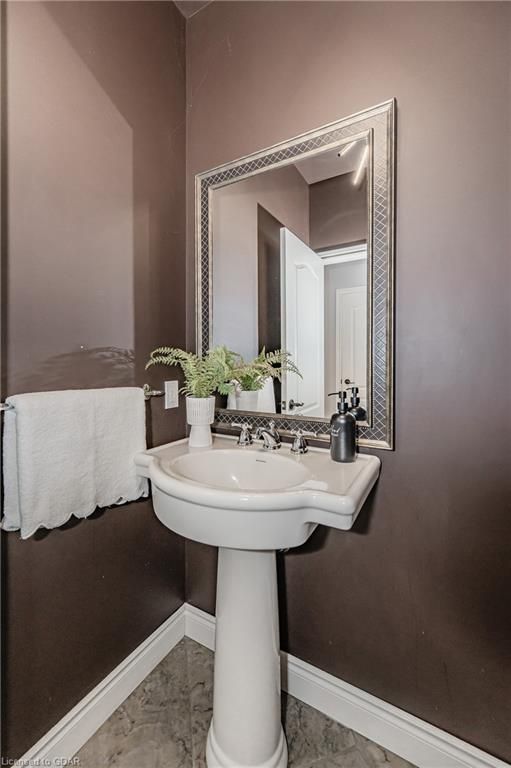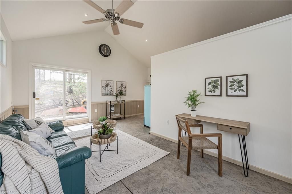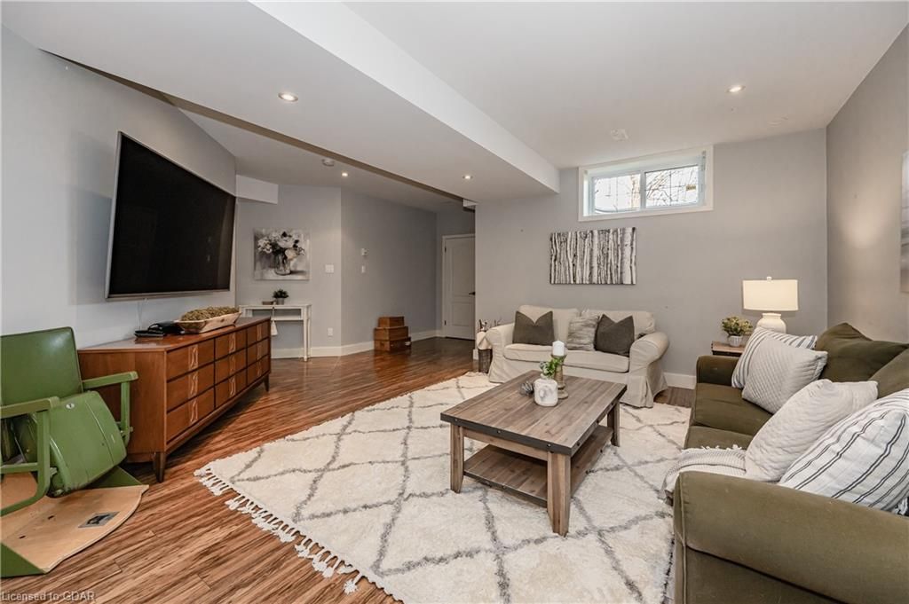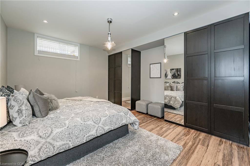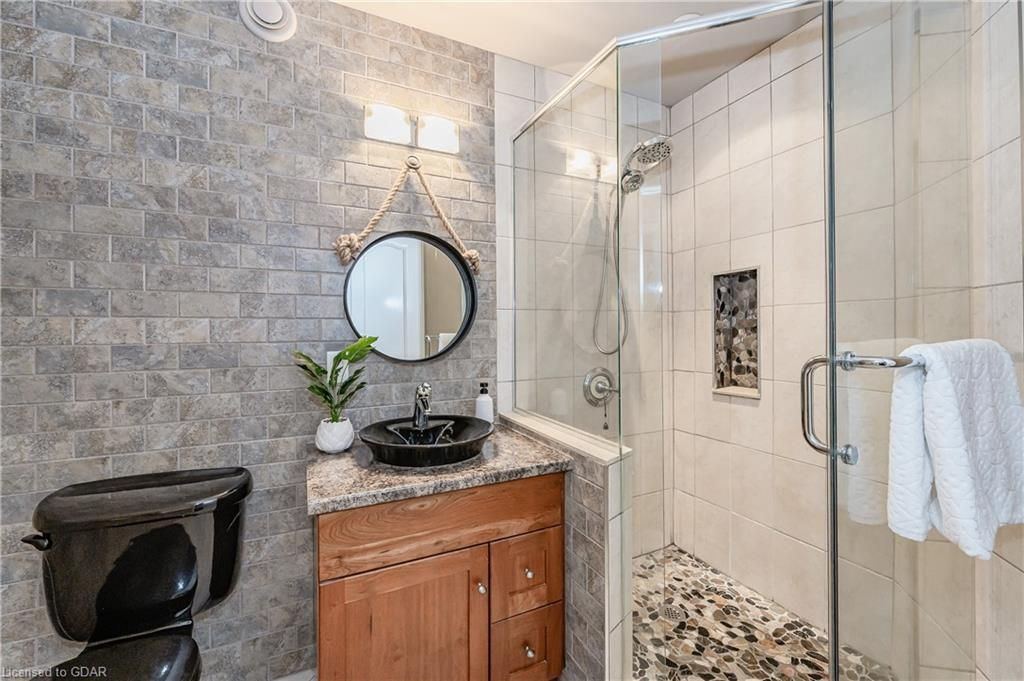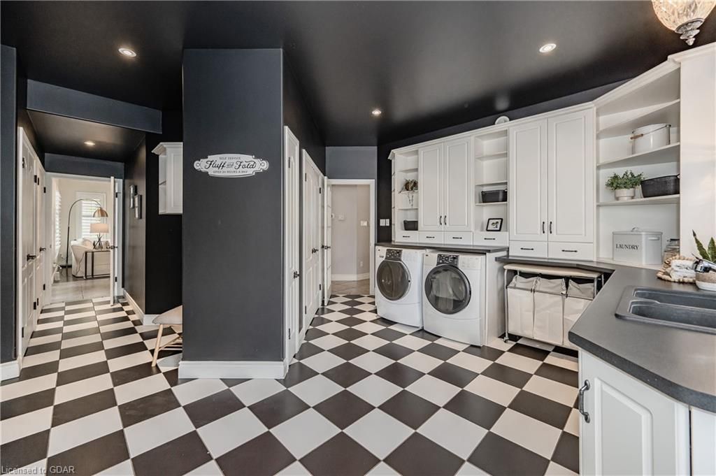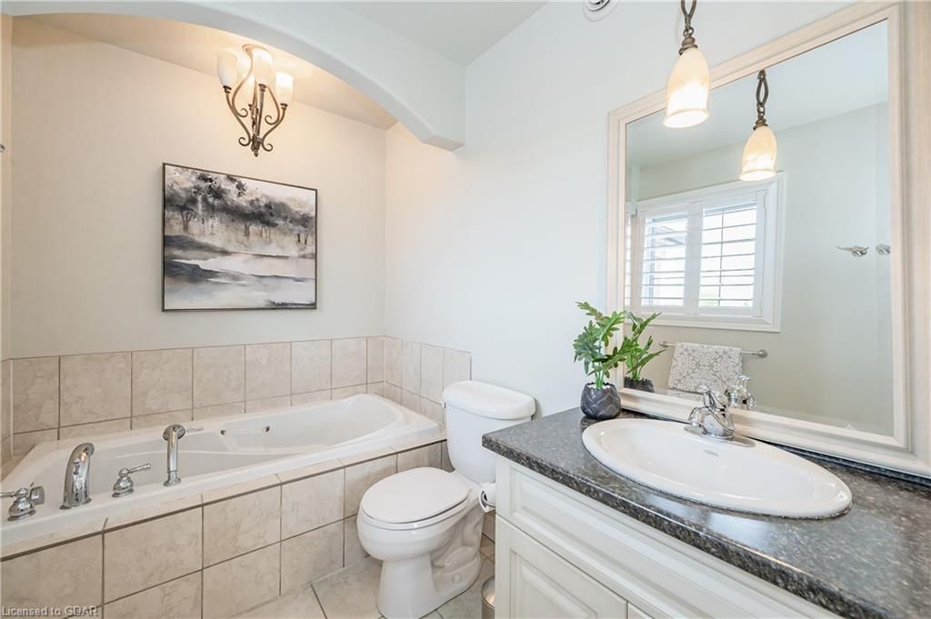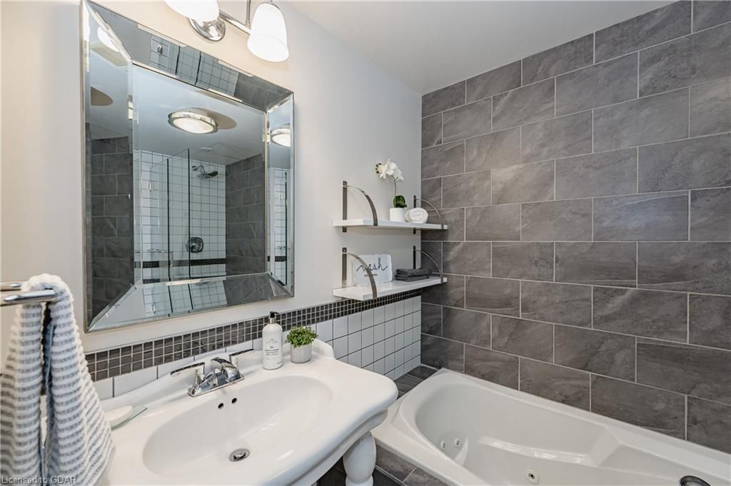 Nestled on a beautiful street in Ayr, this executive home offers just under 3000 sqft of living space. Extraordinary features include bullnosed corners, 9 ft ceilings on the main & lower level, a double sided stone fireplace, 3 additional fireplaces, 4 bathrooms w/heated floors, lighted kitchen cabinetry, double ovens, a Juliette balcony off of the primary, 3 additional bedrooms, California shutters, rustic & regal wooden mantels above the fireplaces, backyard views, & a main floor laundry room. Recently upgraded kitchen (2022) includes Ceasar stone counter tops, Jen-air cooktop, and trendy lighting. Separate wet bar area with access to the outdoors w/a natural gas bbq line. The exterior is a combination of stone, stucco & modern black accents, with easy to maintain landscaping. The backyard has a massive stamped concrete patio, partially covered and surrounded with stone pillars, and a brick building to be used as a gardeners shed, home office, or gym. Book your private showing today!