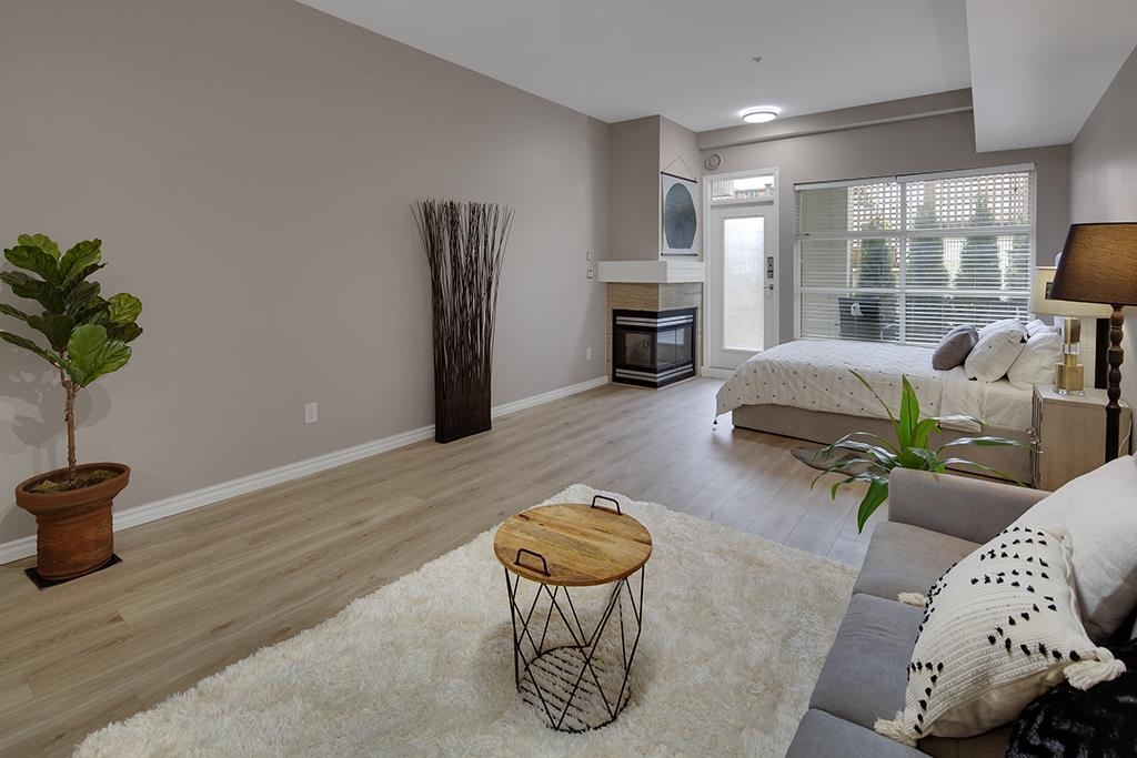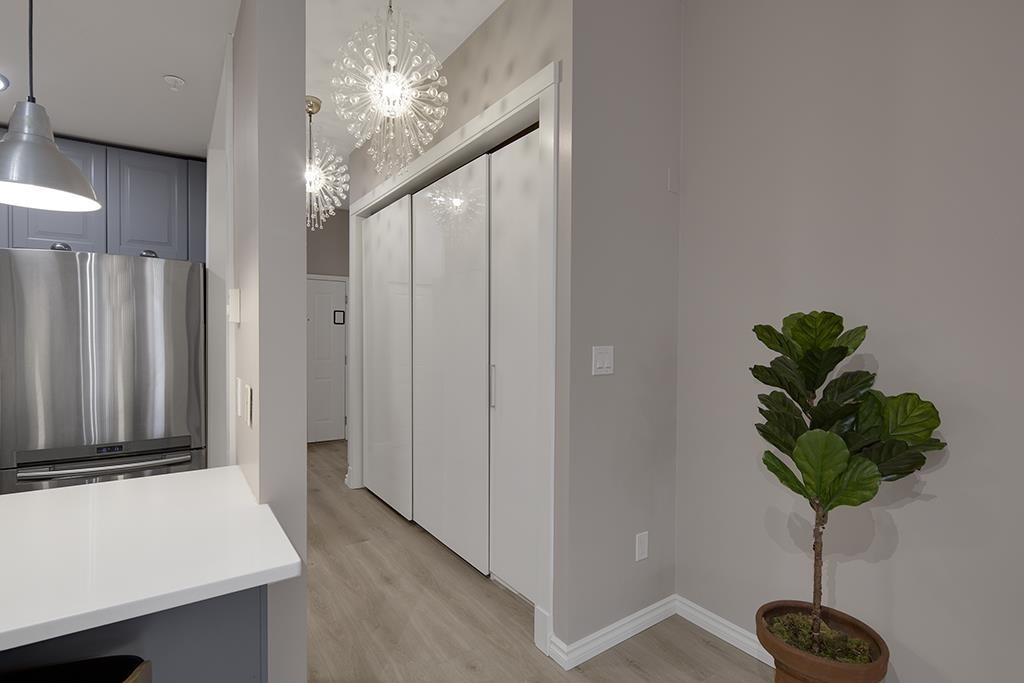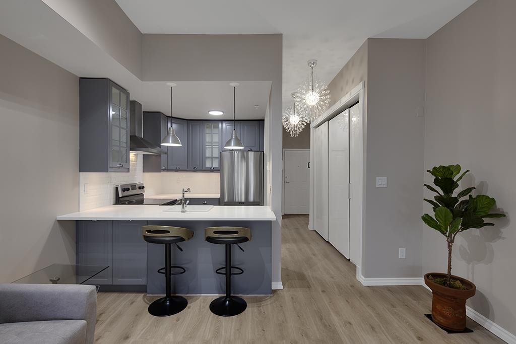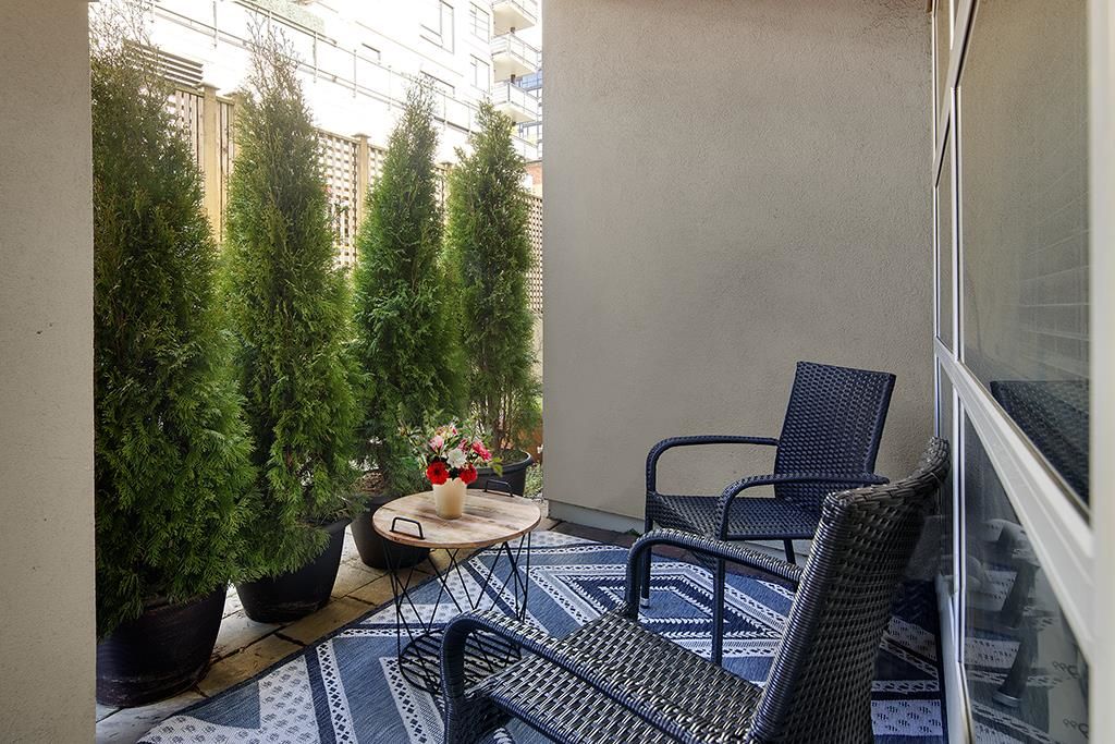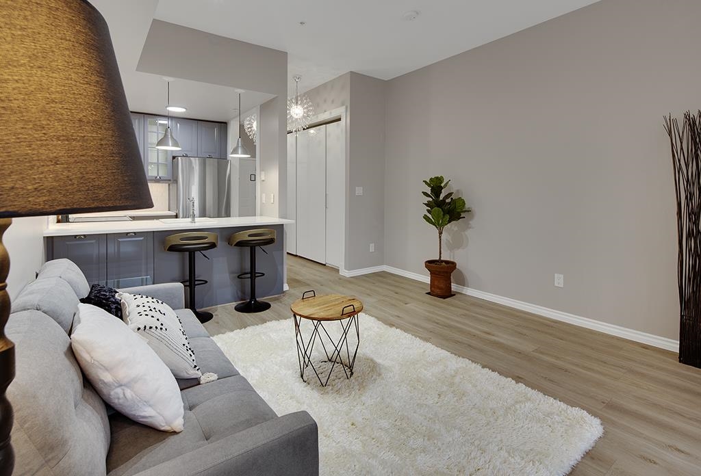 Welcome to this beautifully renovated & painted Lower Lonsdale studio featuring a private and secure West garden patio. This exceptional live/work loft offers 10' ceilings, a modern kitchen, and a cozy gas fireplace. New range oven, dishwasher & washer/dryer. Located on the quiet side of Esplanade and Lonsdale, the unit also includes a super-sized underground parking stall with lane access and a storage locker. The Tradewinds Building provides additional amenities such as a private gym and a charming courtyard. Enjoy easy walking access to the New Tap & Barrel, The Quay Markets, and the vibrant waterfront hub of Lower Lonsdale. Commuting to Downtown is convenient with the nearby Seabus, and transportation across North Van is easily accessible.