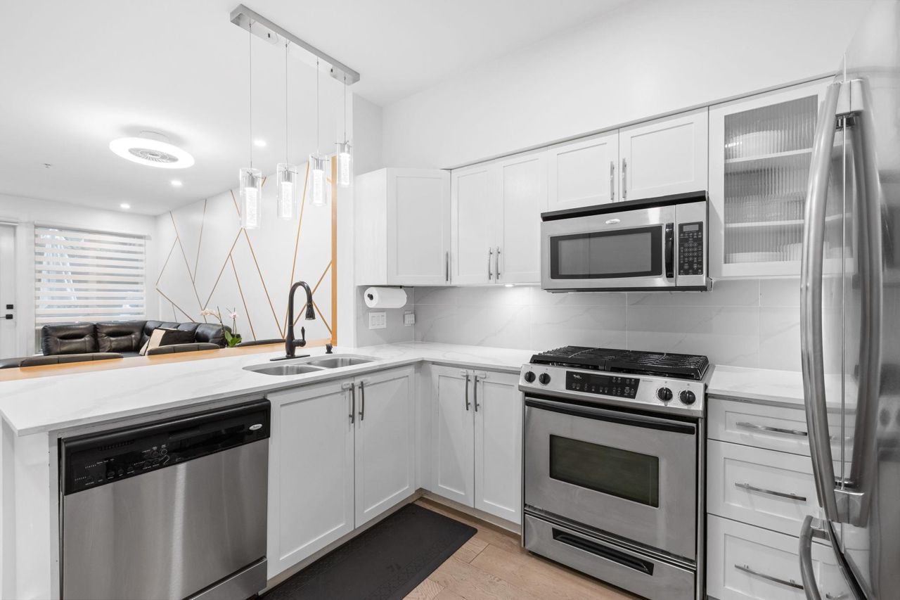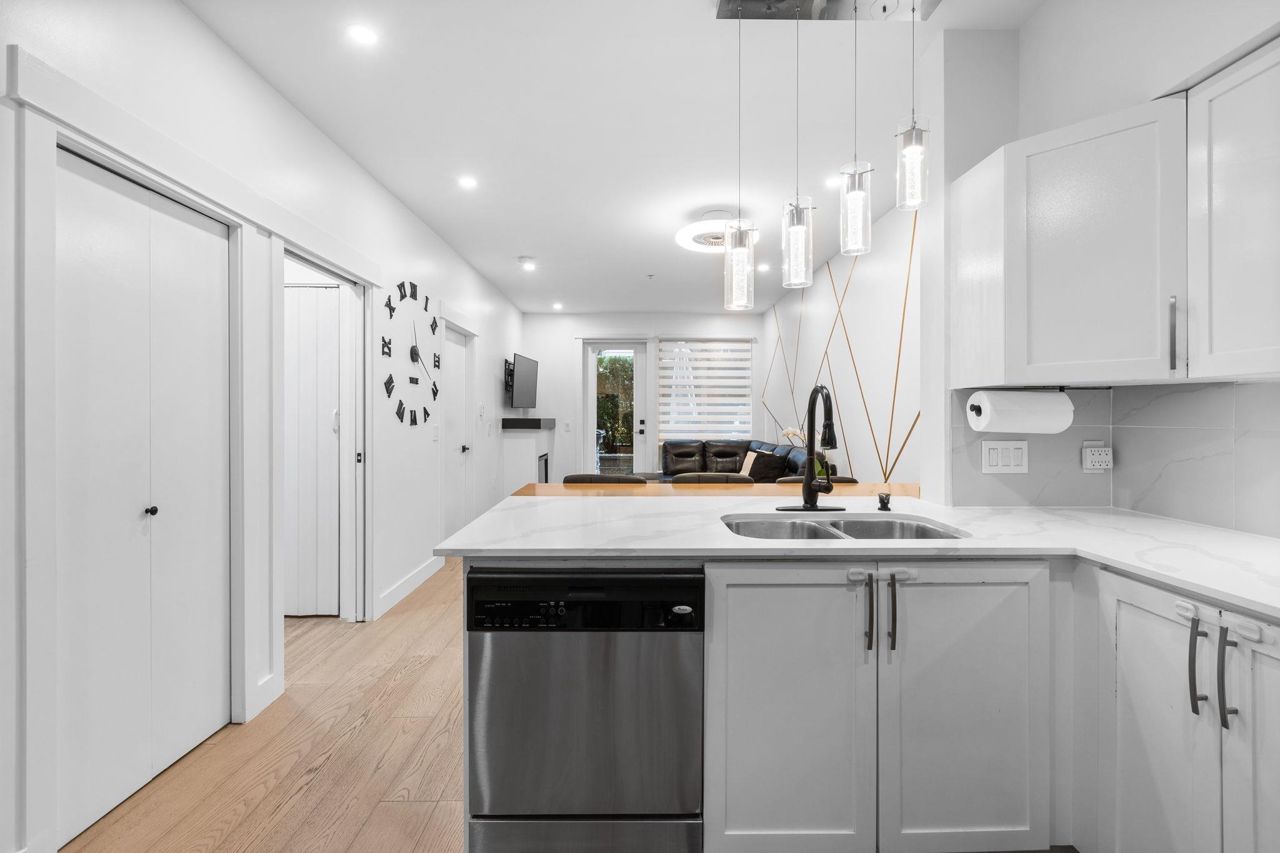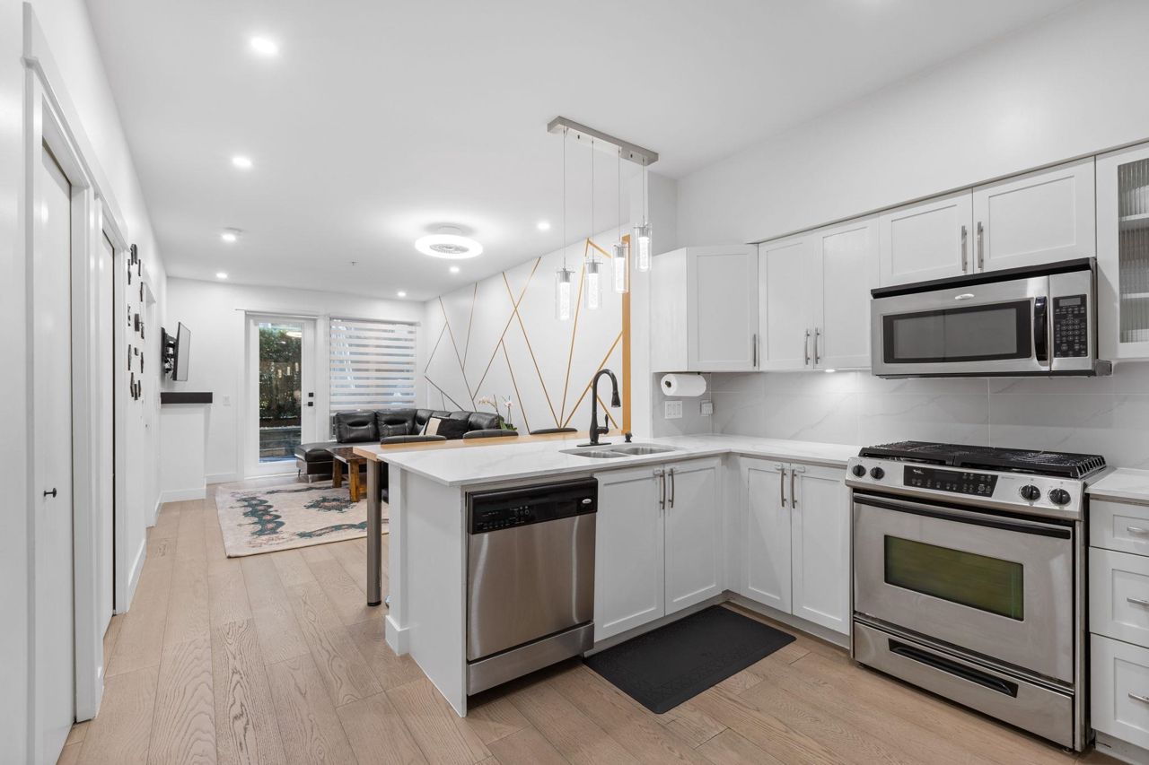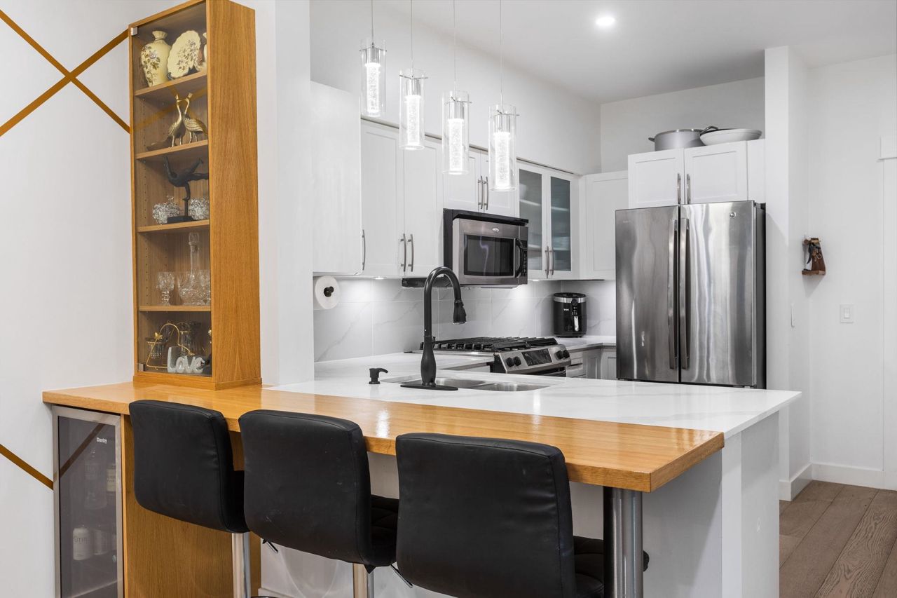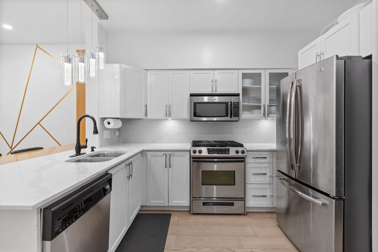 Spacious 660 sqft. open-concept design, exquisitely remodeled ground-floor 1 bedroom apartment situated in the Avondale Complex. The chef's kitchen boasts ample cabinet room, stainless steel appliances, a convenient bar fridge, en-suite washer and dryer setup, along with added closet space for increased storage capacity. Additional features include a cozy fireplace, radiant floor heating throughout the unit, an independent storage area, a bicycle room and secure underground parking. A brief stroll takes you to Lonsdale for an array of splendid shopping and dining options. Numerous parks are in close proximity as well as Harry Jerome Community Recreation Centre, and the Lions Gate hospital. Playground is located on the property.