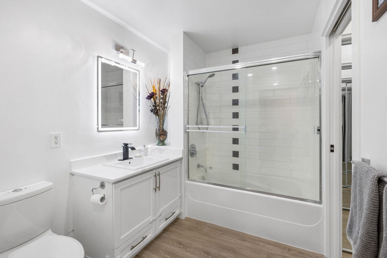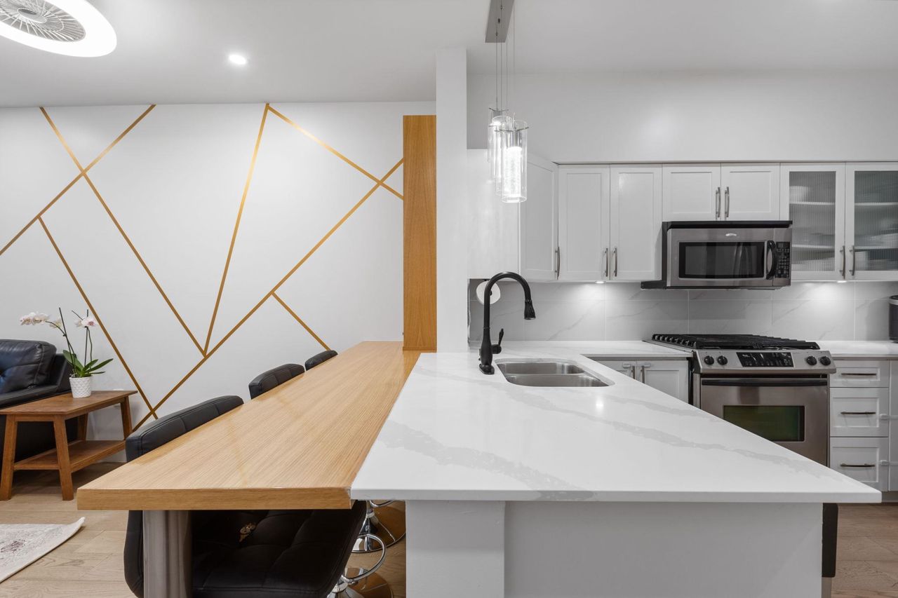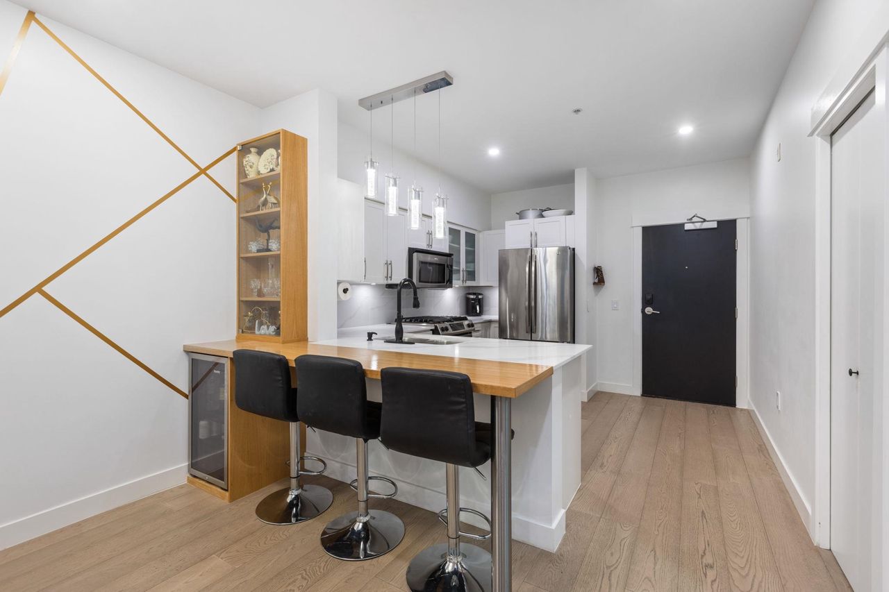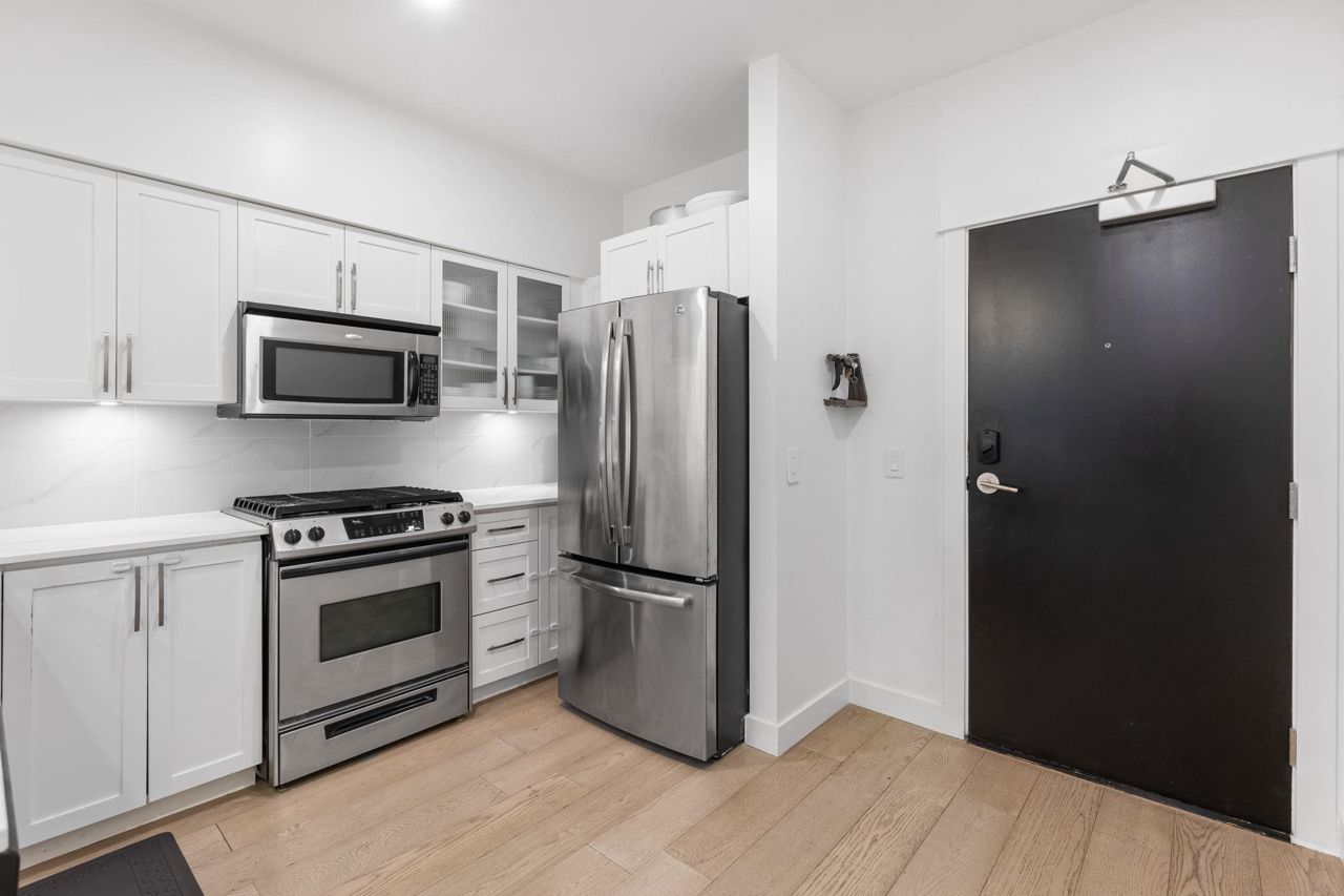 Spacious 660 sqft. open-concept design, exquisitely remodeled ground-floor 1 bedroom apartment situated in the Avondale Complex. The chef's kitchen boasts ample cabinet room, stainless steel appliances, a convenient bar fridge, en-suite washer and dryer setup, along with added closet space for increased storage capacity. Additional features include a cozy fireplace, radiant floor heating throughout the unit, an independent storage area, a bicycle room and secure underground parking. A brief stroll takes you to Lonsdale for an array of splendid shopping and dining options. Numerous parks are in close proximity as well as Harry Jerome Community Recreation Centre, and the Lions Gate hospital. Playground is located on the property.