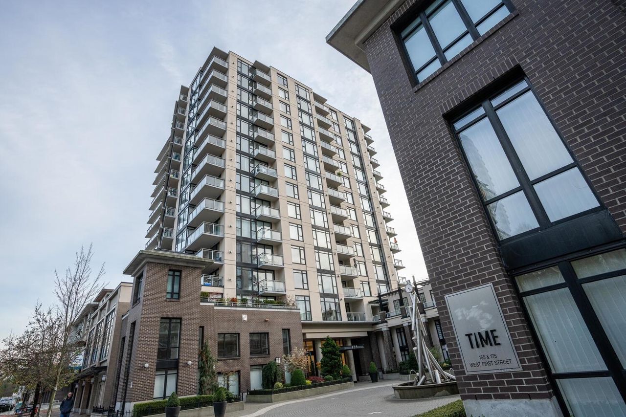 Welcome to The Time, one of the best CONCRETE buildings in Lower Lonsdale. This spacious and bright 1 BDRM PLUS DEN has a nice layout with spacious and bright rooms. Kitchen has SS appliances & island. Large living room offers a cozy gas fireplace. Fabulous location to enjoy the ultimate urban lifestyle of Lower Lonsdale with fine dining, shops, Lonsdale Quay, SeaBus, Friday Night Market and the fantastic Shipyards Plaza with ice rink/water park. Well managed building with onsite building manager/concierge, party room & ample visitor parking. 1 Pkg/1 Storage, BBQs allowed, Pets 1 cat or dog, no size restriction. Easy to show by appointment.