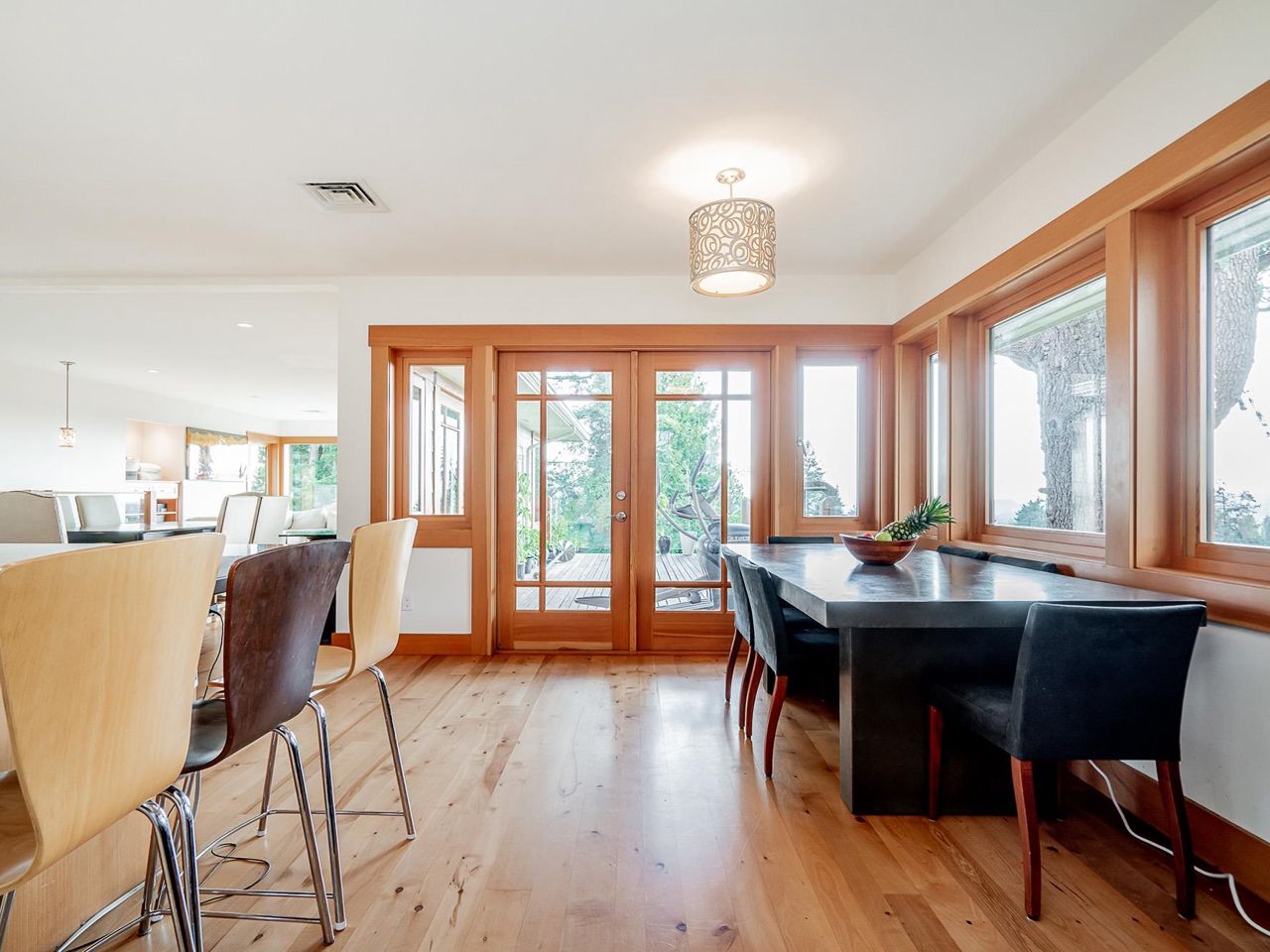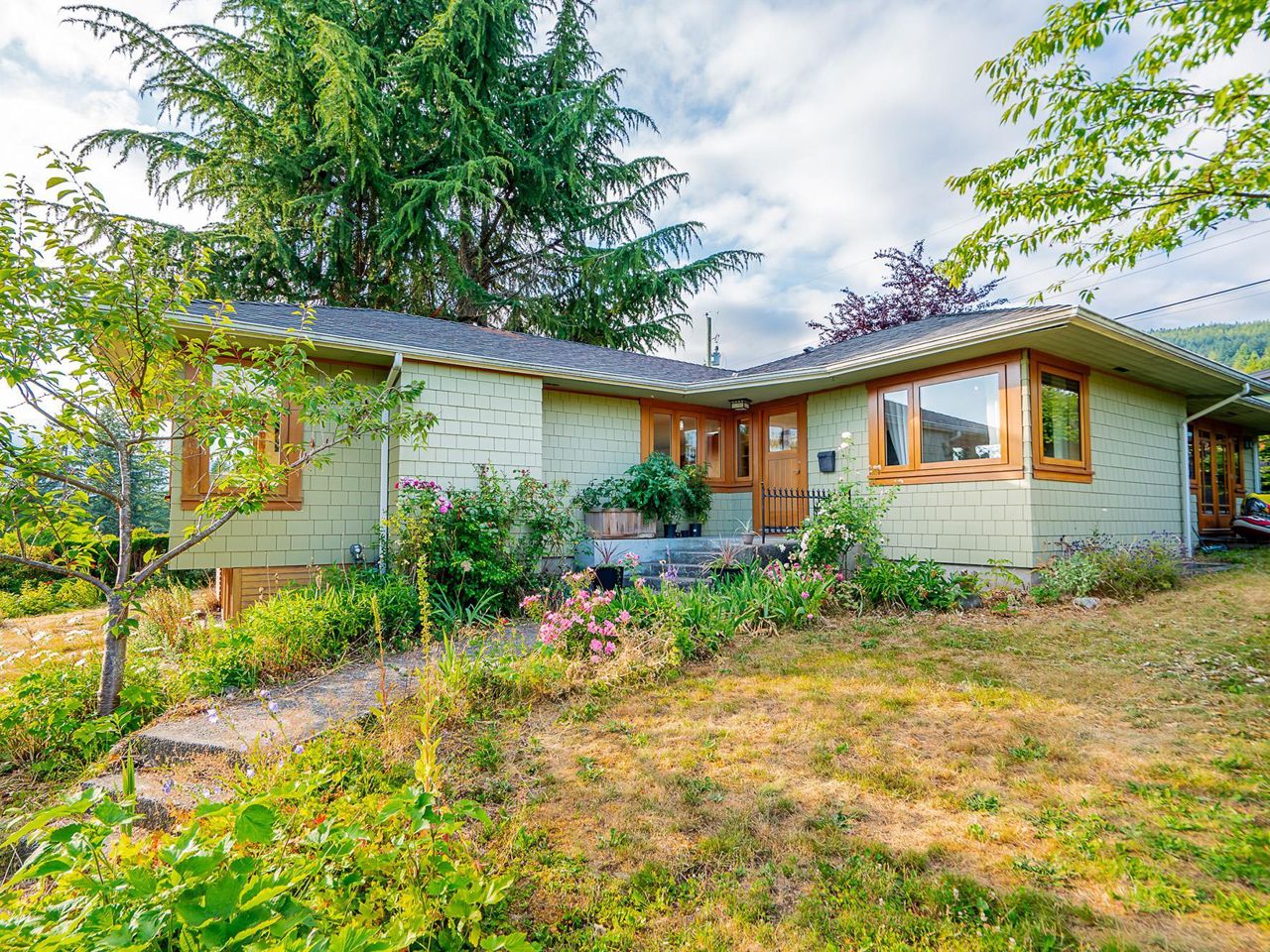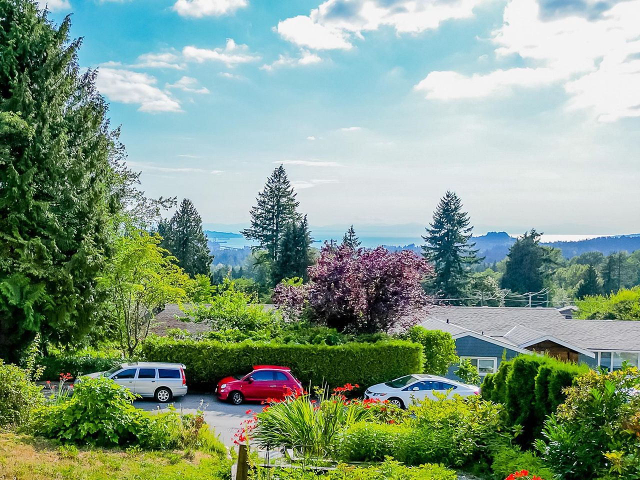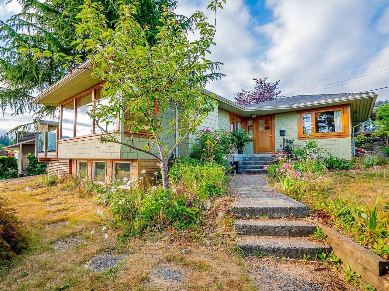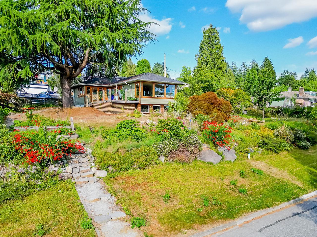 Stunning southwest panoramic views on a 13,224 sf, gently sloping lot in Upper Lonsdale! This 3BR / 3BA home includes a nanny/inlaw suite and has been substantially updated in 2010/2011 including roof, hardieboard siding, insulation, plumbing, electrical, windows and heat pump with A/C. An entertainers dream, this open floorplan and generous windows showcase views of the city and ocean from the living, dining and kitchen areas. French doors open to a gorgeous Brazilian walnut deck to enjoy a glass of wine while watching the sun set over Vancouver Island. Arbutus wood flooring, end grain wood trim, custom kitchen cabinetry with stainless island. Primary BR features French doors to garden and marble floors in ensuite. Garden has fruit trees, raised garden beds, shed w/ lane access.