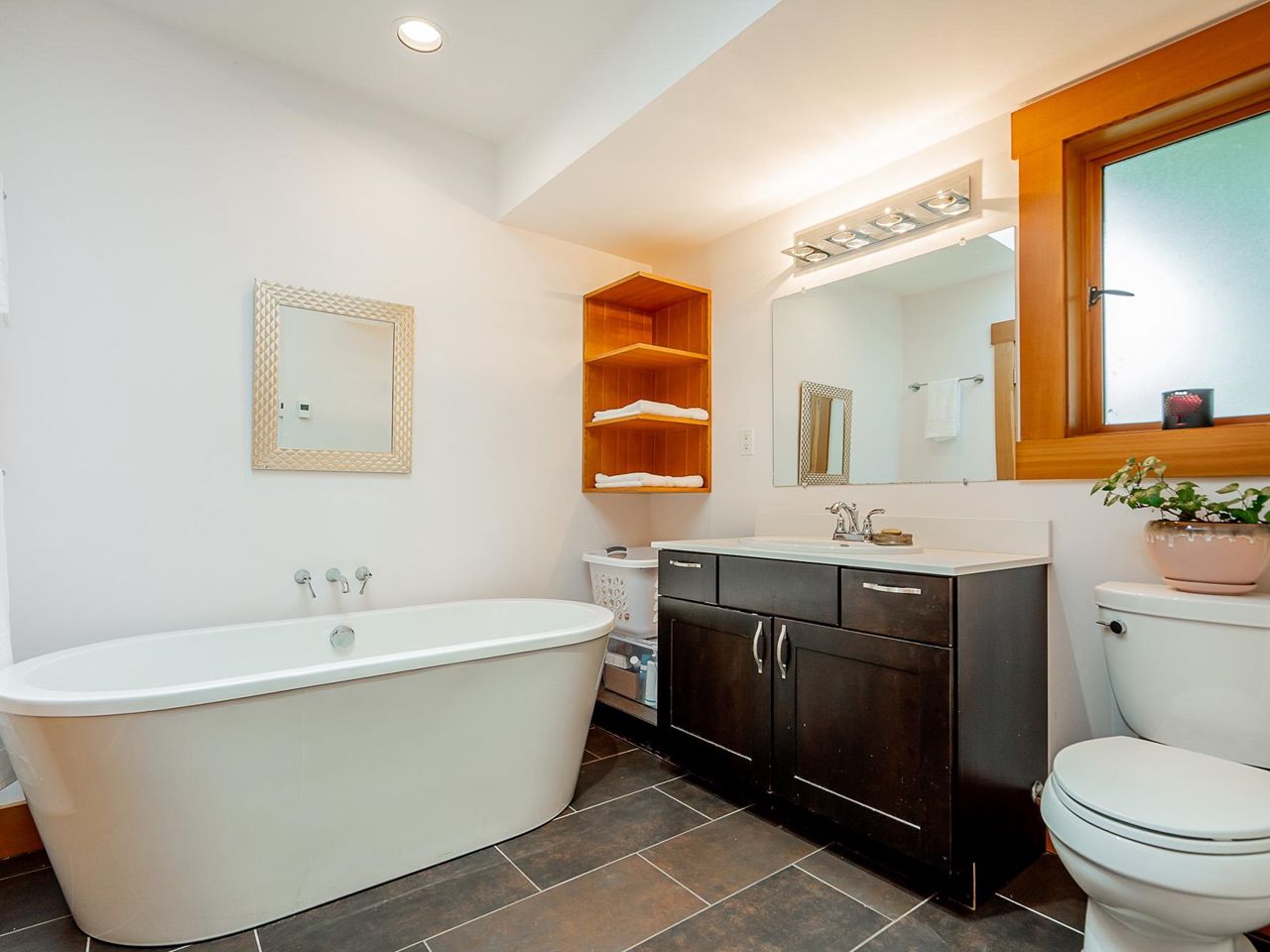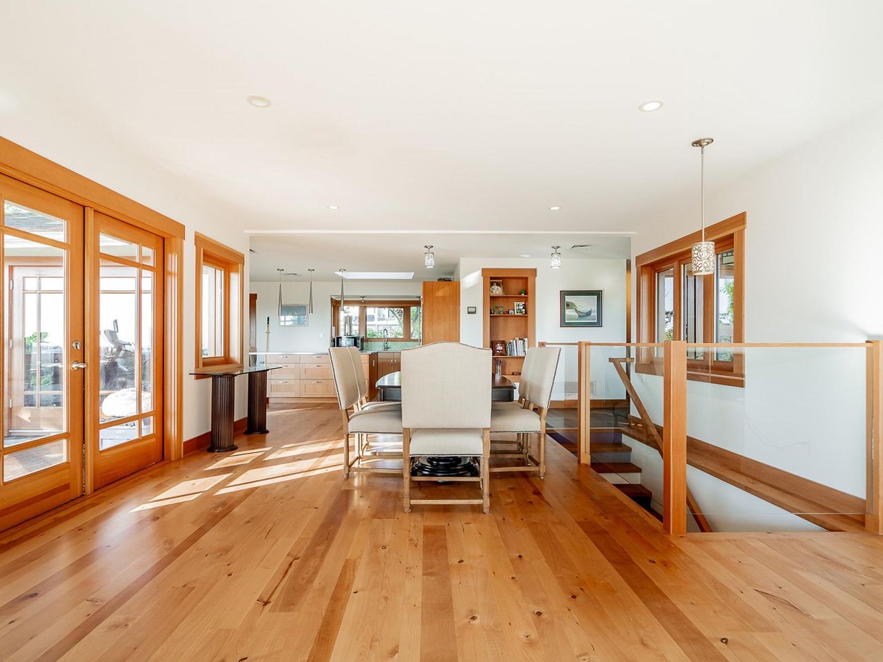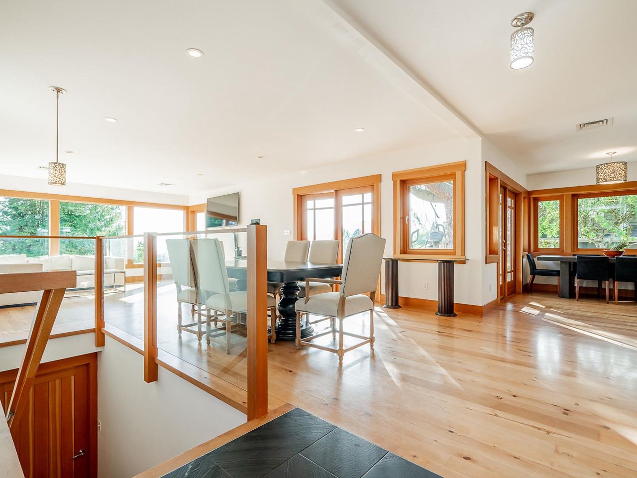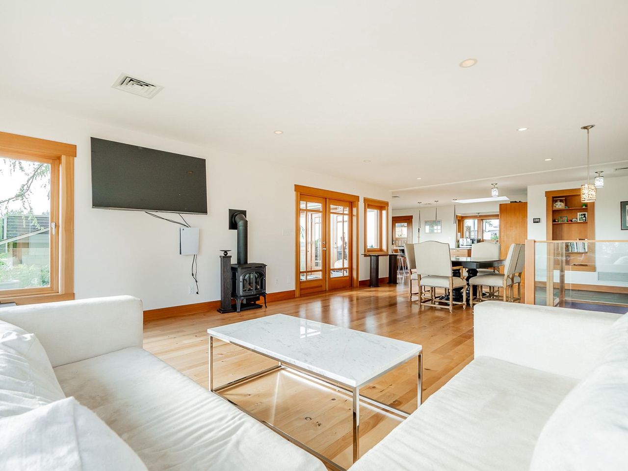 Stunning southwest panoramic views on a 13,224 sf, gently sloping lot in Upper Lonsdale! This 3BR / 3BA home includes a nanny/inlaw suite and has been substantially updated in 2010/2011 including roof, hardieboard siding, insulation, plumbing, electrical, windows and heat pump with A/C. An entertainers dream, this open floorplan and generous windows showcase views of the city and ocean from the living, dining and kitchen areas. French doors open to a gorgeous Brazilian walnut deck to enjoy a glass of wine while watching the sun set over Vancouver Island. Arbutus wood flooring, end grain wood trim, custom kitchen cabinetry with stainless island. Primary BR features French doors to garden and marble floors in ensuite. Garden has fruit trees, raised garden beds, shed w/ lane access.
