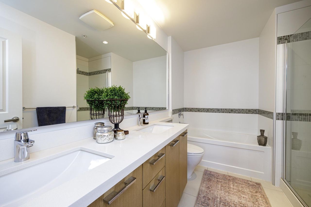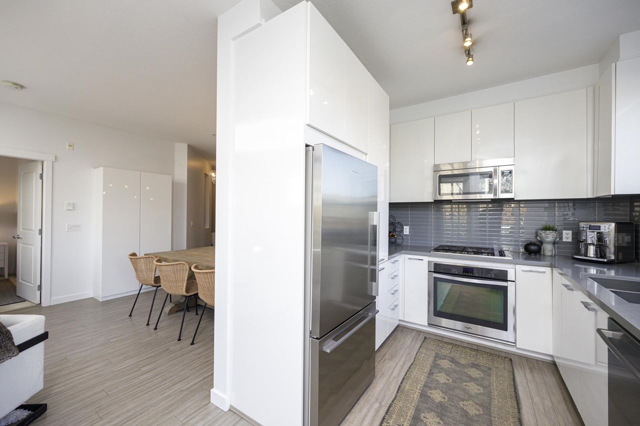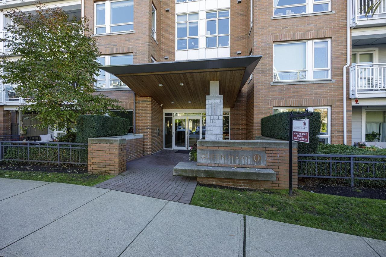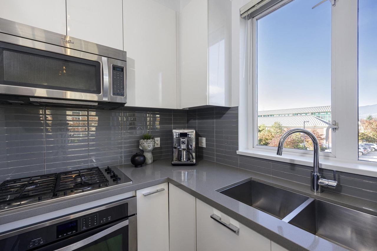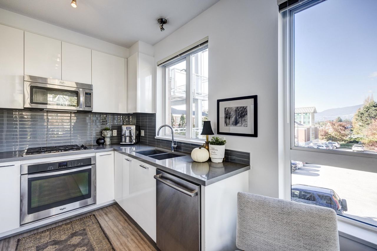 Inviting corner suite with mountain views located in sought after Queen Mary reflecting the urban West Coast contemporary architecture. Offering a thoughtfully designed layout with 9' ceilings and sophisticated interior design details, it features two bedrooms, two full bathrooms and a bright open-plan living space with in floor radiant heat, smooth engineered stone counters, laminate flooring and custom cabinets. Gorgeous chef-inspired kitchen has quartz counters, stainless steel appliances and an adjoining breakfast nook/lounging area off the patio - ideal for entertaining. Nicely separated bedrooms with the primary boasting walk-in closet and ensuite with soaker tub and heated floors! Steps to Victoria Park this well situated condo is quality living at its best!
