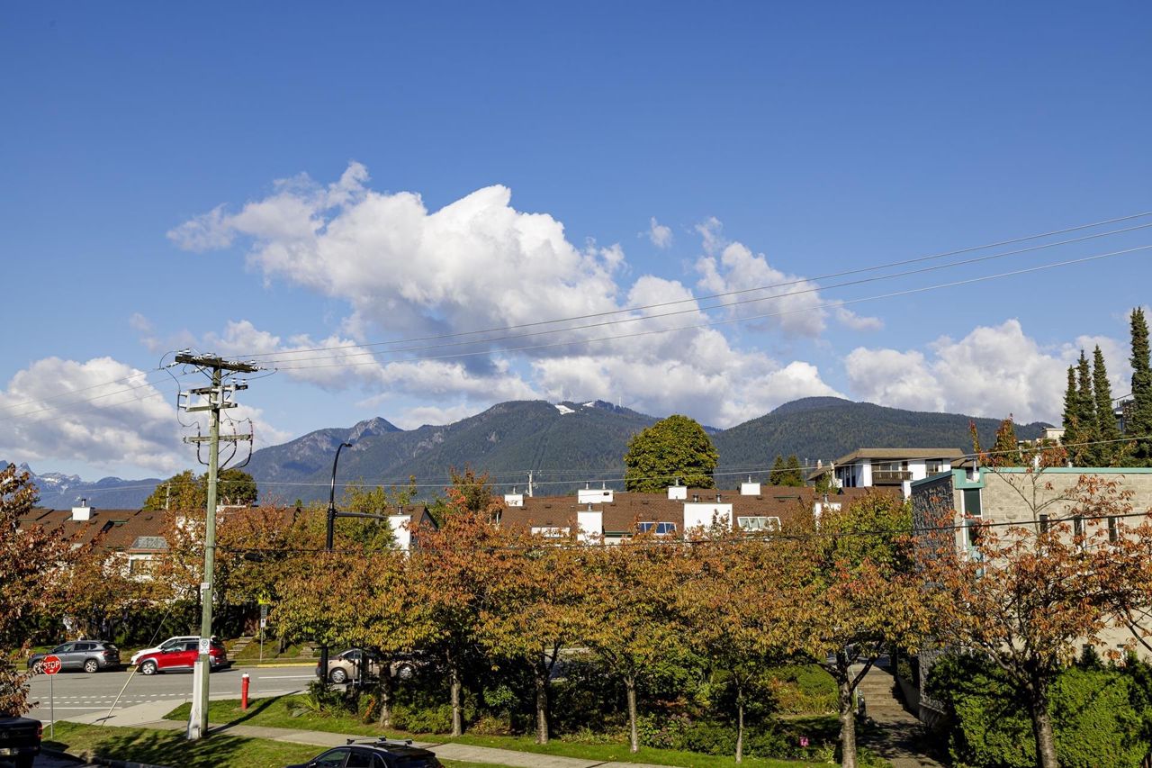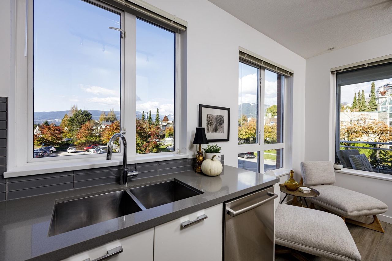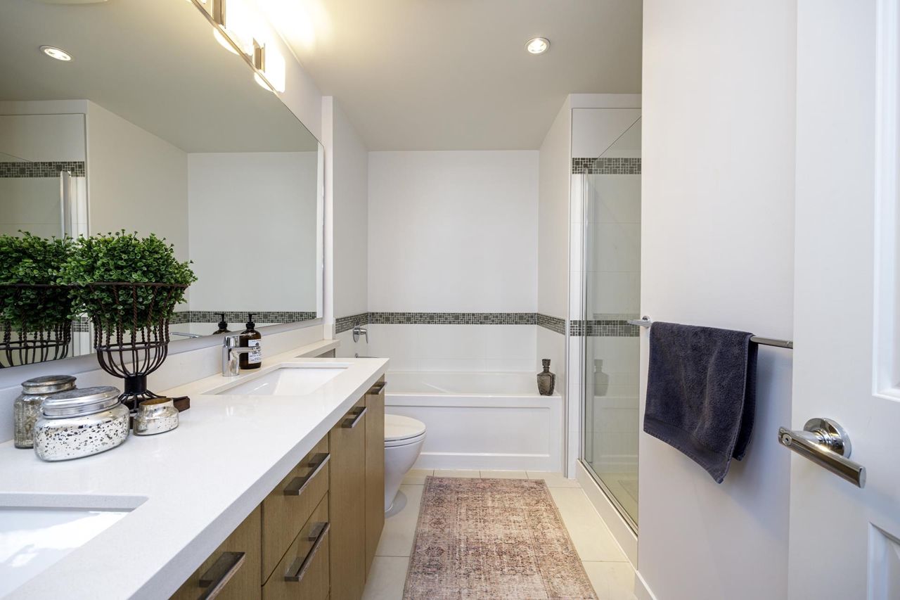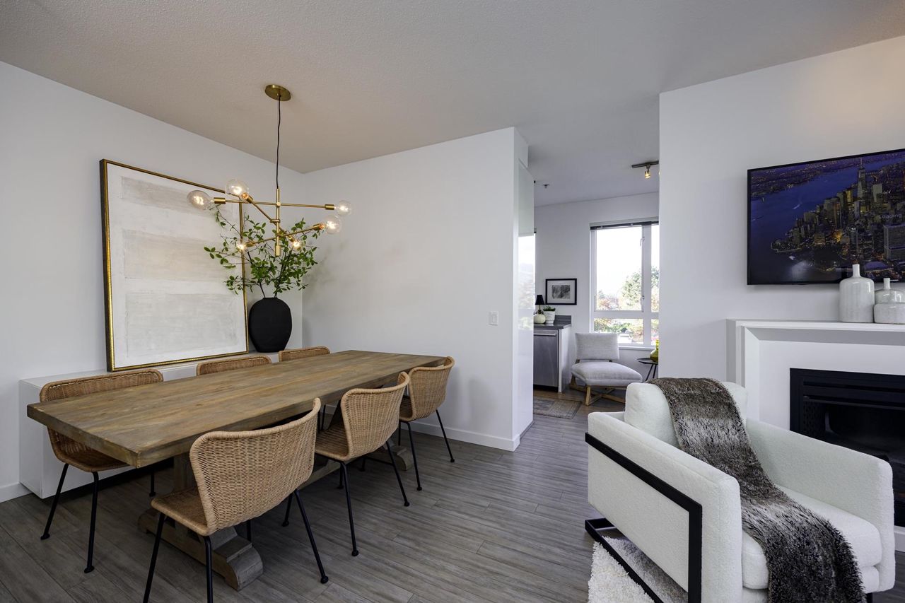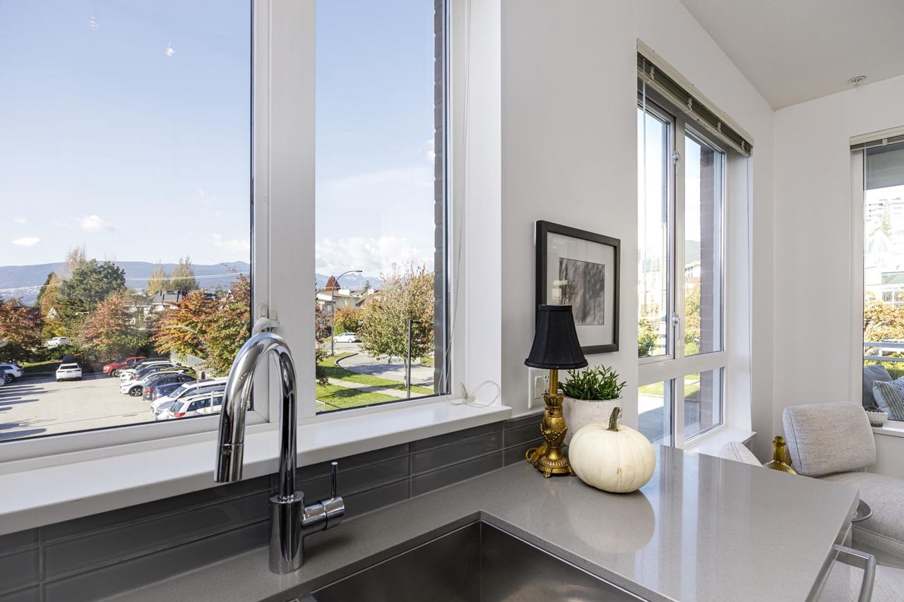 Inviting corner suite with mountain views located in sought after Queen Mary reflecting the urban West Coast contemporary architecture. Offering a thoughtfully designed layout with 9' ceilings and sophisticated interior design details, it features two bedrooms, two full bathrooms and a bright open-plan living space with in floor radiant heat, smooth engineered stone counters, laminate flooring and custom cabinets. Gorgeous chef-inspired kitchen has quartz counters, stainless steel appliances and an adjoining breakfast nook/lounging area off the patio - ideal for entertaining. Nicely separated bedrooms with the primary boasting walk-in closet and ensuite with soaker tub and heated floors! Steps to Victoria Park this well situated condo is quality living at its best!