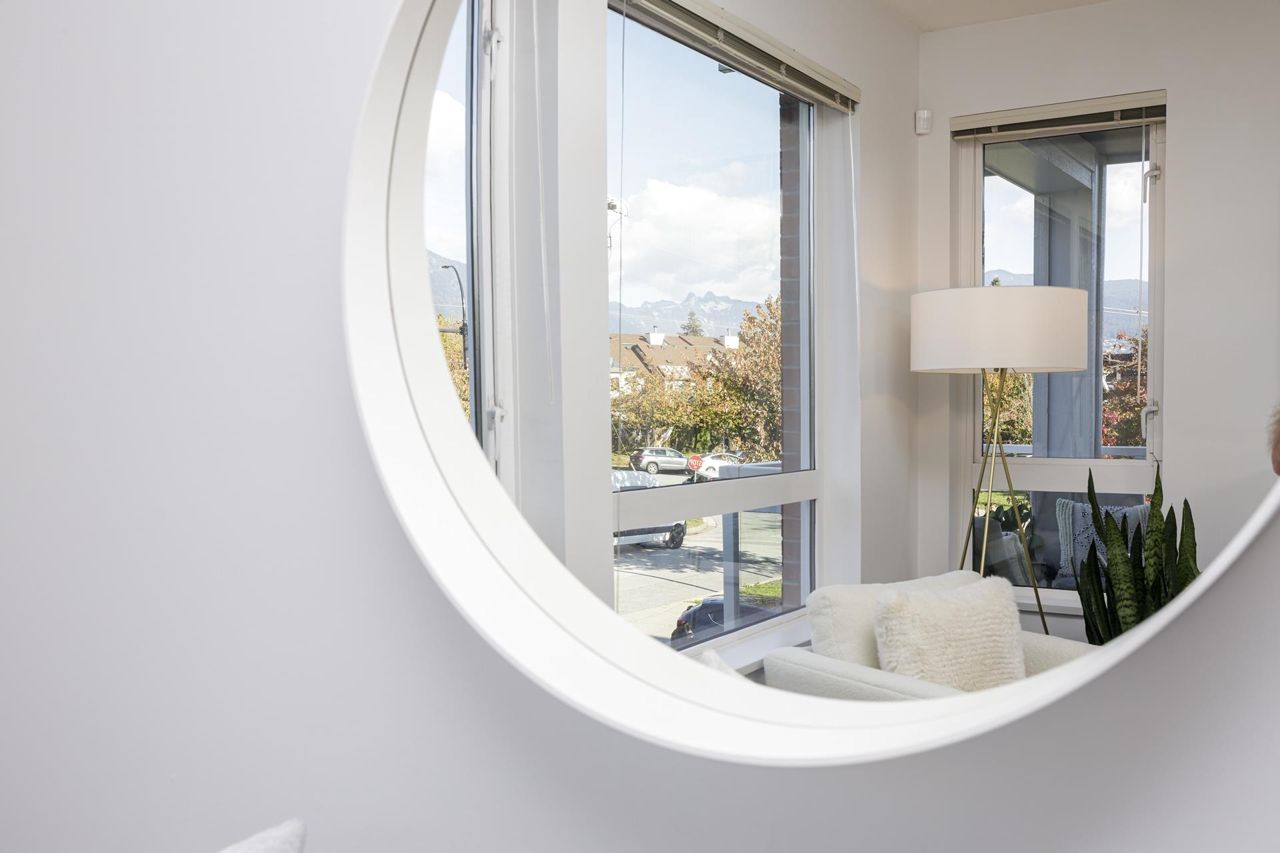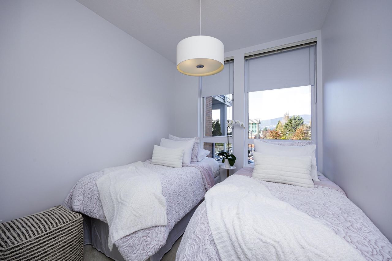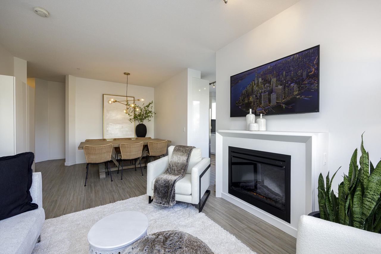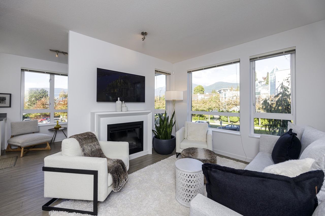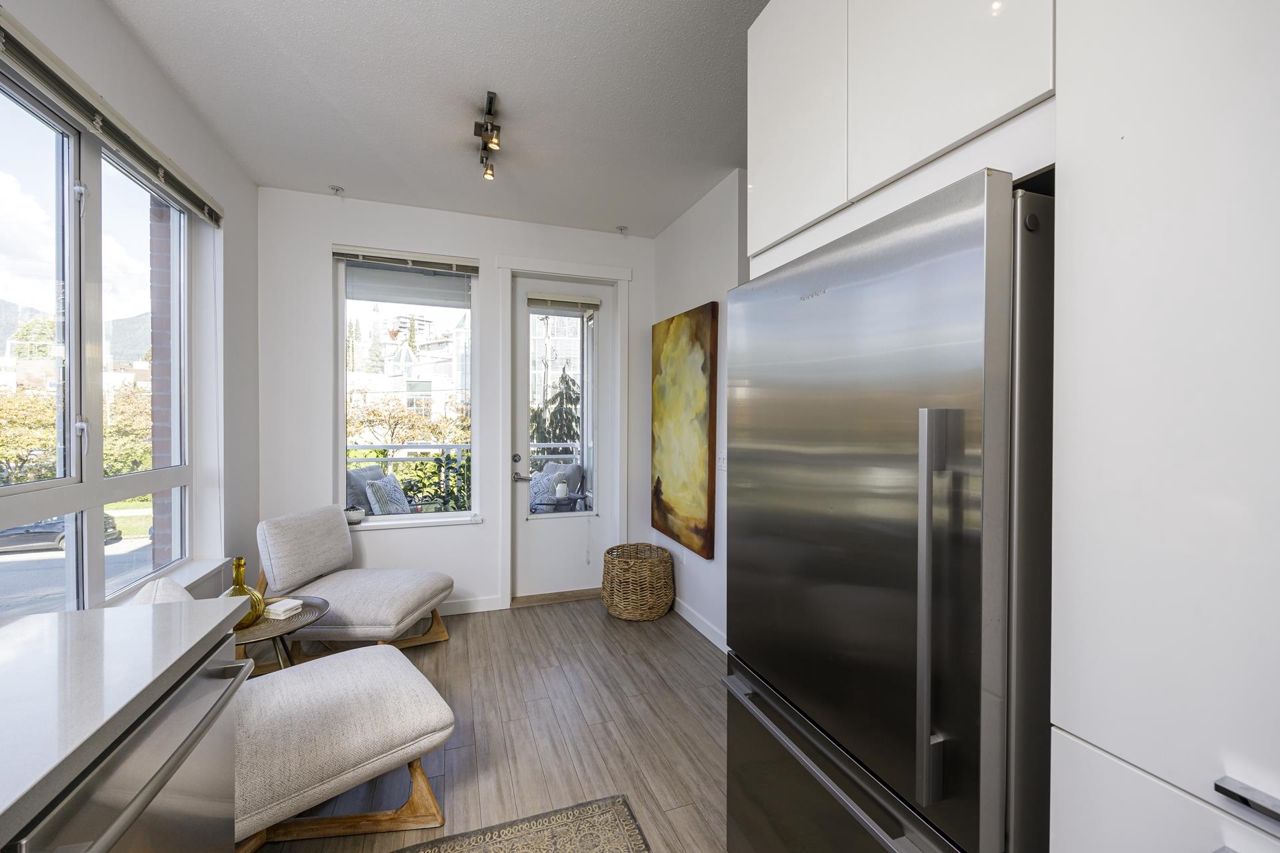 Inviting corner suite with mountain views located in sought after Queen Mary reflecting the urban West Coast contemporary architecture. Offering a thoughtfully designed layout with 9' ceilings and sophisticated interior design details, it features two bedrooms, two full bathrooms and a bright open-plan living space with in floor radiant heat, smooth engineered stone counters, laminate flooring and custom cabinets. Gorgeous chef-inspired kitchen has quartz counters, stainless steel appliances and an adjoining breakfast nook/lounging area off the patio - ideal for entertaining. Nicely separated bedrooms with the primary boasting walk-in closet and ensuite with soaker tub and heated floors! Steps to Victoria Park this well situated condo is quality living at its best!