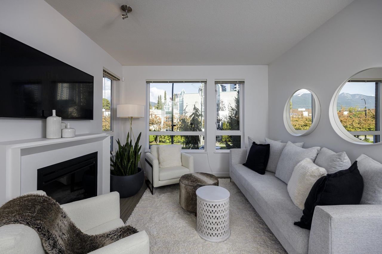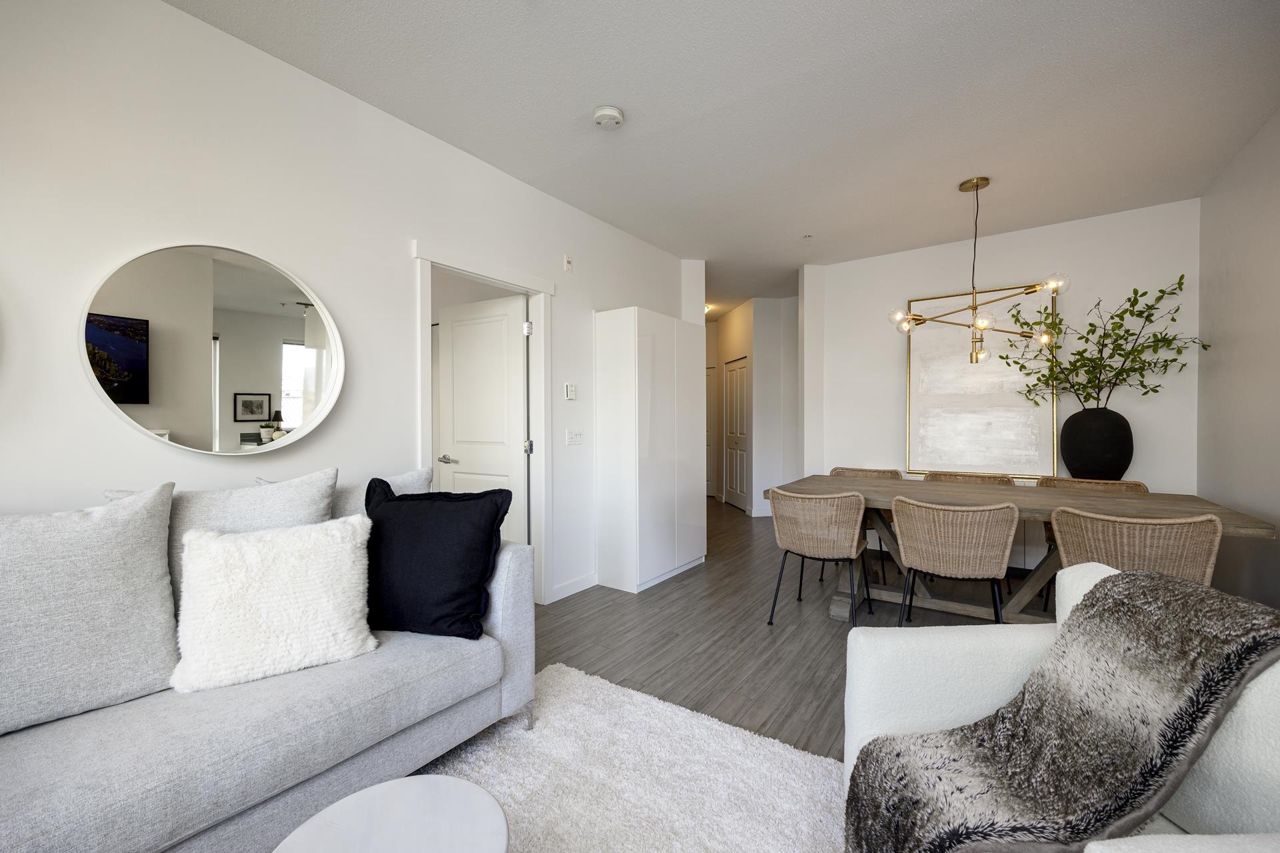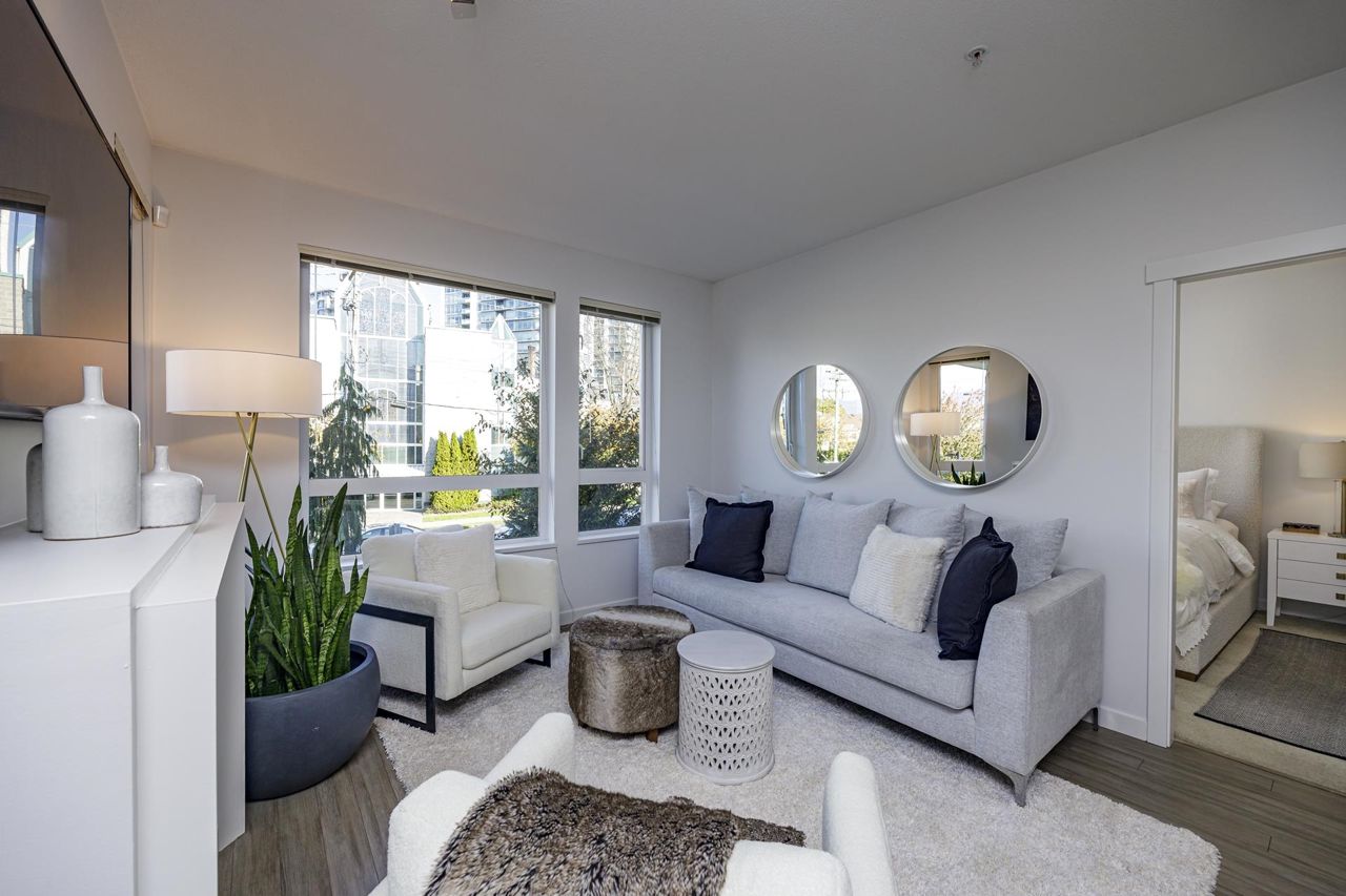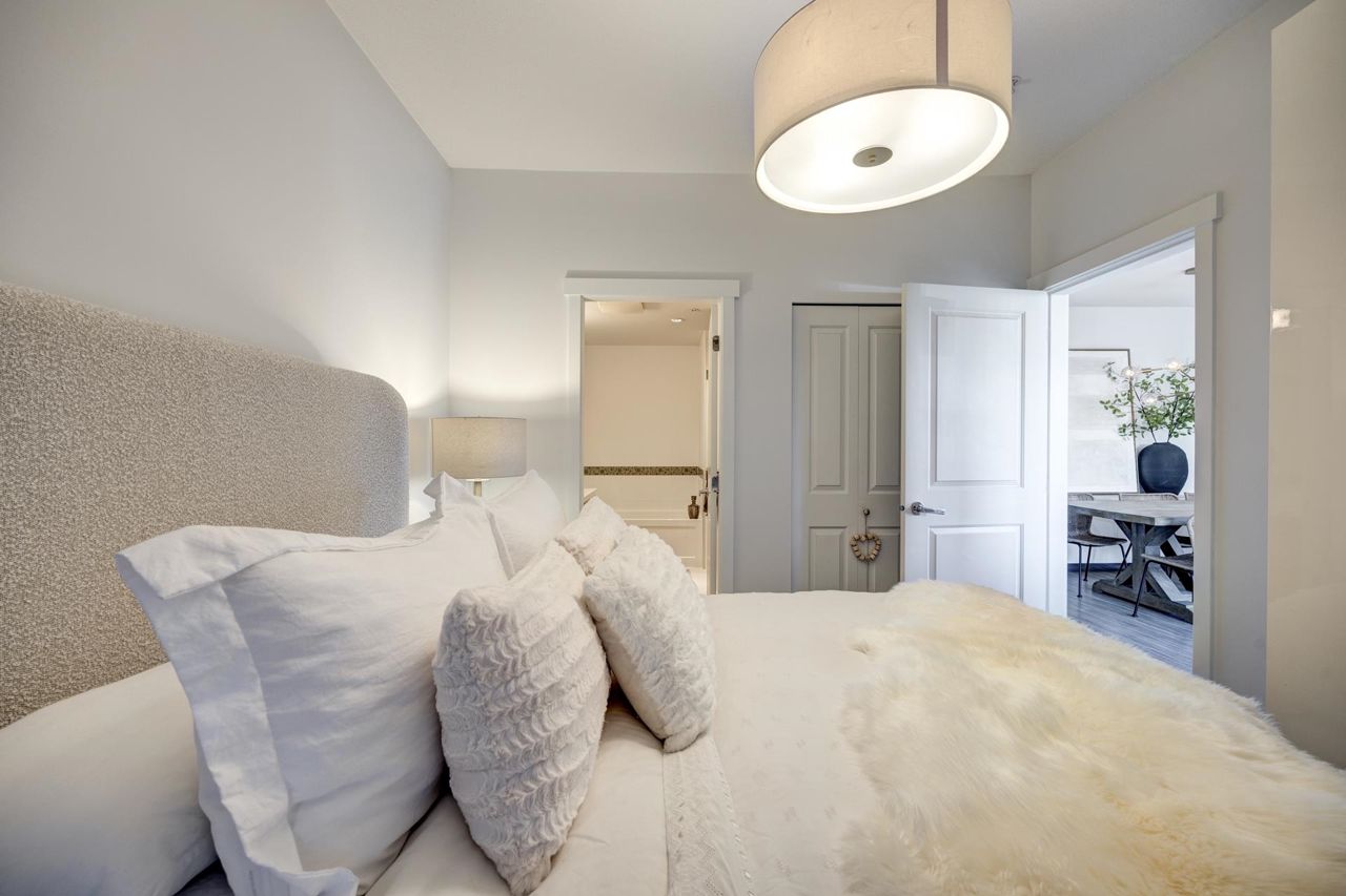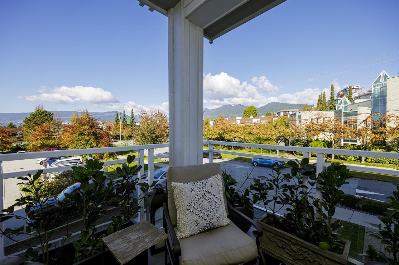 Inviting corner suite with mountain views located in sought after Queen Mary reflecting the urban West Coast contemporary architecture. Offering a thoughtfully designed layout with 9' ceilings and sophisticated interior design details, it features two bedrooms, two full bathrooms and a bright open-plan living space with in floor radiant heat, smooth engineered stone counters, laminate flooring and custom cabinets. Gorgeous chef-inspired kitchen has quartz counters, stainless steel appliances and an adjoining breakfast nook/lounging area off the patio - ideal for entertaining. Nicely separated bedrooms with the primary boasting walk-in closet and ensuite with soaker tub and heated floors! Steps to Victoria Park this well situated condo is quality living at its best!
