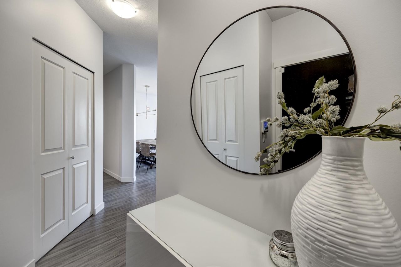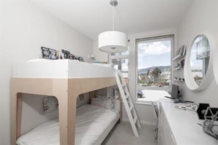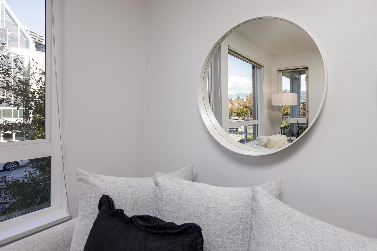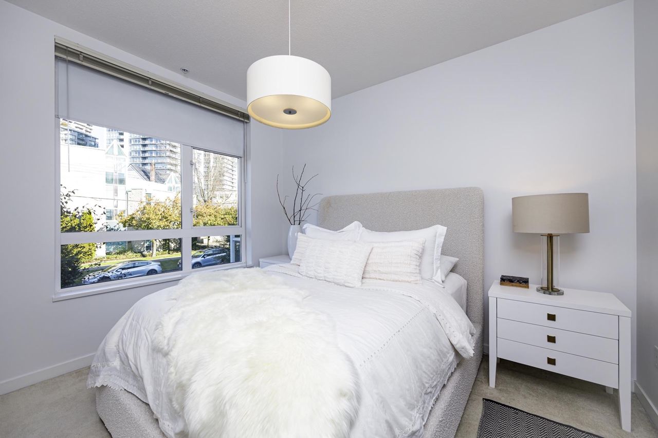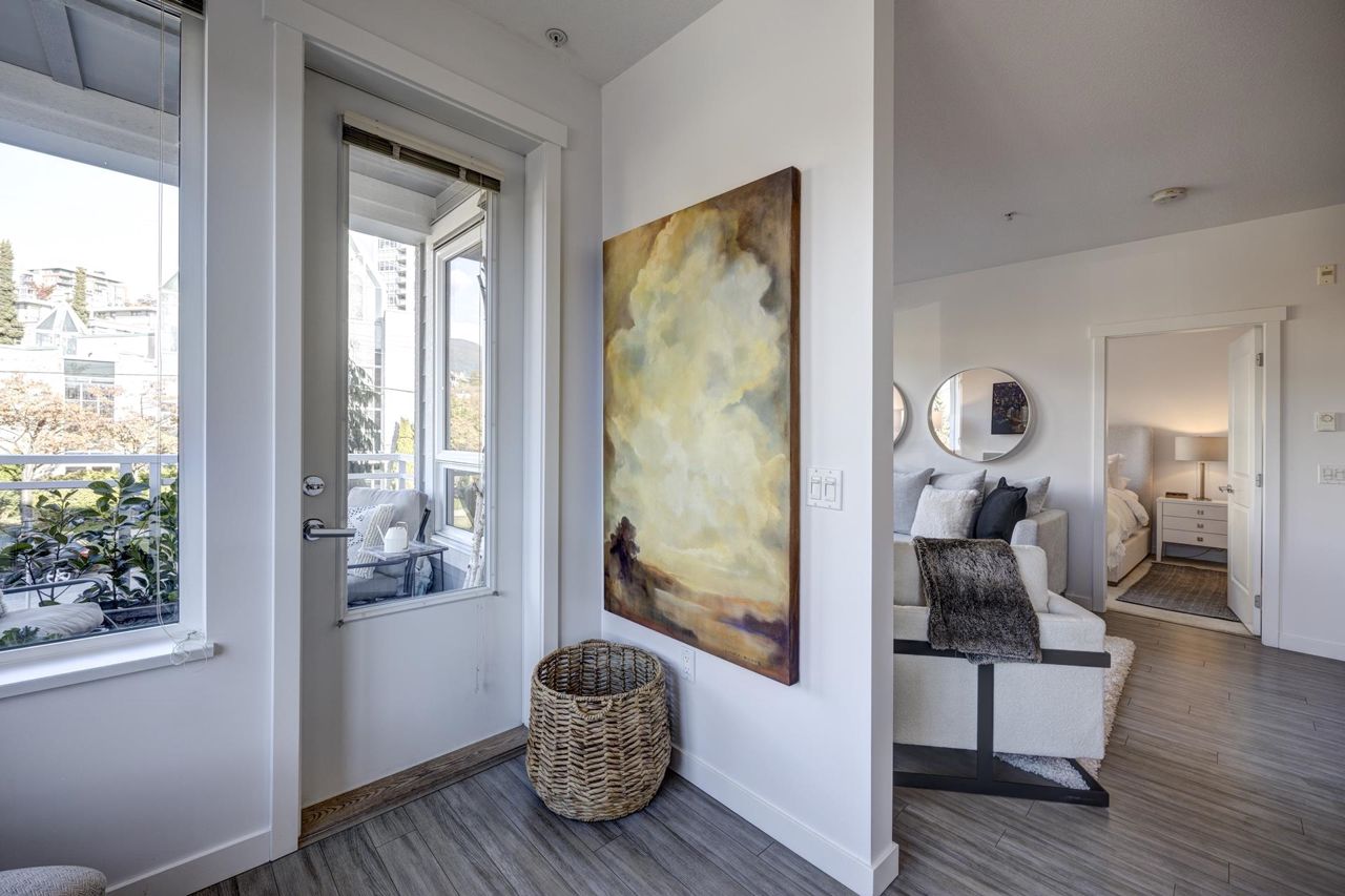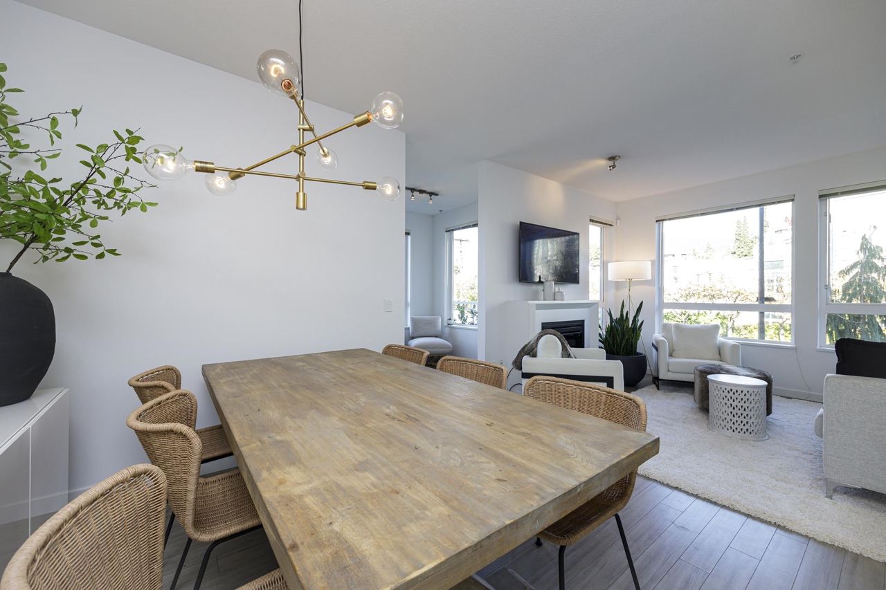 Inviting corner suite with mountain views located in sought after Queen Mary reflecting the urban West Coast contemporary architecture. Offering a thoughtfully designed layout with 9' ceilings and sophisticated interior design details, it features two bedrooms, two full bathrooms and a bright open-plan living space with in floor radiant heat, smooth engineered stone counters, laminate flooring and custom cabinets. Gorgeous chef-inspired kitchen has quartz counters, stainless steel appliances and an adjoining breakfast nook/lounging area off the patio - ideal for entertaining. Nicely separated bedrooms with the primary boasting walk-in closet and ensuite with soaker tub and heated floors! Steps to Victoria Park this well situated condo is quality living at its best!