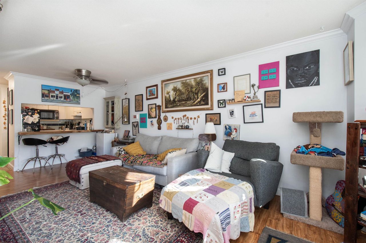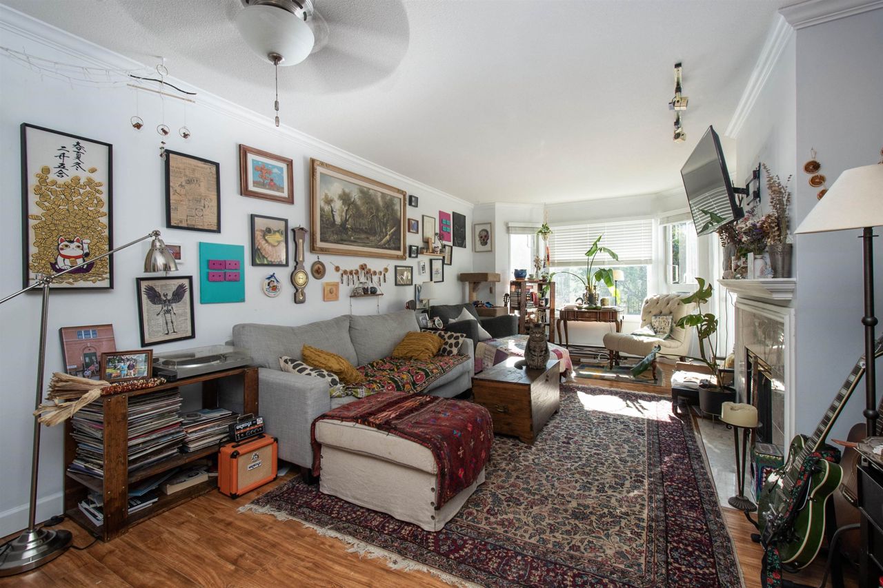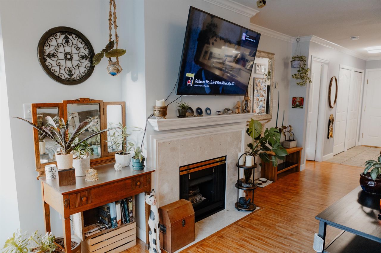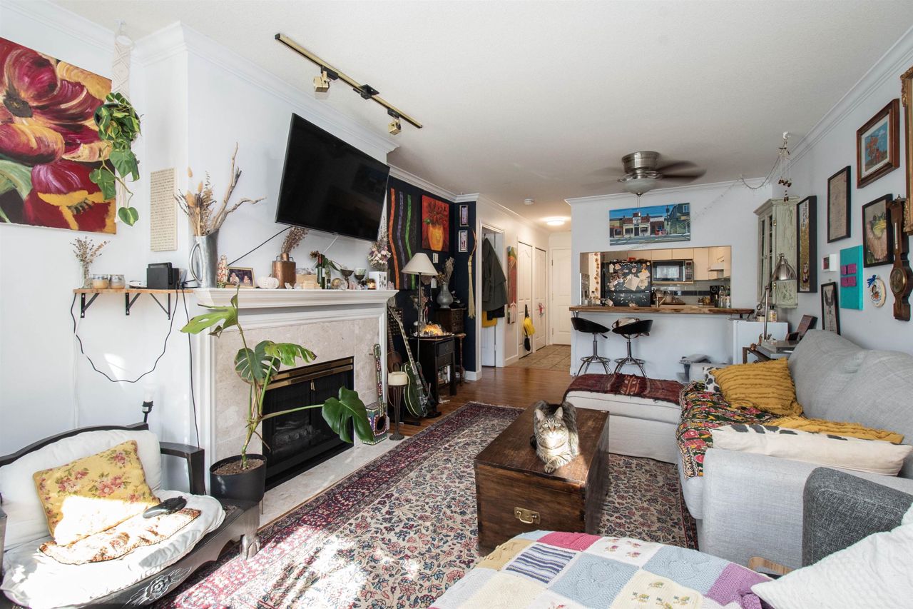 QUIET SIDE of the building, easy access and NOT GROUND FLOOR! Large 1 bedroom suite in this well maintained building. South facing for plenty of natural light, the suite offers large living and dining rooms with a cozy gas fireplace. No need to compromise on furniture size. Primary bedroom has a large closet and comfortably fits a king bed. Rounding off the suite is a good sized balcony, and IN SUITE LAUNDRY. No stairs or elevator required to get to the suite, but feel secure as the unit is not at ground level. Steps to everything Lower Lonsdale has to offer! 1 parking, 1 storage, cats okay, sorry no dogs. Open House Saturday, Jan 27th 2-3:30pm!