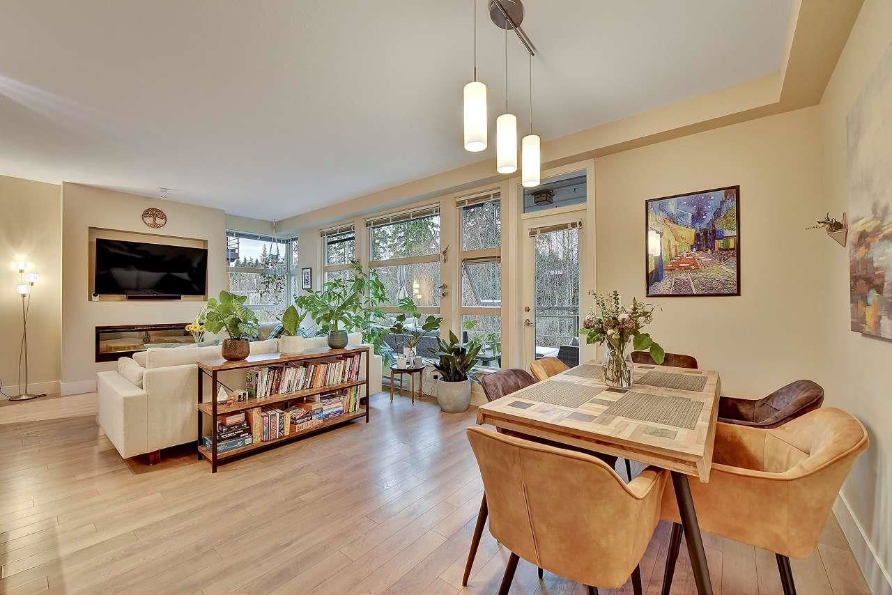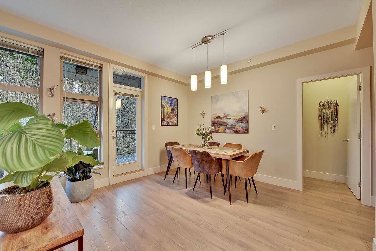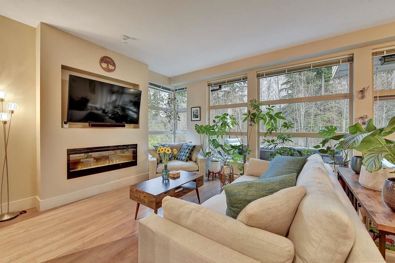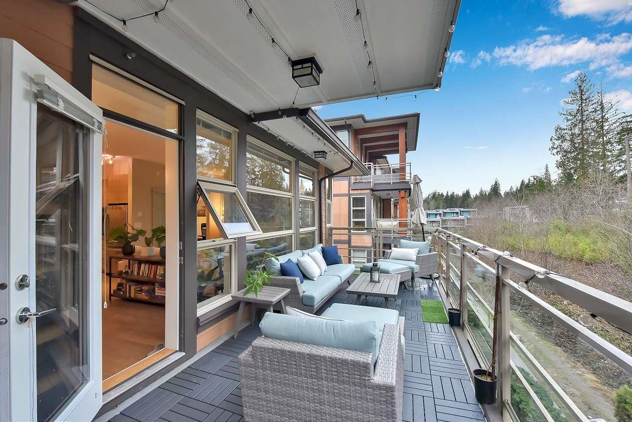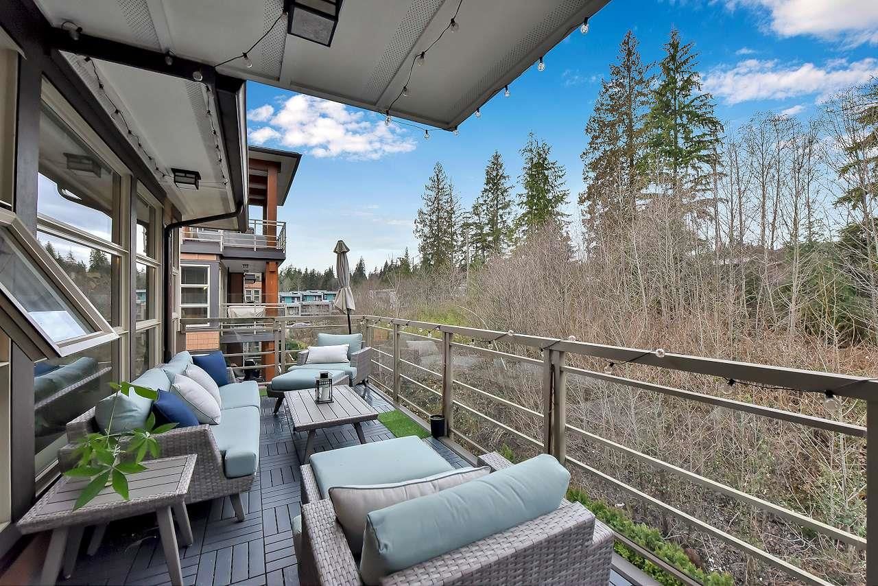 Welcome to Destiny 1 in Roche Point. This immaculate 3 bedroom corner unit features windows on 3 sides, with views of Burrard Inlet south from one, and a treed outlook from the kitchen-living-dining area. The spacious kitchen with gas cooktop opens onto the large dining and adjacent living room with electric fireplace and light laminate floors. Across the back a partially covered 200sqft deck overlooks treed privacy. The master bedroom is beyond the dining room and features a walk thru closet and spa like ensuite. Ensuite laundry and second bedroom with view of the Inlet complete this floor plan. 2 side by side parking stalls with electric car charger. Remote controlled blinds in Bedroom 2 and new patio flooring - Must see!
