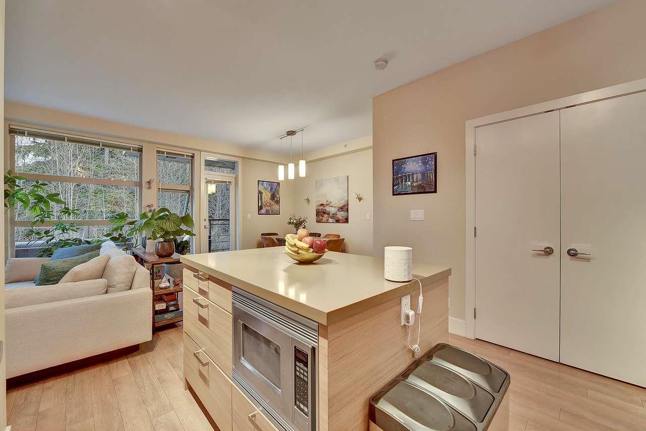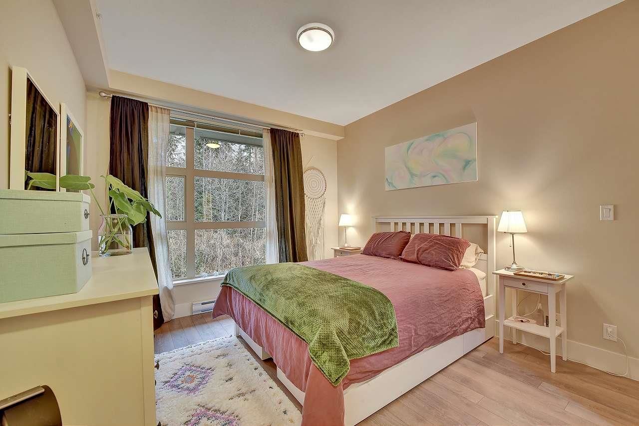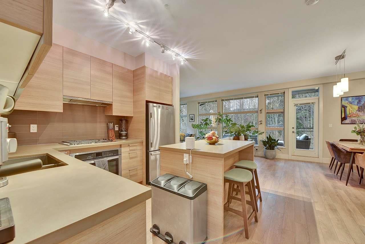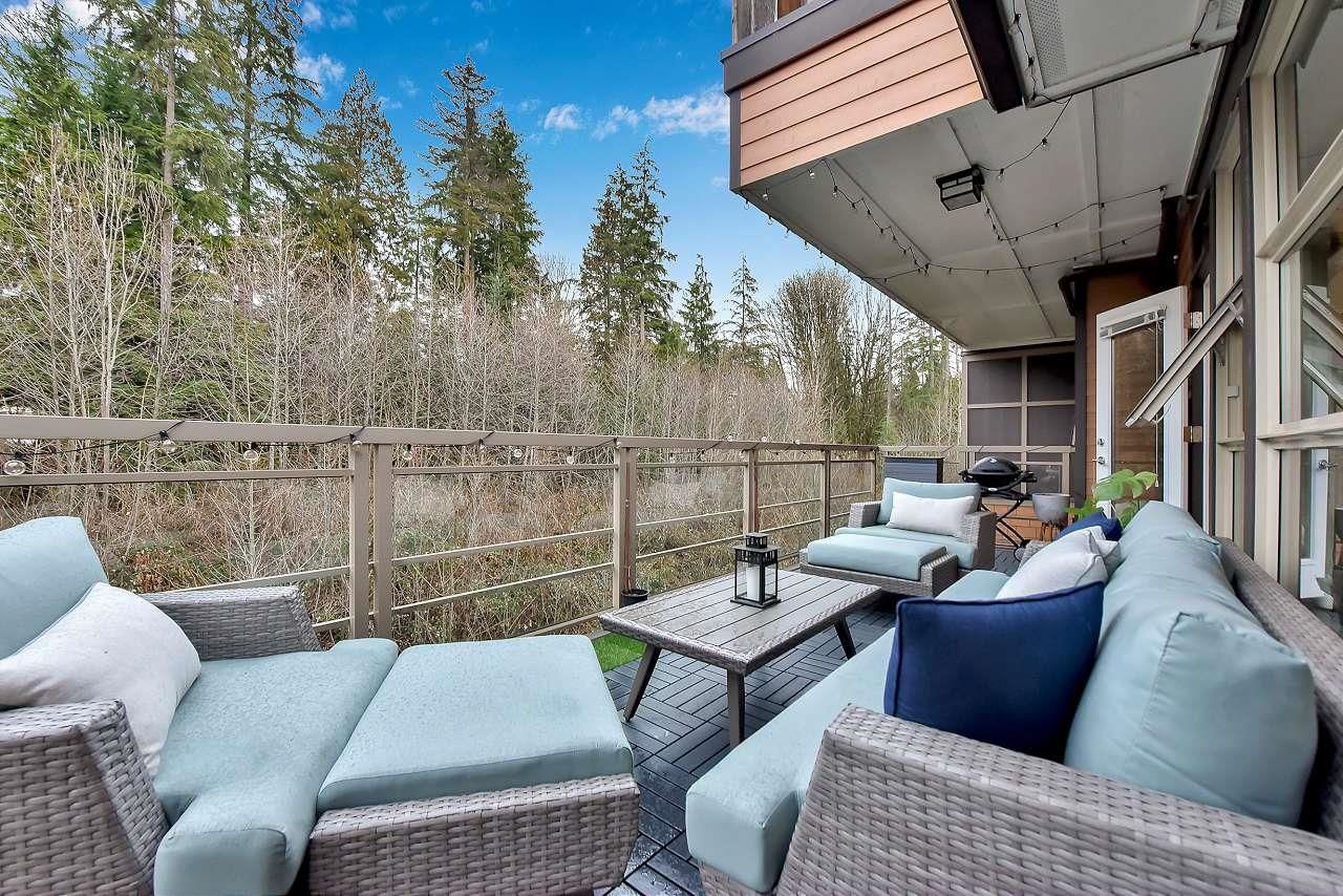 Welcome to Destiny 1 in Roche Point. This immaculate 3 bedroom corner unit features windows on 3 sides, with views of Burrard Inlet south from one, and a treed outlook from the kitchen-living-dining area. The spacious kitchen with gas cooktop opens onto the large dining and adjacent living room with electric fireplace and light laminate floors. Across the back a partially covered 200sqft deck overlooks treed privacy. The master bedroom is beyond the dining room and features a walk thru closet and spa like ensuite. Ensuite laundry and second bedroom with view of the Inlet complete this floor plan. 2 side by side parking stalls with electric car charger. Remote controlled blinds in Bedroom 2 and new patio flooring - Must see!