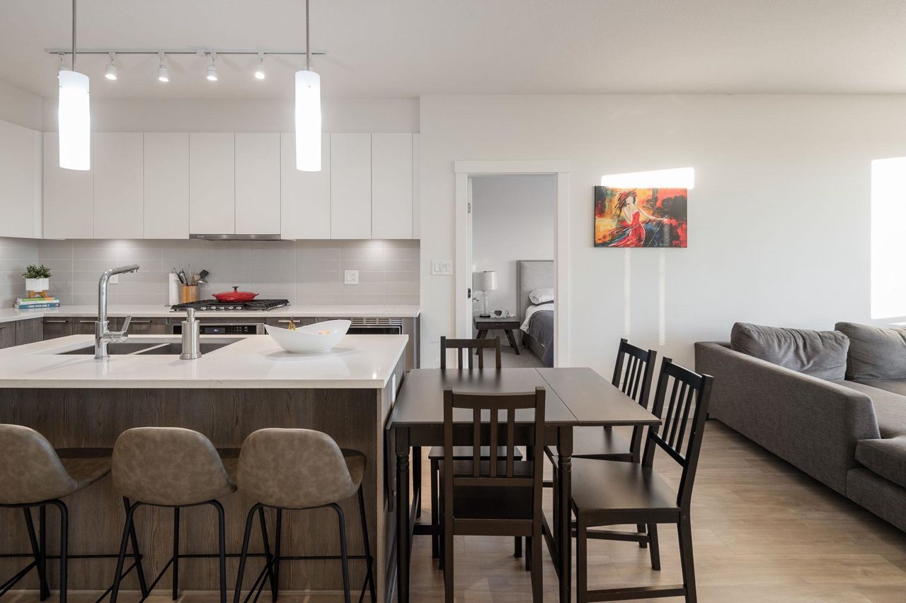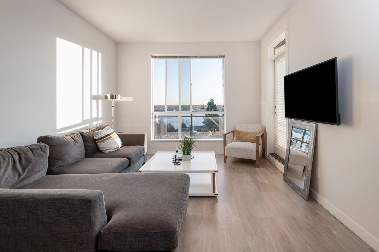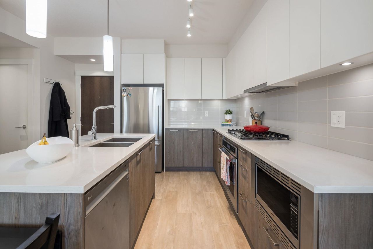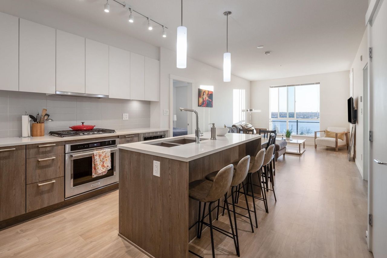 Welcome to Kindred, built by Fairborne & located in the new Moodyville neighbourhood, with 5 & 10 year warranty still in place. This 2 bedroom / 2 bathroom unit is on the South Side of the building for maximum natural light. In addition the patio is covered for year round use, & the kitchen has a gas cooktop with seating at the island, complimented by an oversized sink with a well laid out den space. The large master ensuite boasts a double sink, & large stand up shower. Amenity spaces include a party room & outdoor BBQ area. Pet friendly building, with rentals allowed over 30 days. Close to Lonsdale Quay & right on a transit loop, right next to Moodyville Park & the Spirit Trail with a short stroll to the Brewery District, come view this home before it's gone.