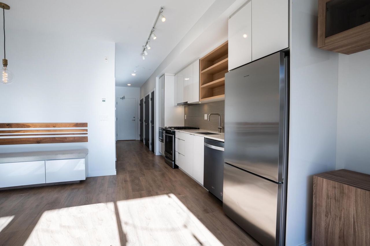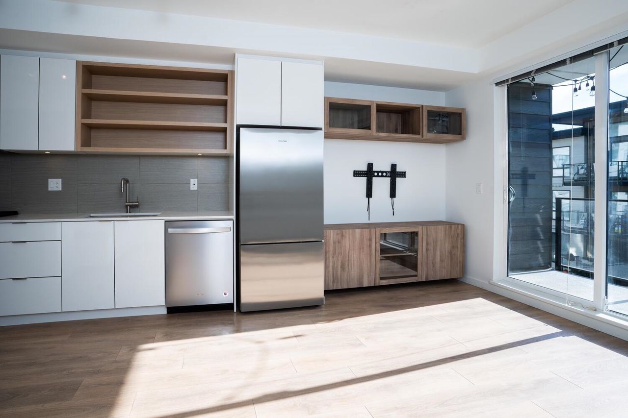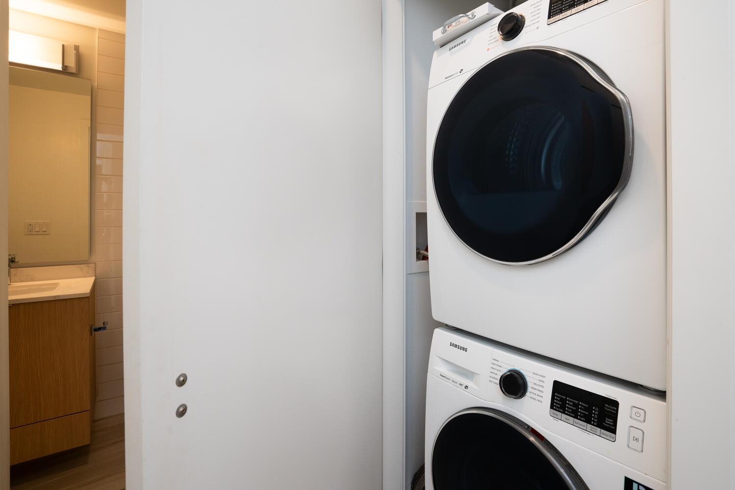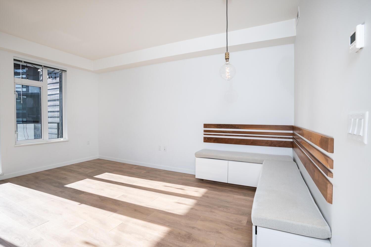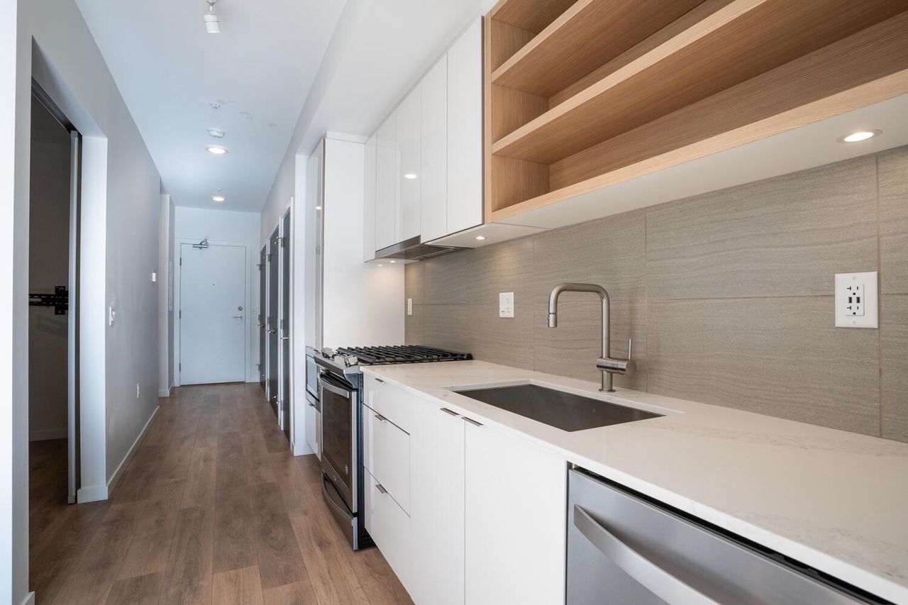 Welcome to the highly desirable Marine + Fell building by Anthem Properties. This 1 bdrm home is located on the quiet, sunny South side of the building facing the courtyard. Featuring radiant in floor heating, quartz counter tops, stainless steel appliances and a gas range for the chef. Huge bright sundeck to enjoy the afternoon sun and 9 ft ceilings make this space seem extra spacious. 2 Pets and rentals allowed, building also has EV charges and a bike room. come see your new home today!