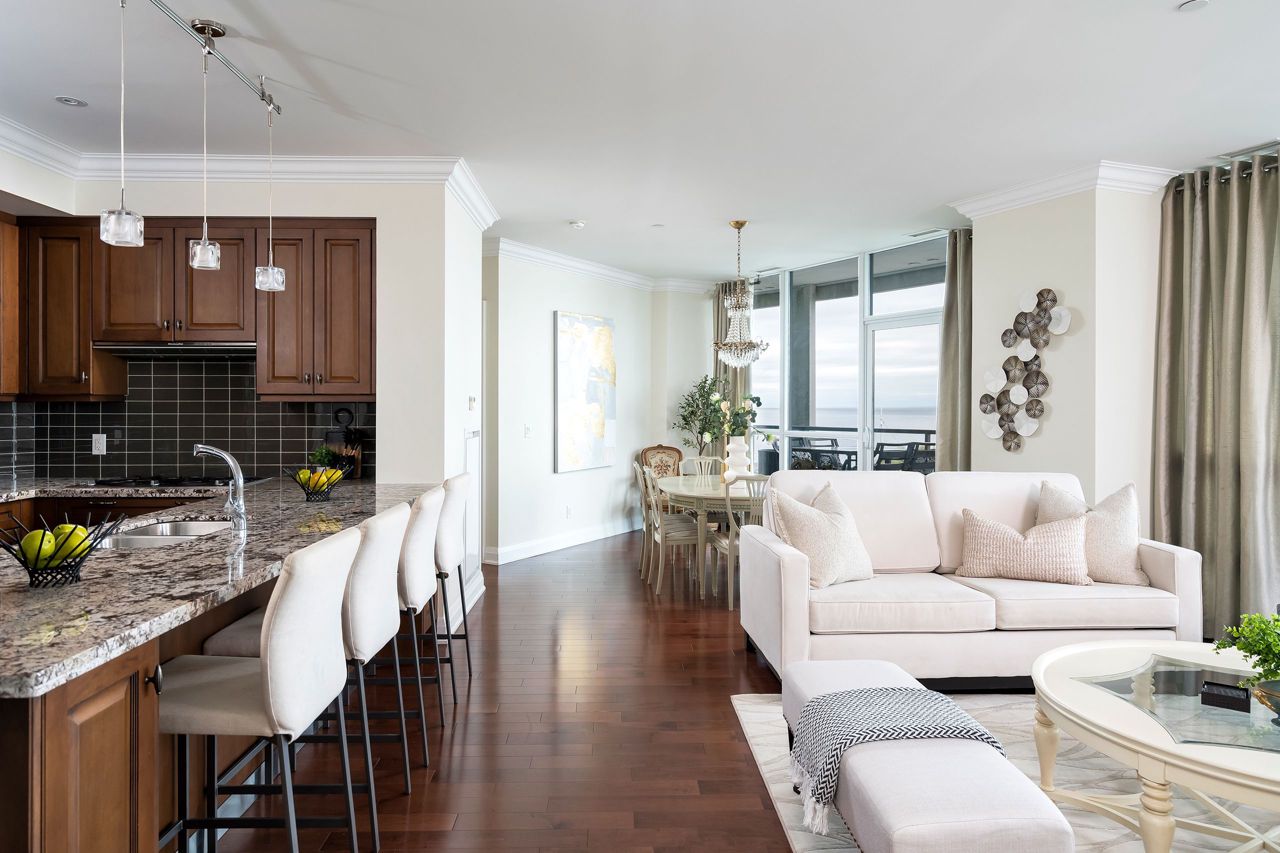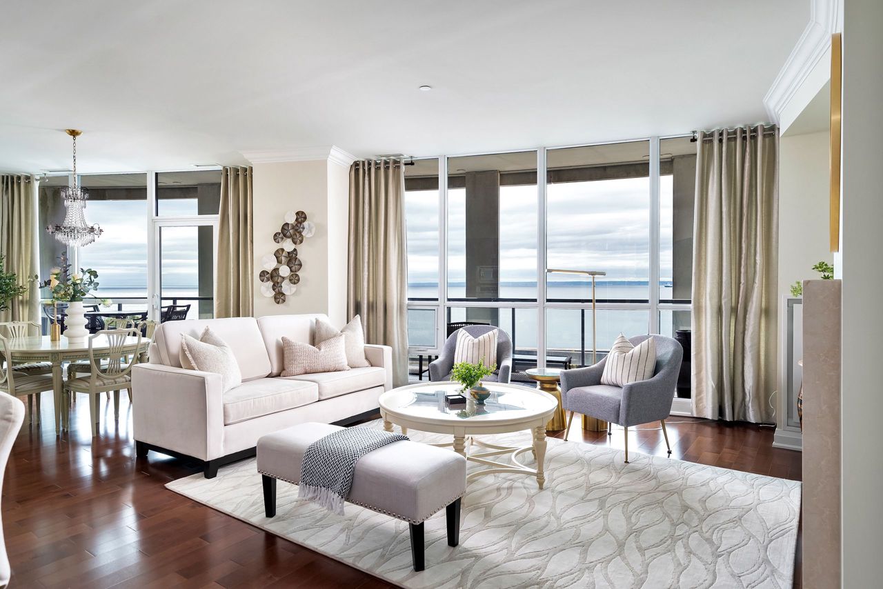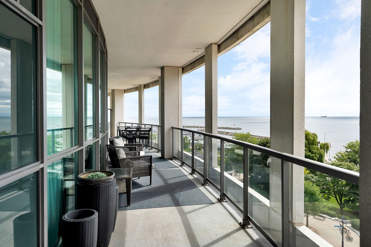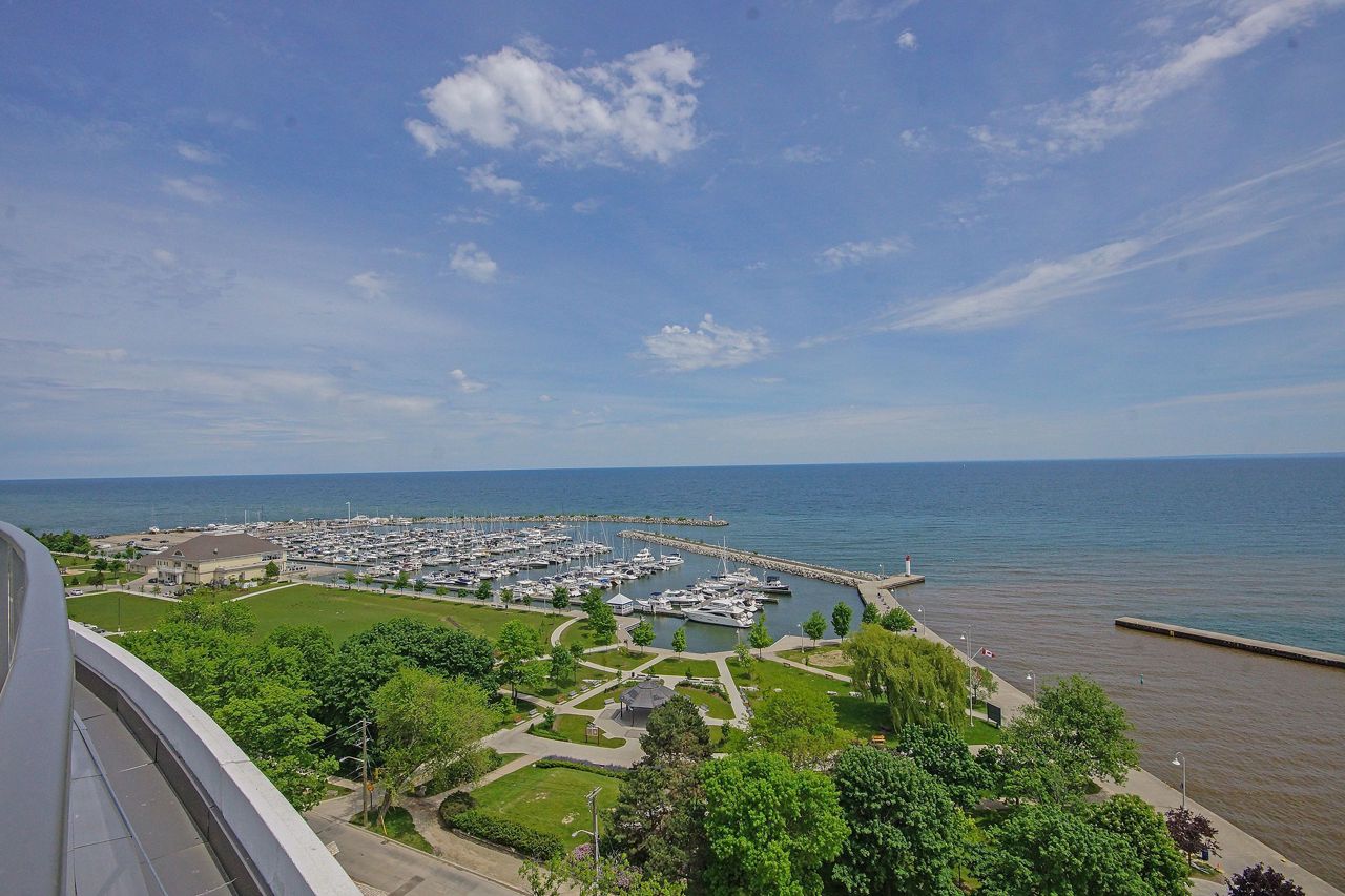 An exceptionally rare layout, “The Faering” unit is a unique pie shaped, extra wide, suite offering almost 1,400 sq ft of living space with full panoramic views of Lake Ontario. Enjoy morning sunrises and evening sunsets - all from your 60 foot long, 440 sq ft balcony. You enter the suite into a proper formal foyer, rarely found in condominiums. The oversized kitchen features built-in appliance, granite countertops, pot drawers and bar seating for 4 and rare walk-in pantry with 2nd fridge. The living/dining room, with stunning gas fireplace, are flooded with natural light, and have breathtaking lake views through the floor to ceiling widows dressed in custom drapery. The spacious primary suite features a walk-in closet as well as a spa-like ensuite with double vanity, soaker tub and glass shower. Enjoy the walkability of living on the water’s edge in the heart of Bronte Village at this resort inspired condominium.The Shores features some of the best amenities of any condo in Oakville including 24-hour concierge, resort-like rooftop inground pool with hot tub, fitness studio with incredible lake views and temperature-controlled wine storage etc.