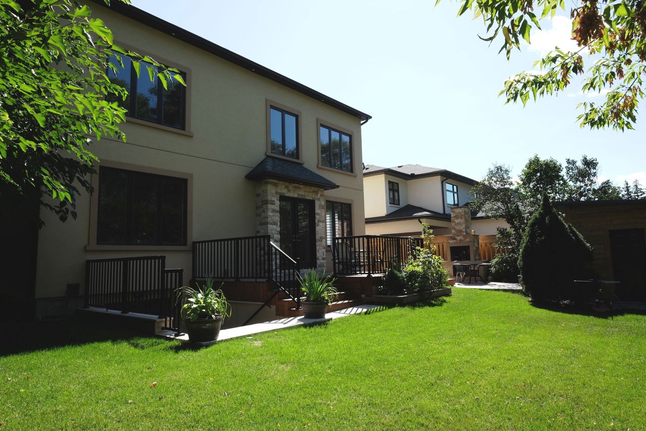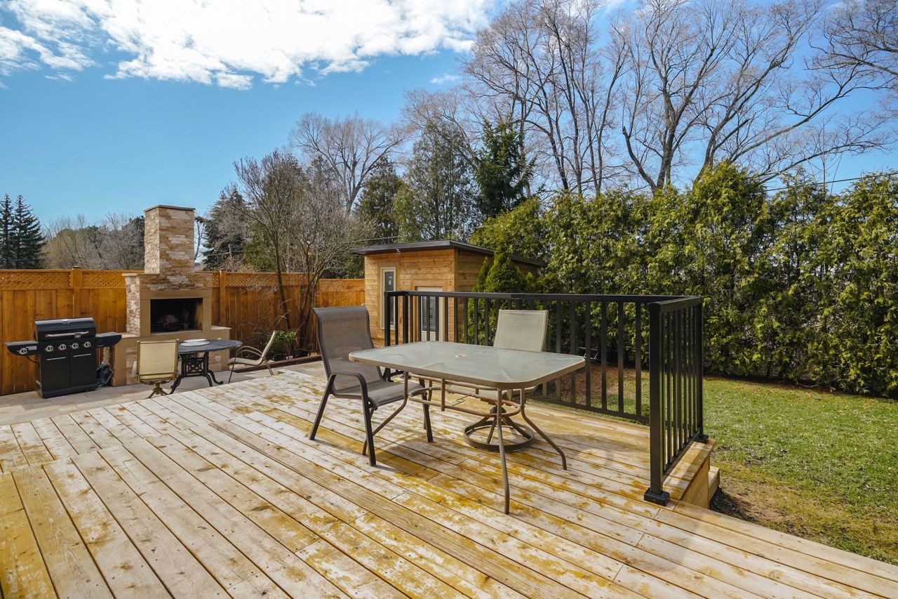 A private & quiet tree lined backyard, tiered deck, patio, stone bbq, 74 ft across the back, no neighbours behind, room for future pool.