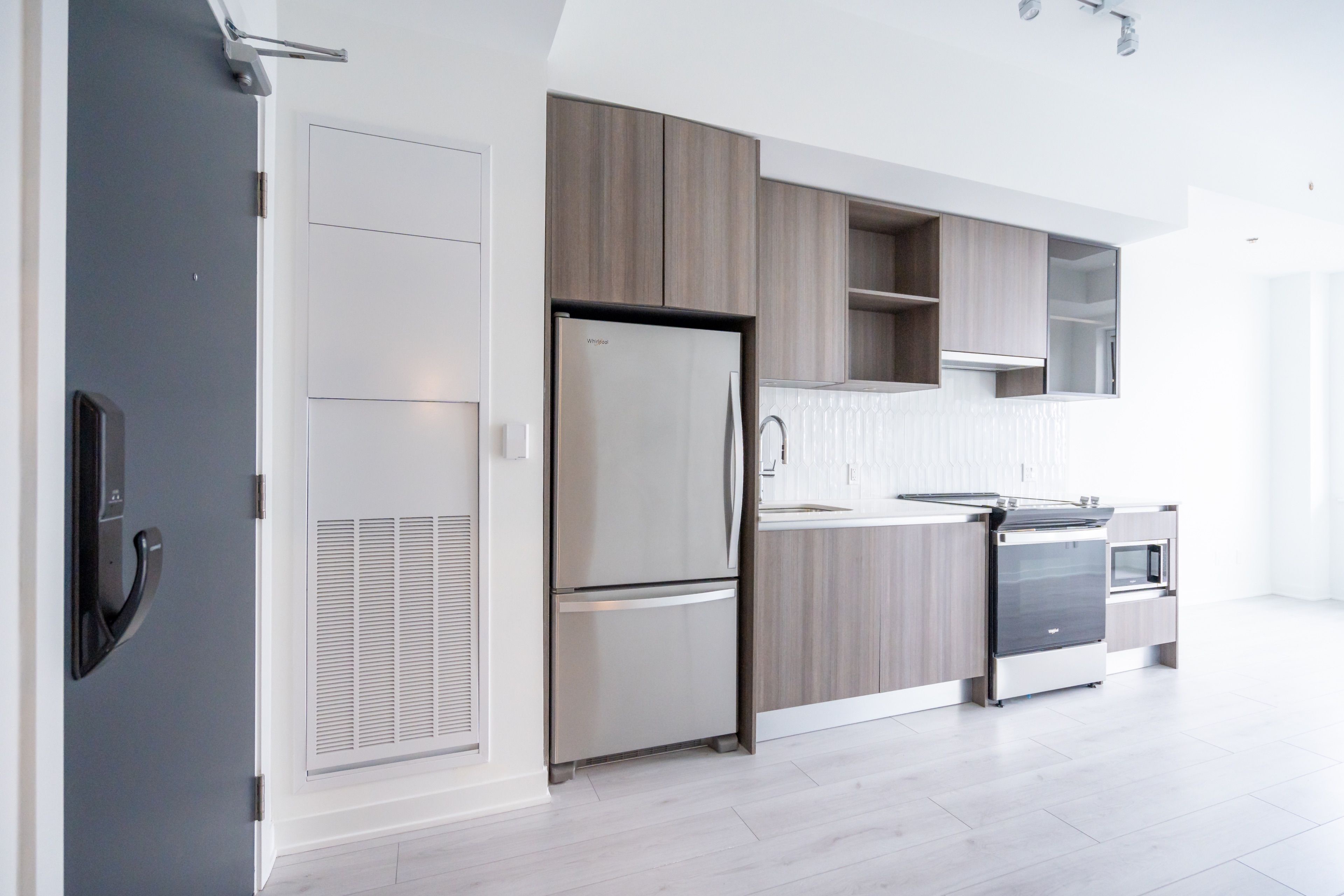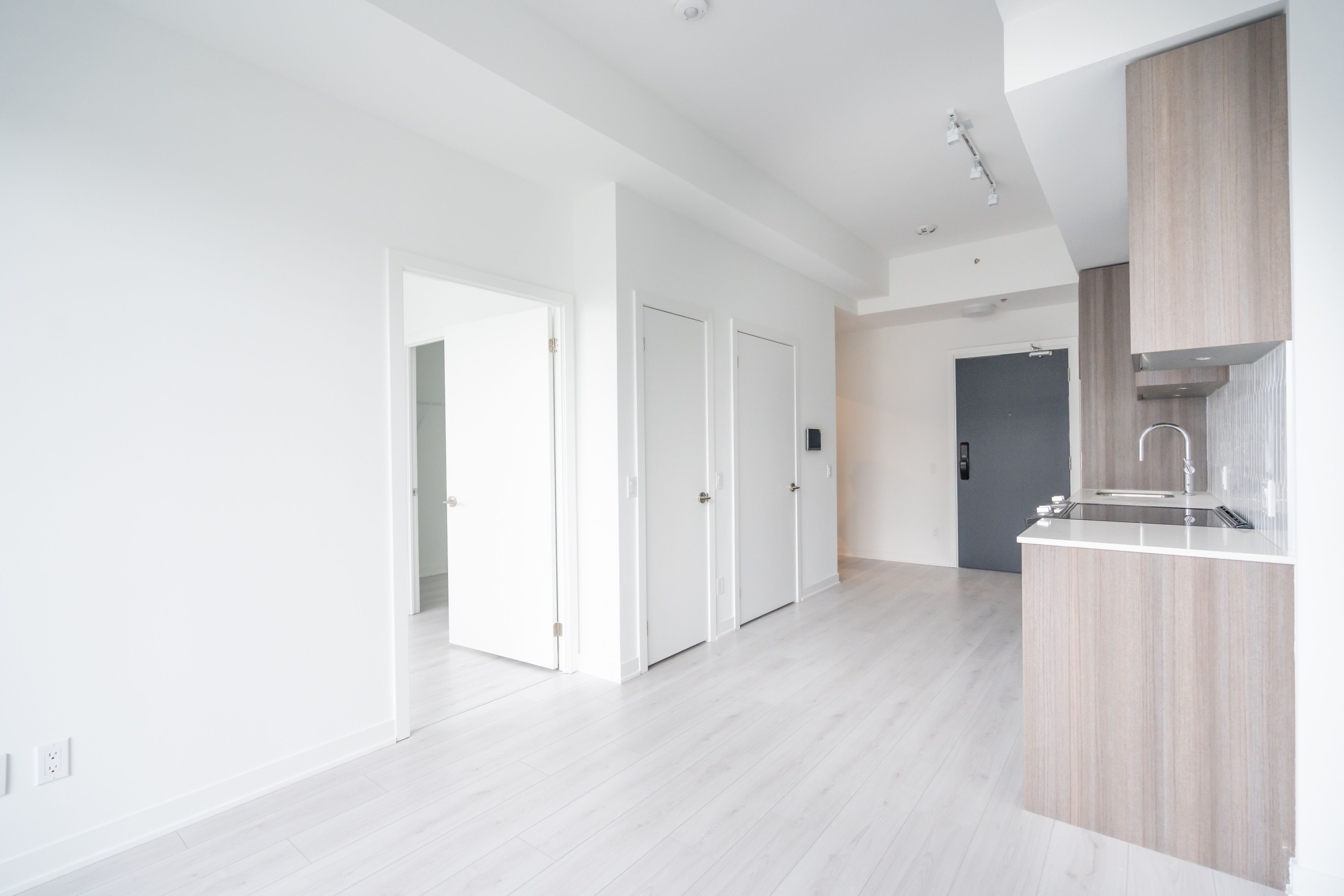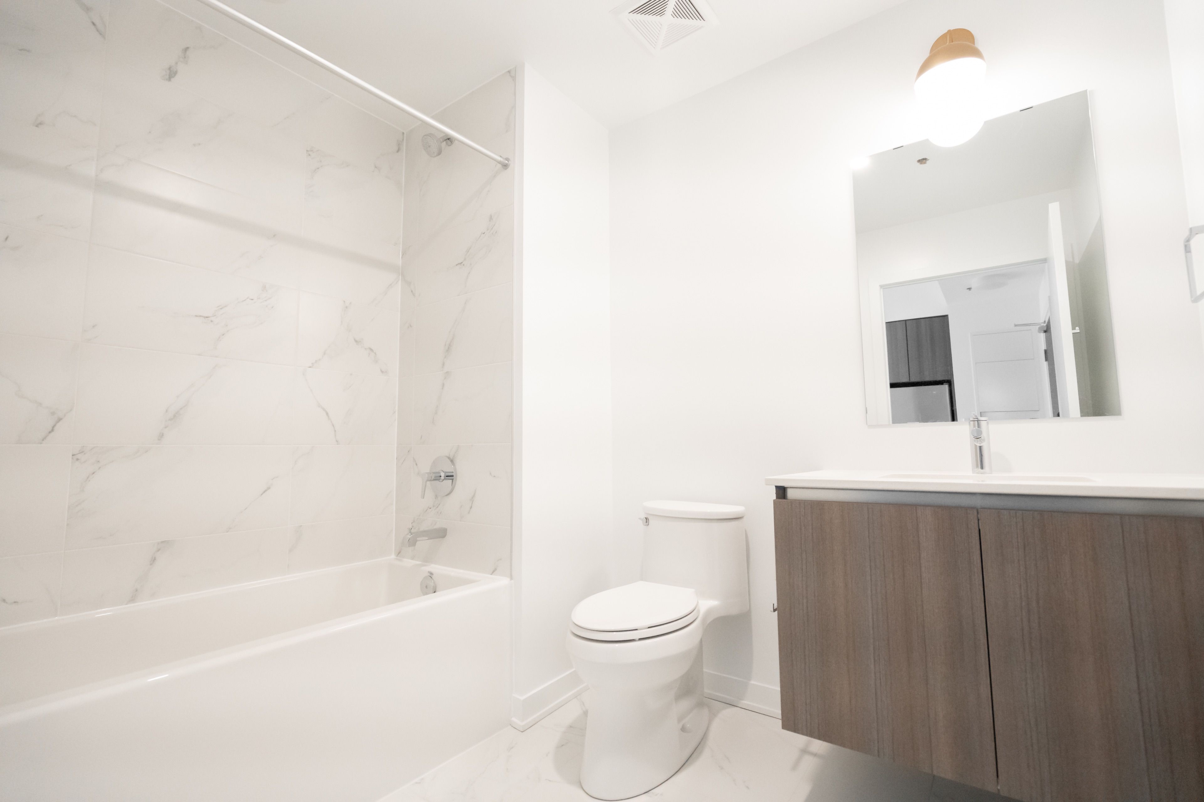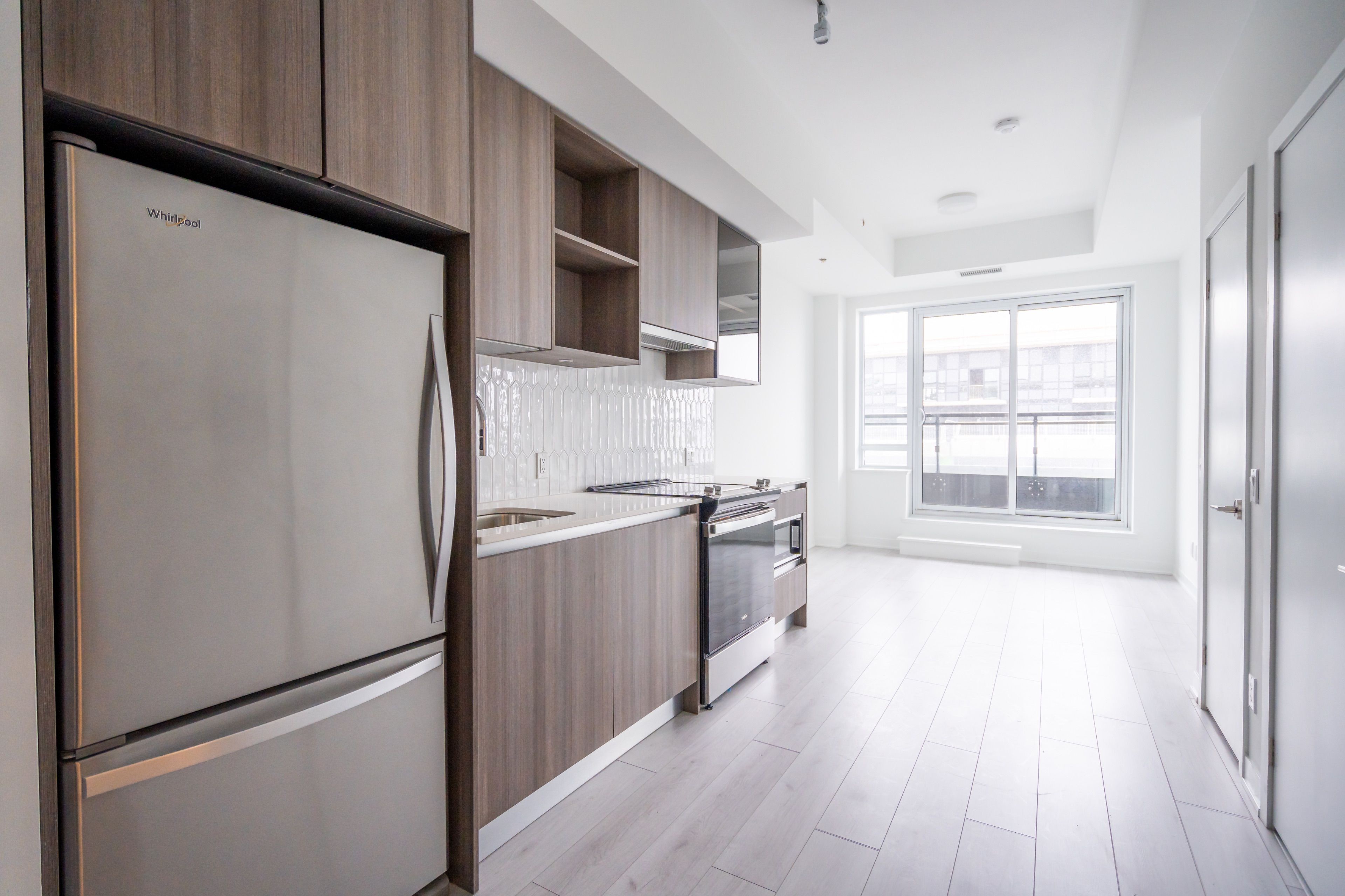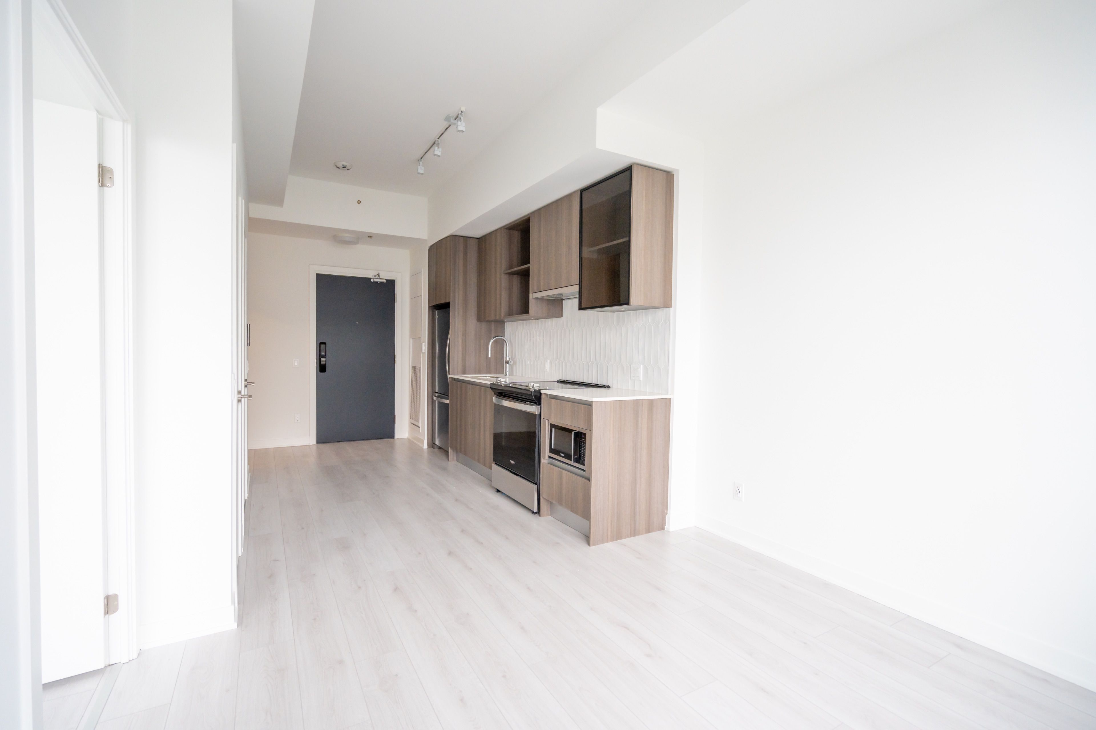 Welcome to Distrikt Trailside! This exclusive lower penthouse unit offers the pinnacle of luxury living in a contemporary 1-bedroom, 1-bath layout. With 10-foot smooth ceilings across a 600 sqft interior and a 114 sqft balcony equipped with a gas line, every detail is designed to maximize natural light and open-concept flow. Enjoy a gourmet kitchen with ample storage. The kitchen boasts laminate cabinetry, soft-close drawers and cabinets, porcelain backsplash tile, a single basin undermount stainless steel sink with a single lever faucet, and a convenient pulldown spray. Equipped with an AI Smart Community System, the unit ensures enhanced security with digital door locks and an in-suite touchscreen wall pad. As a lower penthouse, this unit provides elevated views and an added sense of exclusivity. Residents have access to a host of spectacular amenities, including 24-hour concierge services, on-site property management, a parcel storage system and mail room, and a pet washing station. Health and wellness are prioritized with a double-height fitness studio featuring state-of-the-art weights and cardio equipment, along with dedicated indoor and outdoor spaces for yoga and Pilates. Additionally, the 6th-floor amenity area offers an extensive space complete with a chef kitchen, private dining room, cozy lounge with a fireplace, and a games room for relaxation and entertainment. Experience the ultimate in luxury and exclusivity in this meticulously designed penthouse unit at Distrikt Trailside!