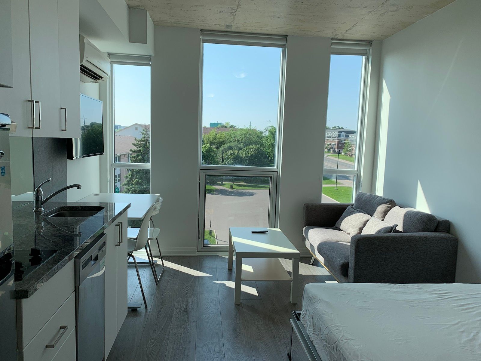 Modern Stylish Bachelor Unit With Large Clear View Floor to Ceiling Window, Bathroom New Paint, Bright & Clean, Functional Open Concept Layout, Ideal for Student, Couple, Young Proffessional, Walking Distance to Ontario Tech University & Durham College. Building Featured Usb Charging Station, Social Lounge/Lobby, Concierge, Fitness Facility, Visitor Parking & Bike Storage Room etc.Fully Furnished: Private Hi Speed Internet, Murphy Bed W/ Mattress, Coffee Table, Couch, Desk, Desk Chair, 2 Chairs, Wall Mounted Tv, Microwave, S/S Fridge, Dish Washer, 2 Burner Stove, Range Hood, Front Load Washer & Dryer.