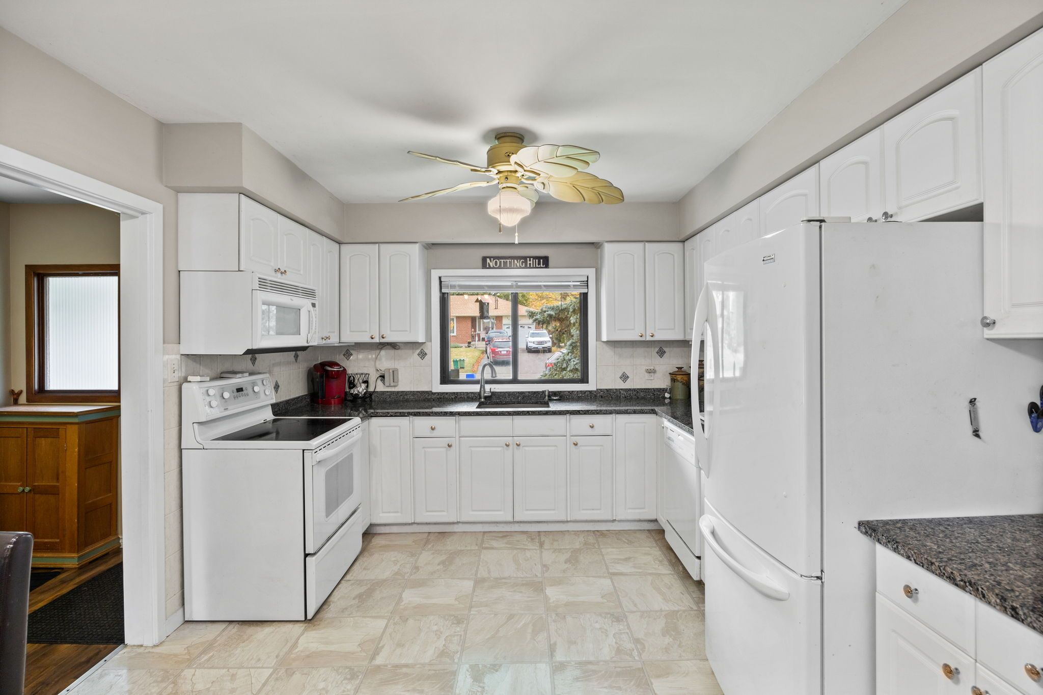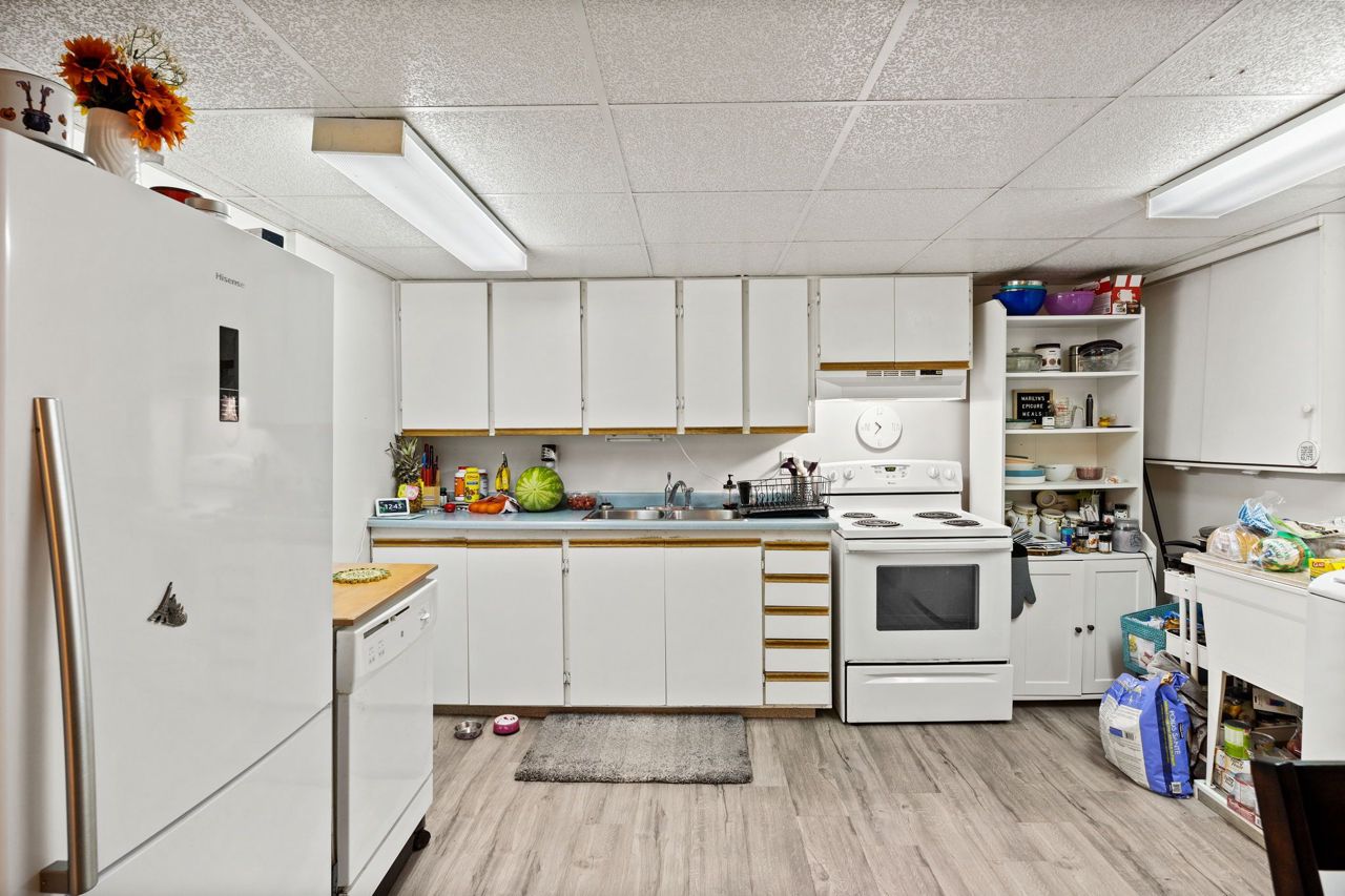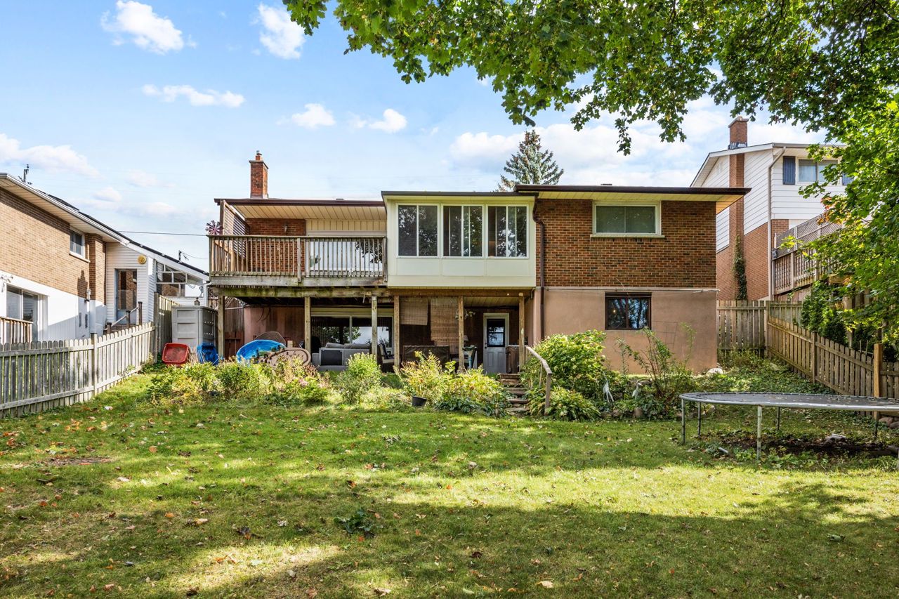 West Oshawa Bungalow on a quiet street in an established neighbourhood near schools, parks, Oshawa Golf & Curling Club, shopping centre and more! Huge oversized fenced back yard with sunny Western exposure. Open concept layout with renovated classic white kitchen overlooking dining and living room. Walk-out from dining room to sunroom and deck. Main floor 5 piece bathroom with his and hers basins. Finished basement with huge recreation room with fireplace with gas fireplace insert, big picture window and walk-out to backyard, 2 extra bedrooms, office and 2nd kitchen. Easy-care laminate floors. This is an ideal property for an extended family.