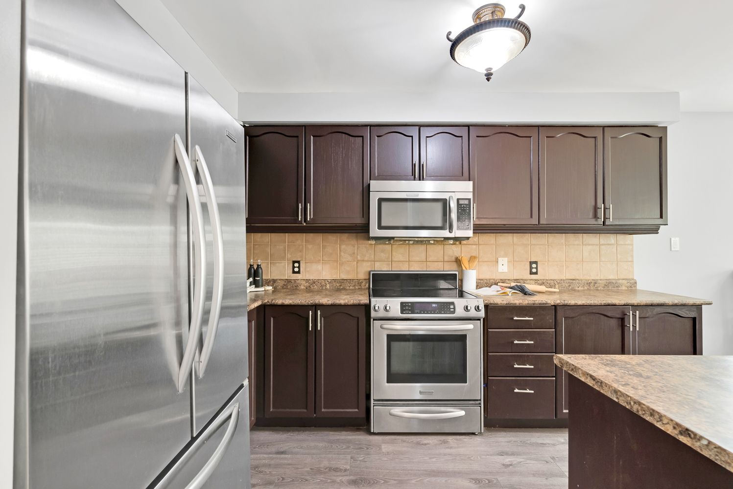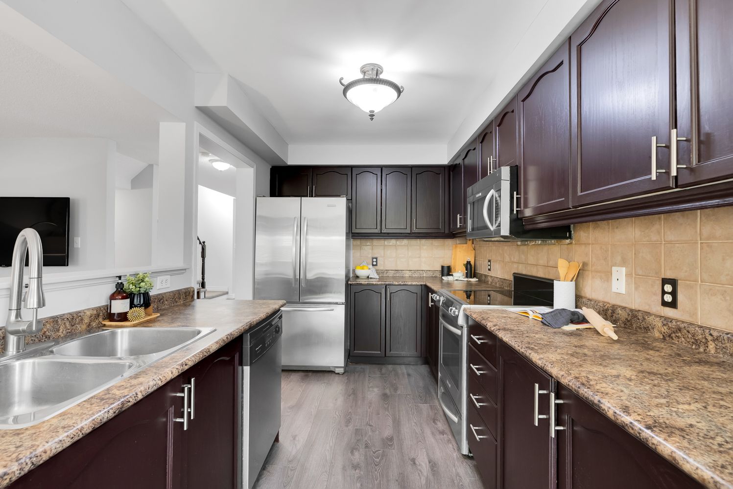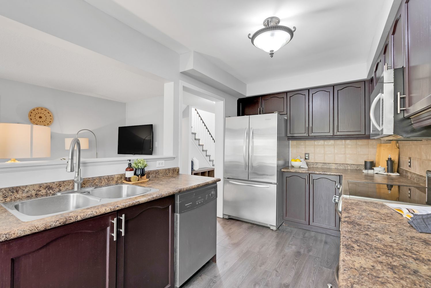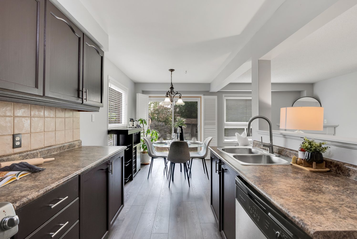 You would never know this beautiful home was a Townhouse! Spacious end unit has room for the whole family. Main floor foyer opens up to bright open concept living room with fireplace, eat-in kitchen with stainless steel appliances, plenty of cupboard space, and walk-out to backyard, with gate access. Upstairs features 3 well-appointed bedrooms, including a very large primary bdrm with walk in closet and 4pc ensuite. Basement features a tastefully finished in-law suite complete with open kitchen, ss appliances, 3pc bath and large bedroom.Upgrades include: Fresh paint throughout (2023), Carpet on stairs (2023), Main & upper flooring (2022), Basement renovation (2017)