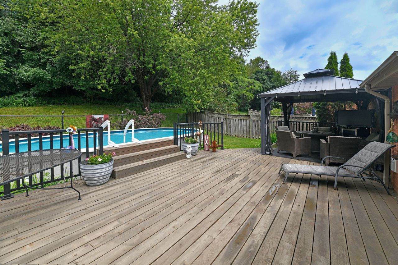 Fabulous 3+2 Bedroom Open Concept Bungalow Located In a Mature North Oshawa Neighbourhood Backing Onto Ravine/Greenspace! Updated Kitchen W/ Stainless Steel Appliances, Granite Counters & Large Kitchen Island Opening Onto a Open Living Room and W/O to Large Deck. Fully Finished Lower Level includes Spacious In-Law Suite w/2 Bedrooms, 3 Pc Bathroom, as Fireplace, Family Rooms etc... Tranquil & Tastefully Landscaped Backyard Features a Heated Above Ground Pool & 35'X17' Deck with Gazebo offering picturesque views of greenspace/ravine.See Attached Schedules & Floor Plans