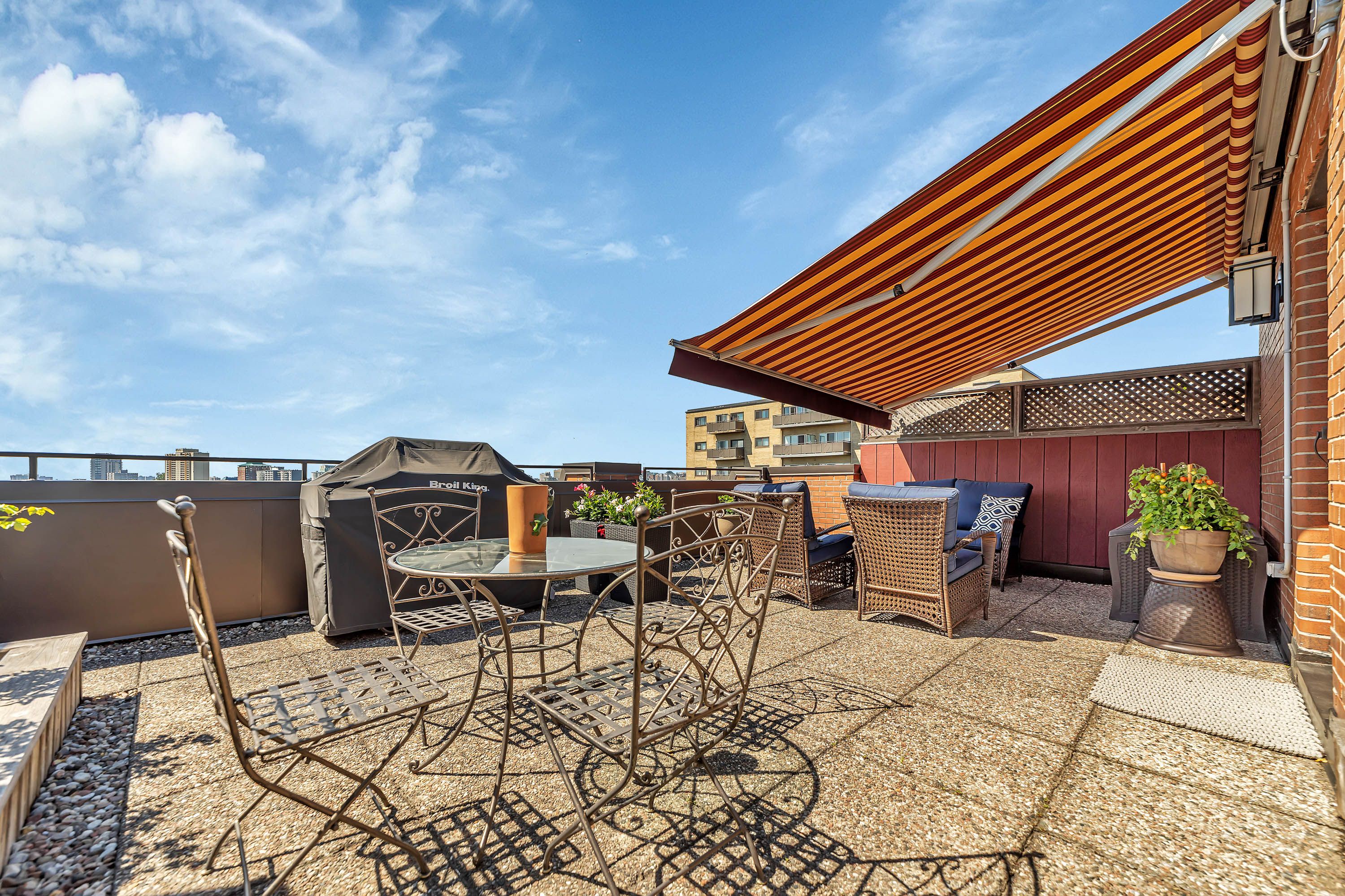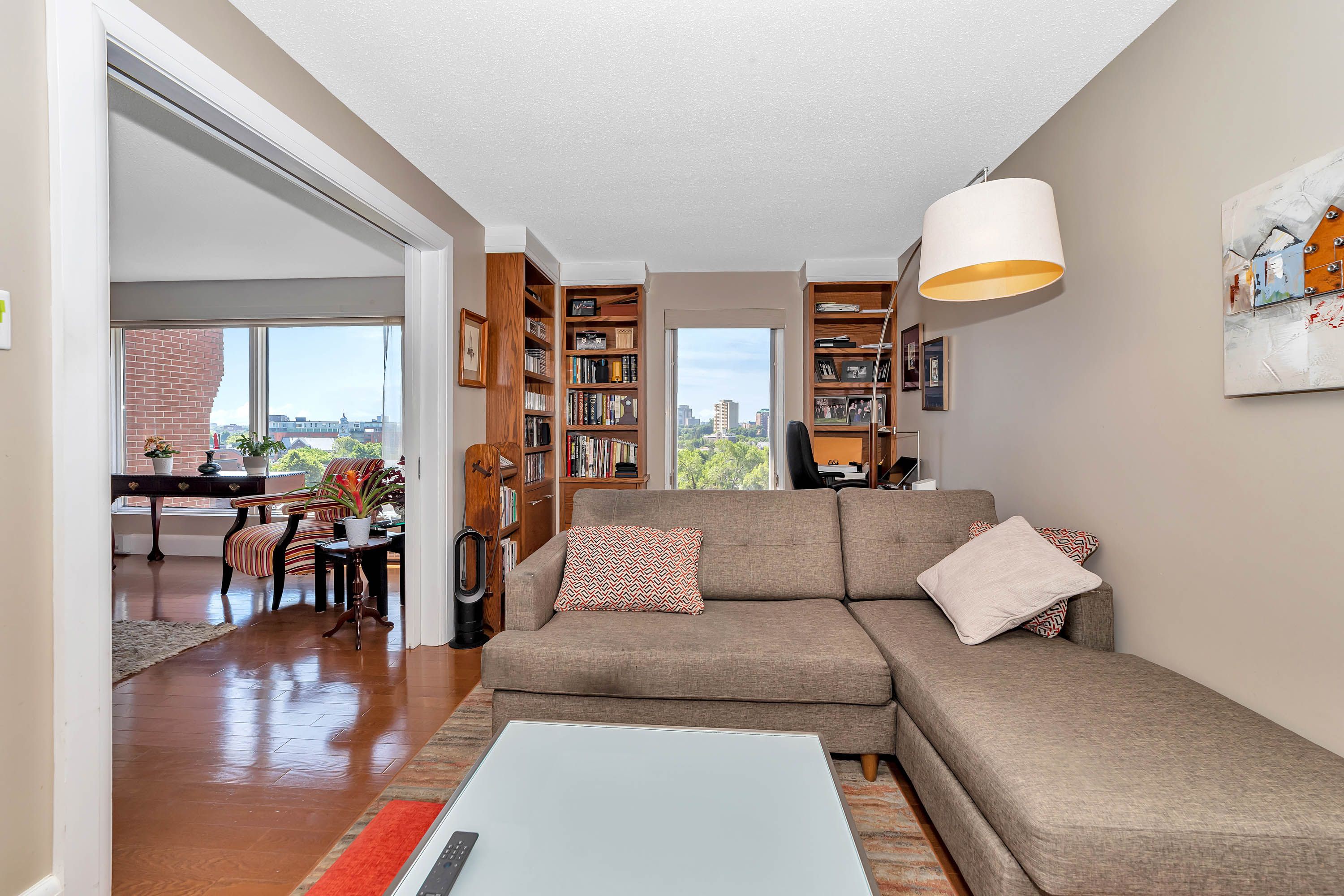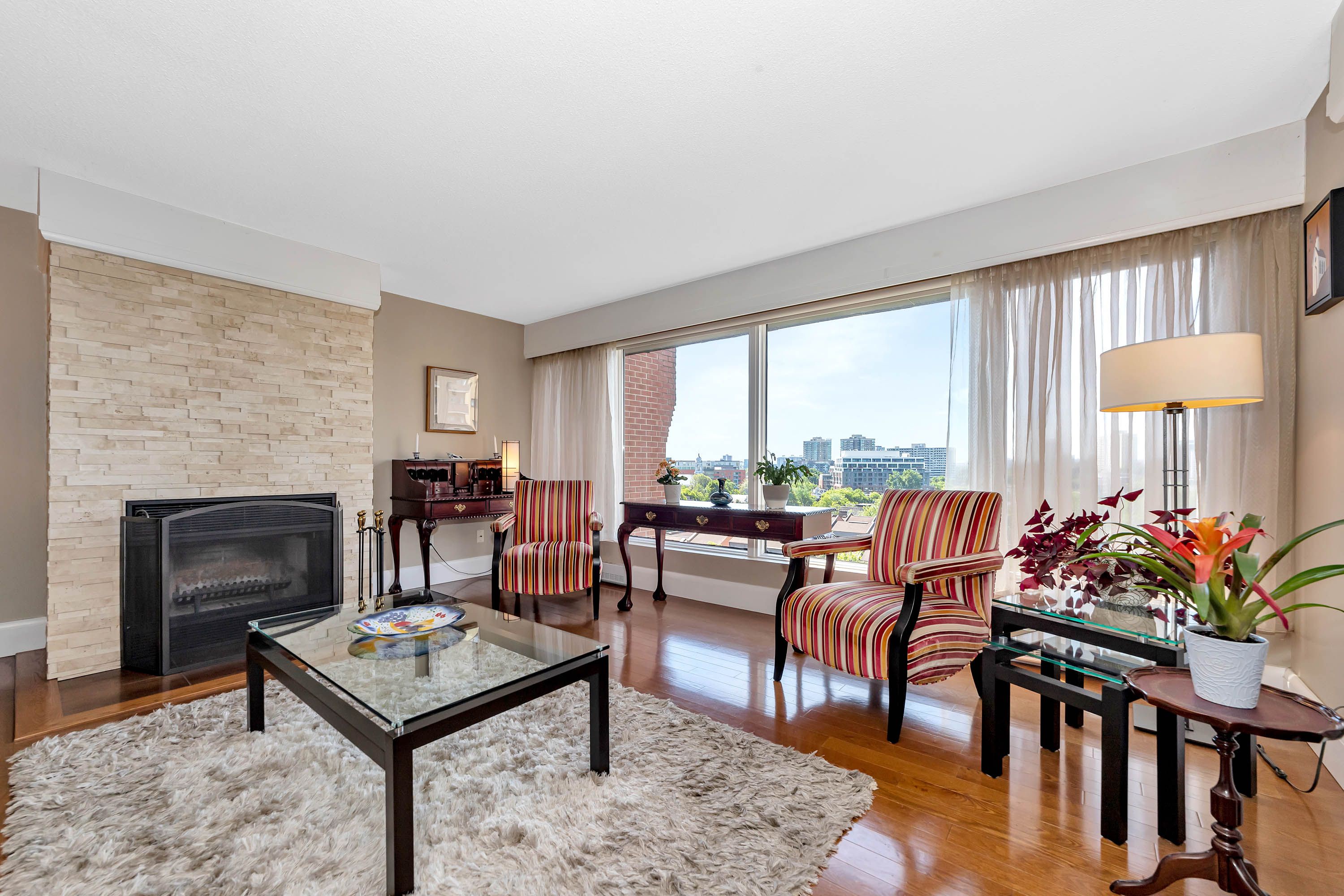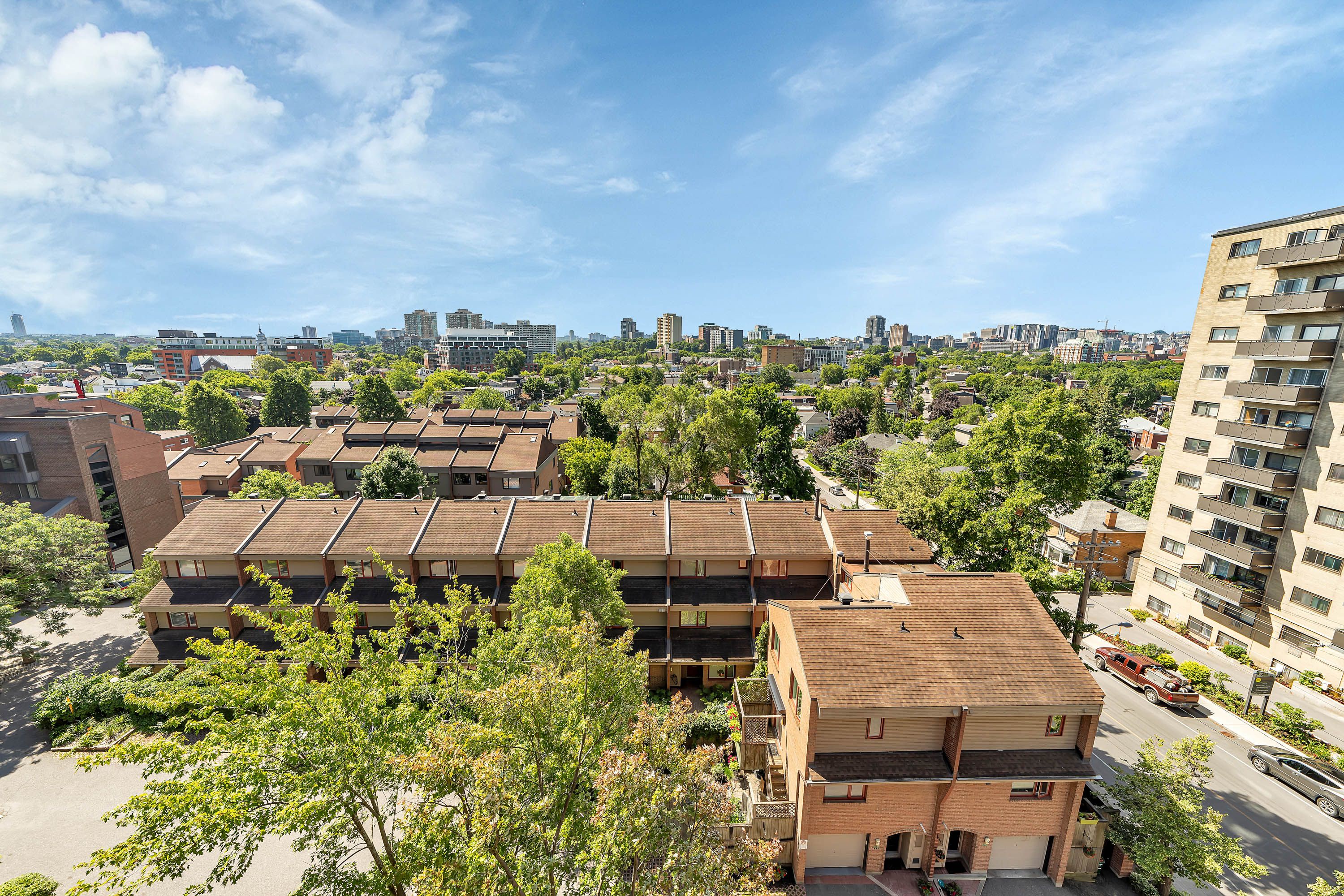 Immerse yourself in elevated living within this fully renovated 1800 sq ft penthouse where 2 BEDROOMS + DEN, 2 full baths, and a PRIVATE ROOF TOP TERRACE come together in one of Ottawa's most coveted neighbourhoods. This top-floor residence has been meticulously transformed from the studs out, blending expansive spaces, premium finishes, abundant natural light and unobstructed south-west views of the city. A skylit foyer welcomes you into the open-concept living and dining area where a breathtaking wall of windows invites natural light to pour in, framing sunsets over the skyline. At the heart of the space, a striking floor-to-ceiling stone fireplace creates an elegant focal point, while rich hardwood floors enhance the warmth and character throughout. Versatile den/office with its own sweeping views & custom built-ins easily doubles as 3rd bedroom. Kitchen is a chef's delight boasting granite counters, breakfast bar, high-end appliances, pantry & ample cabinetry. Generously sized primary with luxe 3pc ensuite is a serene retreat, 2nd spacious bedroom is served by a stylish main 4-piece bath. In-suite laundry. Upstairs, your private rooftop terrace awaits, an entertainer's dream with panoramic city views and a retractable awning, perfect for sunset cocktails or morning coffee in the fresh air. Tandem indoor parking for two cars and a storage locker complete the package. 100 Rideau Terrace is a well-managed, non-smoking, pet-friendly building perfectly positioned in the heart of Lindenlea. Just steps from the Beechwood Village, you'll enjoy a vibrant mix of boutique shops, acclaimed restaurants, and cozy cafes. The scenic Rideau River and waterfront pathways are only a short stroll away. With only two units per floor, this exclusive penthouse offers unparalleled privacy, exclusivity, and ultimate urban sophistication in one of Ottawa's most sought-after neighbourhoods