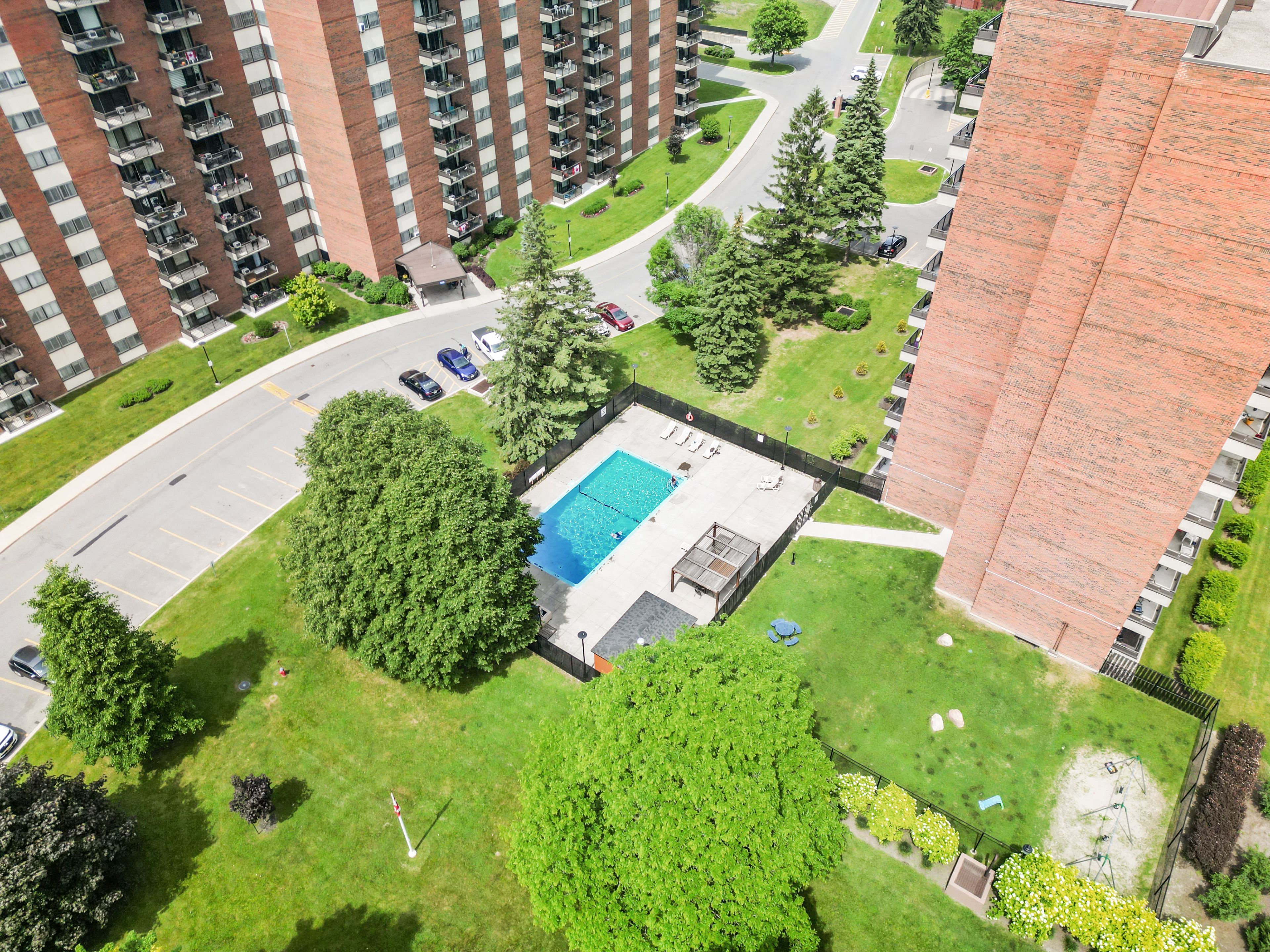 Right-size without compromise! Beautifully bright, renovated 3-bed, 2-bath condo at desirable Manor Square. Enjoy peace of mind with controlled entry and well-lit common areas. Thoughtful layout features an updated kitchen with stainless steel appliances including a dishwasher, tile backsplash, accent lighting, and ample cabinetry. A convenient dining area provides additional storage. Gleaming hardwood floors flow throughout the spacious living/dining area, leading to your private balcony - ideal for fresh air, sunshine, and room for two chairs. Generous primary suite offers a walk-through closet, updated 2-pc ensuite, and an extra egress door inside the closet for added safety. Two additional bedrooms are versatile spaces for guests, office, or hobbies. Comfortably climate-controlled with ductless (mini-split) air conditioning. Pet-friendly (with restrictions). In-unit storage, additional locker, and heated underground parking are included. Exceptional amenities: indoor/outdoor pools, fitness center, sauna, party room, workshop, billiards, and car wash bay. Condo fees cover all utilities (heat, hydro, water), simplifying your budgeting. Walk to shops, restaurants, and transit. Minutes from Algonquin College, College Square, Merivale retail, parks, and Hwy 417. Easy lifestyle, vibrant community, welcome home!
